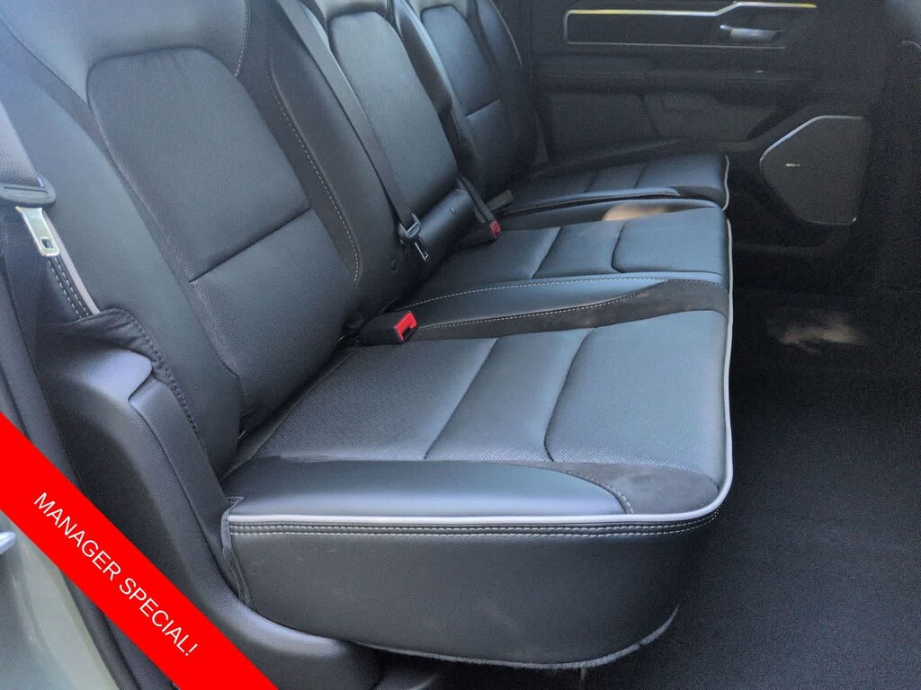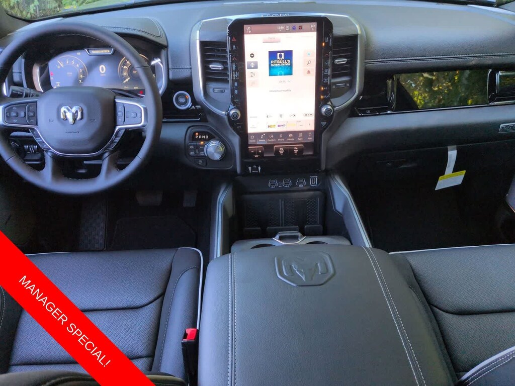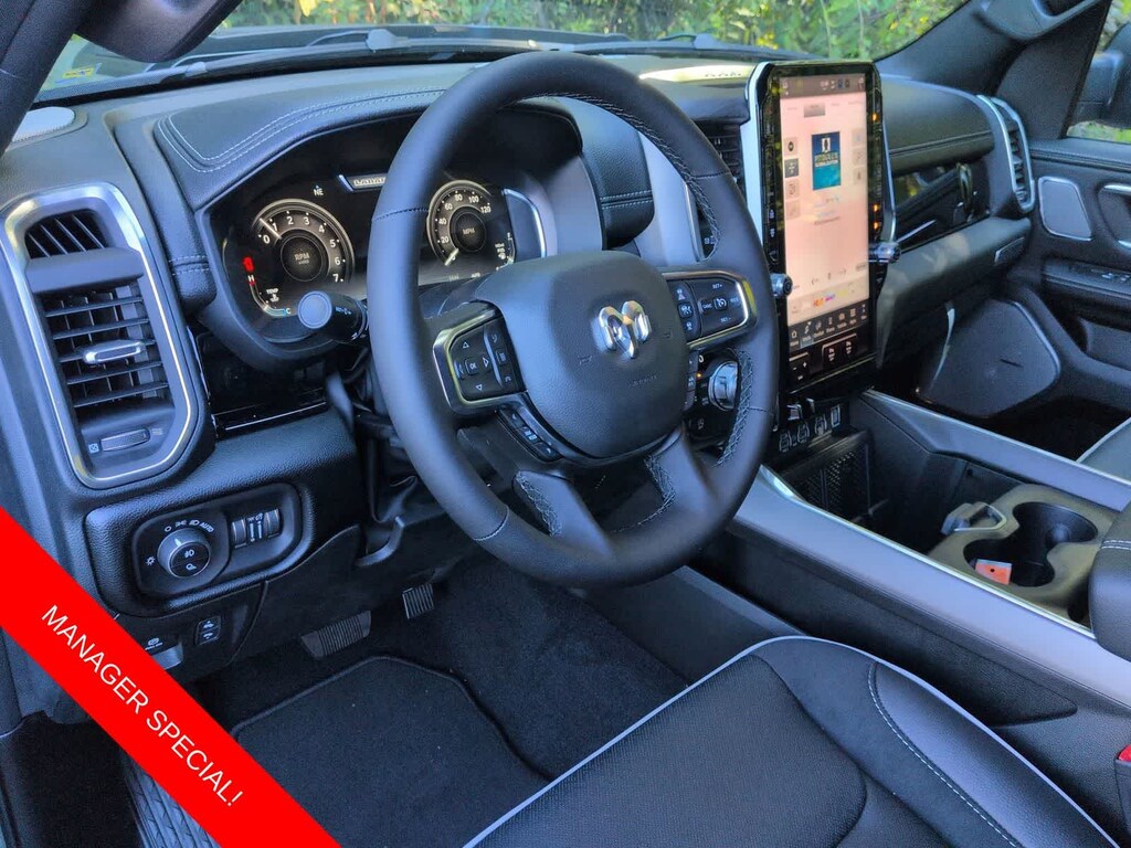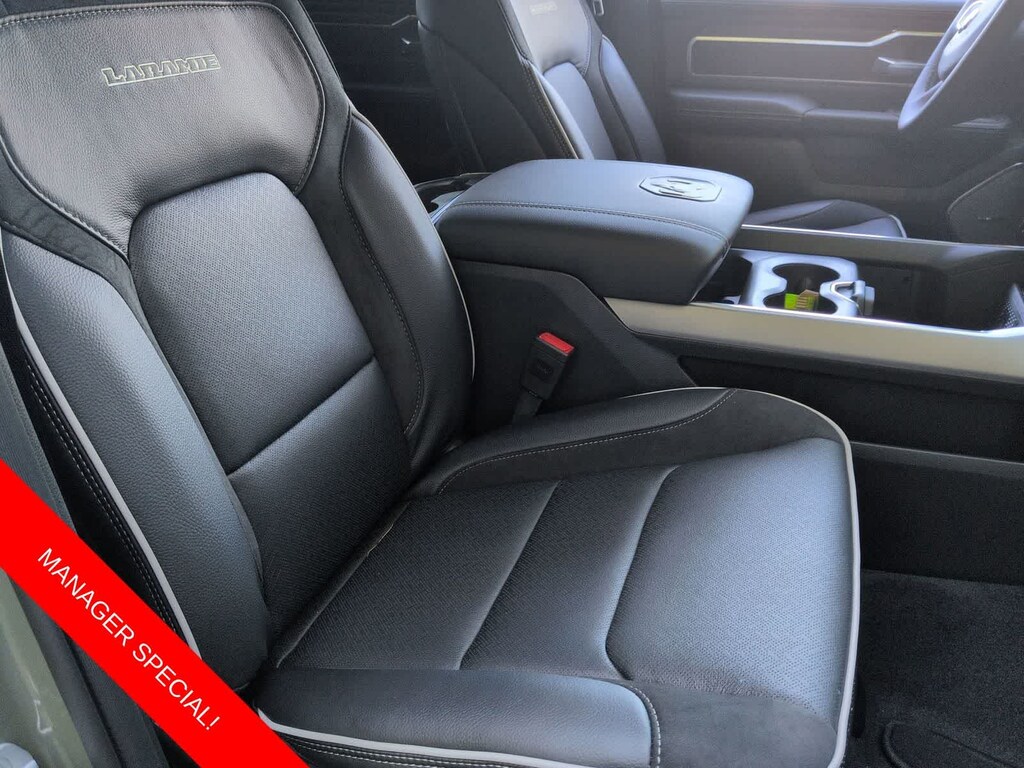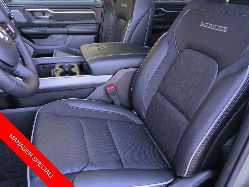 1500 Laramie is nicely equipped with Laramie Level 2 Equipment Group (14.4 Touchscreen Display, 4G LTE Wi-Fi Hot Spot, Cluster 12 TFT Color Display, Connected Travel and Traffic Services, Connectivity - US/Canada, Front Passenger Interactive Display, GPS Navigation, Harman/Kardon 19 Speaker Premium Sound, Integrated Center Stack Radio, Integrated Voice Command with Bluetooth, Power Tailgate, Radio: Uconnect 5 Nav with 14.4 Display, Rain Sensitive Windshield Wipers, SiriusXM Radio Service, SiriusXM with 360L, and USB Host Flip), Night Edition (Accent Color Door Handles, Accent Color Premium Power Mirrors, Accent Color Tailgate Handle, Anti-Spin Differential Rear Axle, Auto Power-Folding Mirrors, Auto-Dimming Exterior Driver Mirror, Black Exterior Truck Badging, Black Headlamp Bezels, Black Interior Accents, Black Painted Exterior Mirrors Caps, Black Tail Lamp Bezels, Body Color Front Bumper, Body Color Rear Bumper with Step Pads, Convex Wide-Angle Exterior Mirror Insert, Dual Exhaust with Black Tips, Exterior Mirrors Approach Lamps, Exterior Mirrors Courtesy Lamps, Exterior Mirrors with Heating Element, Exterior Mirrors with Memory, Exterior Mirrors with Supplemental Signals, Grille Surround 3 Black Texture 2 Black, Pirelli Brand Tires, Proximity Approach/Departure Lamps, RAM Grille Badge - Black, Sport Performance Hood, and Wheels: 22 x 9 Forged Aluminum), Quick Order Package 21H Laramie, 10 Speakers, 3.55 Rear Axle Ratio, 4-Wheel Disc Brakes, ABS brakes, Active Noise Control System, Adjustable pedals, Air Conditioning, Alloy wheels, AM/FM radio: SiriusXM with 360L, Apple CarPlay/Android Auto, Audio memory, Auto High-beam Headlights, Auto-dimming door mirrors, Auto-dimming Rear-View mirror, Automatic temperature control, Brake assist, Bumpers: chrome, Chrome Exterior Mirrors, Compass, Delay-off headlights, Dome Dual LED Reading Lamp, Driver door bin, Driver vanity mirror, Dual front impact airbags, Dual front side impact airbags, Dual-Pane Panoramic Sunroof, Electronic Stability Control, Front anti-roll bar, Front Bucket Seats, Front Center Armrest w/Storage, Front dual zone A/C, Front fog lights, Front reading lights, Front wheel independent suspension, Fully automatic headlights, Garage door transmitter, Heated door mirrors, Heated front seats, Heated rear seats, Heated steering wheel, Illuminated entry, Leather steering wheel, Leather Trimmed Bucket Seats, LED Dome/Reading Lamp, Low tire pressure warning, Memory seat, Navigation System, Occupant sensing airbag, Off-Road Information Pages, Outside temperature display, Overhead airbag, Overhead console, Panic alarm, ParkView Rear Back-Up Camera, Passenger door bin, Passenger vanity mirror, Pedal memory, Power Deployable Running Boards, Power door mirrors, Power driver seat, Power passenger seat, Power steering, Power windows, Radio data system, Radio: Uconnect 5 Navigation with 12.0 Display, RAM Grille Badge - Chrome, Rear anti-roll bar, Rear reading lights, Rear seat center armrest, Rear step bumper, Remote keyless entry, Security system, Speed control, Split folding rear seat, Steering wheel mounted audio controls, Tachometer, Telescoping steering wheel, Tilt steering wheel, Traction control, Trailer Brake Control, Trip computer, Turn signal indicator mirrors, Variably intermittent wipers, Ventilated front seats, Voltmeter, and Wheels: 20 x 9 Premium Paint/Polish.