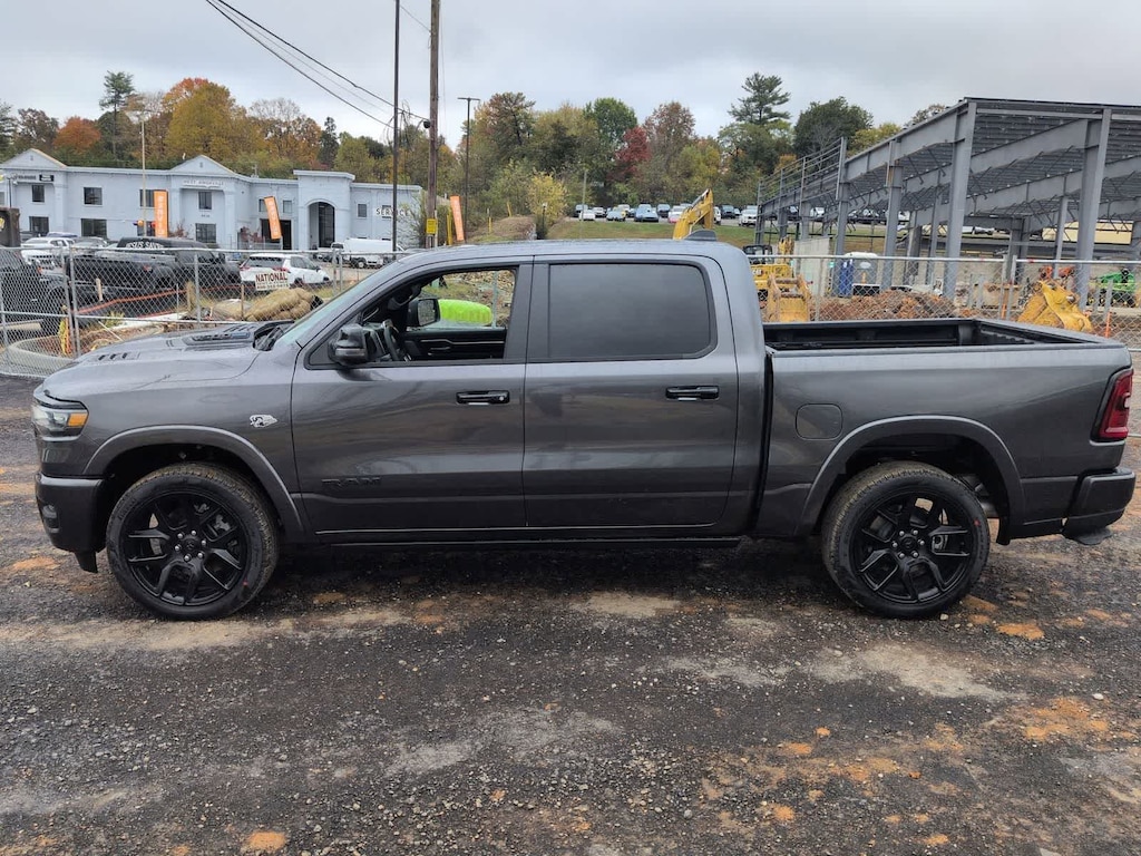 1500 Laramie is nicely equipped with Bed Utility Group (Exterior 115V AC Outlet, MOPAR 4 Adjustable Cargo Tie-Down Hooks, and MOPAR Spray in Bedliner), Laramie Level 2 Equipment Group (14.4 Touchscreen Display, 4G LTE Wi-Fi Hot Spot, Cluster 12 TFT Color Display, Connected Travel and Traffic Services, Connectivity - US/Canada, Front Passenger Interactive Display, GPS Navigation, Harman/Kardon 19 Speaker Premium Sound, Integrated Center Stack Radio, Integrated Voice Command with Bluetooth, Power Tailgate, Radio: Uconnect 5 Nav with 14.4 Display, Rain Sensitive Windshield Wipers, SiriusXM Radio Service, SiriusXM with 360L, and USB Host Flip), Night Edition (Accent Color Door Handles, Accent Color Premium Power Mirrors, Accent Color Tailgate Handle, Anti-Spin Differential Rear Axle, Auto Power-Folding Mirrors, Auto-Dimming Exterior Driver Mirror, Black Exterior Truck Badging, Black Headlamp Bezels, Black Interior Accents, Black Painted Exterior Mirrors Caps, Black Tail Lamp Bezels, Body Color Front Bumper, Body Color Rear Bumper with Step Pads, Convex Wide-Angle Exterior Mirror Insert, Dual Exhaust with Black Tips, Exterior Mirrors Approach Lamps, Exterior Mirrors Courtesy Lamps, Exterior Mirrors with Heating Element, Exterior Mirrors with Memory, Exterior Mirrors with Supplemental Signals, Grille Surround 3 Black Texture 2 Black, Pirelli Brand Tires, Proximity Approach/Departure Lamps, RAM Grille Badge - Black, Sport Performance Hood, and Wheels: 22 x 9 Forged Aluminum), Quick Order Package 27H Laramie, 10 Speakers, 4-Wheel Disc Brakes, ABS brakes, Active Noise Control System, Adjustable pedals, Air Conditioning, Alloy wheels, AM/FM radio: SiriusXM with 360L, Apple CarPlay/Android Auto, Audio memory, Auto High-beam Headlights, Auto-dimming door mirrors, Auto-dimming Rear-View mirror, Automatic temperature control, Brake assist, Bumpers: chrome, Chrome Exterior Mirrors, Compass, Delay-off headlights, Dome Dual LED Reading Lamp, Driver door bin, Driver vanity mirror, Dual front impact airbags, Dual front side impact airbags, Dual-Pane Panoramic Sunroof, Electronic Stability Control, Front anti-roll bar, Front Bucket Seats, Front Center Armrest w/Storage, Front dual zone A/C, Front fog lights, Front reading lights, Front wheel independent suspension, Fully automatic headlights, Garage door transmitter, Heated door mirrors, Heated front seats, Heated rear seats, Heated steering wheel, Illuminated entry, Leather steering wheel, Leather Trimmed Bucket Seats, LED Dome/Reading Lamp, Low tire pressure warning, Memory seat, Navigation System, Occupant sensing airbag, Off-Road Information Pages, Outside temperature display, Overhead airbag, Overhead console, Panic alarm, ParkView Rear Back-Up Camera, Passenger door bin, Passenger vanity mirror, Pedal memory, Power Deployable Running Boards, Power door mirrors, Power driver seat, Power passenger seat, Power steering, Power windows, Radio data system, Radio: Uconnect 5 Navigation with 12.0 Display, RAM Grille Badge - Chrome, Rear anti-roll bar, Rear reading lights, Rear seat center armrest, Rear step bumper, Remote keyless entry, Security system, Speed control, Split folding rear seat, Steering wheel mounted audio controls, Tachometer, Telescoping steering wheel, Tilt steering wheel, Traction control, Trailer Brake Control, Trip computer, Turn signal indicator mirrors, Variably intermittent wipers, V
