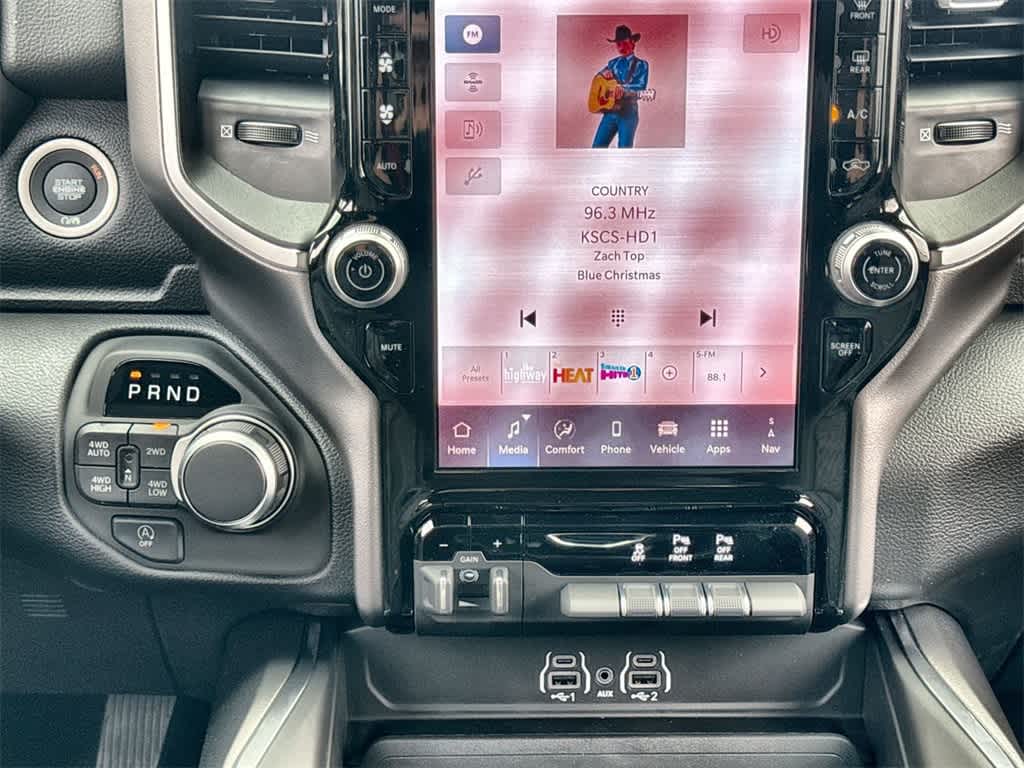 BIG HORN LEVEL 2 EQUIPMENT GROUP SiriusXM Radio Service, Power Adjustable Pedals, Leather Wrapped Steering Wheel, 12 Touchscreen Display, Glove Box Lamp, Auto Power-Folding Mirrors, 115V Auxiliary Rear Power Outlet, Media Hub w/2 Charge Only USBs, Heated Front Seats, Security Alarm, Black Premium Power Mirrors, Premium Overhead Console, 9 Amplified Speakers w/Subwoofer, Disassociated Touchscreen Display, Body Color Fender Flares, Remote Tailgate Release, 115V Auxiliary Power Outlet, LED Dome Lamp w/On/Off Switch, Universal Garage Door Opener, 2nd Row In Floor Storage Bins, Sun Visors w/Illuminated Vanity Mirrors, LED Footwell Lighting, Rear Window Defroster, Rear View Auto Dim Mirror, Rear Power Sliding Window, GPS Navigation, Overhead LED Lamps, Wheels: 20 x 9 Aluminum Chrome Clad, ENGINE: 3.0L I6 HURRICANE SO TWIN TURBO ESS Aux Battery, 700 Amp Maintenance Free Battery, Active Noise Control System, GVWR: 7,100 lbs, 3.55 Rear Axle Ratio, Dual Rear Exhaust w/Bright Tips, Start-Stop Dual Battery System, 230 Amp Alternator, NIGHT EDITION Tires: 275/55R20 OWL All Season, Bridgestone Brand Tires, Accent Color Premium Power Mirrors, Exterior Mirrors w/Supplemental Signals, Black Headlamp Bezels, Exterior Mirrors Courtesy Lamps, Grille Black Surround Black Mesh, Auto Power-Folding Mirrors, Wheels: 20 x 9.0 Aluminum Painted Clad, Auto Dim Exterior Driver Mirror, Black Exterior Truck Badging, Anti-Spin Differential Rear Axle, Accent Color Door Handles, Accent Color Tailgate Handle, Black Interior Accents, Dual Exhaust w/Black Tips, Body Color Front Bumper, Body Color Rear Bumper w/Step Pads, Black Tail Lamp Bezels, RAM Grille Badge - Black, Black Painted Exterior Mirrors Caps, MOPAR BLACK TUBULAR SIDE STEPS, TRANSMISSION: 8-SPEED AUTOMATIC (8HP75).