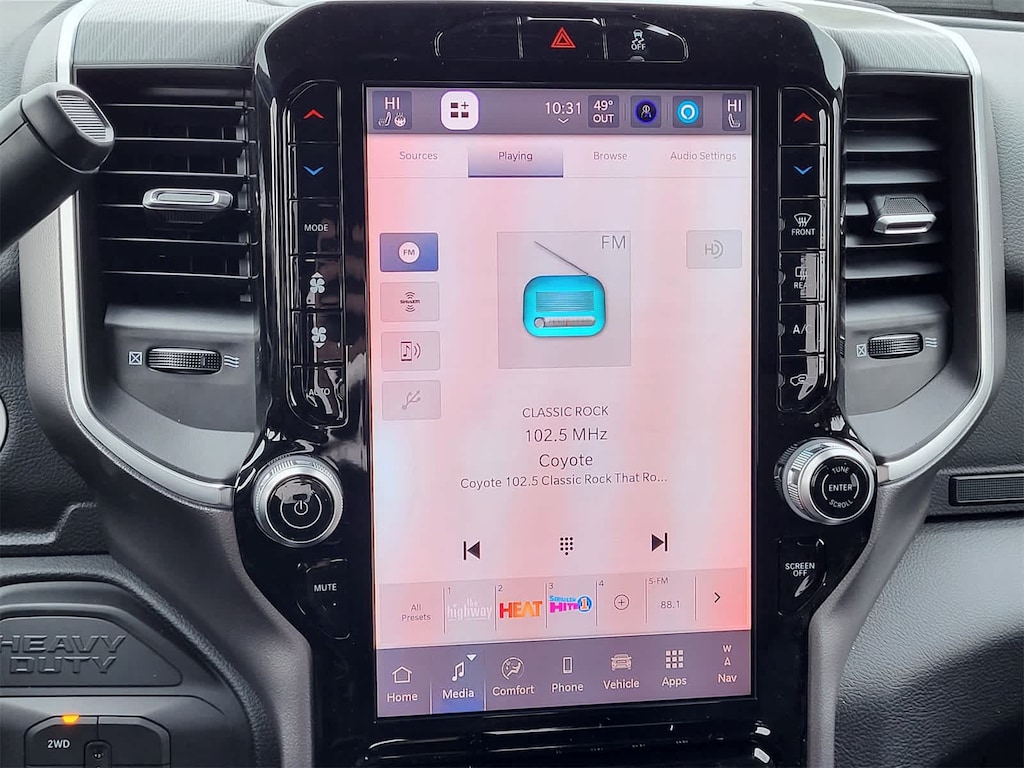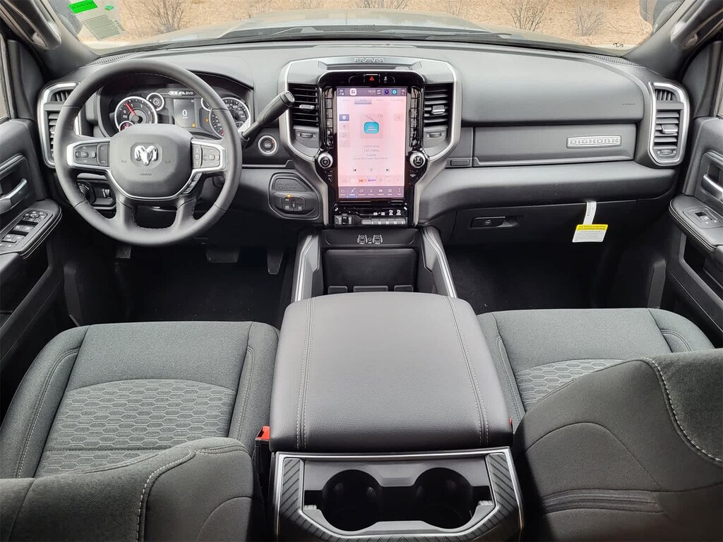 ENGINE: 6.7L I6 CUMMINS HO TURBO DIESEL Selective Catalytic Reduction (Urea), Dual 730 Amp Maintenance Free Batteries, Cummins Turbo Diesel Badge, Heavy Duty Engine Cooling, Diesel Exhaust Brake, Supplemental Heater, 3.42 Axle Ratio, Front Bumper Sight Shields, Capless Fuel Fill w/o Discriminator, GVWR: 11,040 lbs, BIG HORN LEVEL 1 PLUS EQUIPMENT GROUP Emergency Vehicle Alert System (EVAS), 12 Touchscreen Display, Glove Box Lamp, Auto Power-Folding Mirrors, Footwell Courtesy Lamp, Anti-Spin Differential Rear Axle, MOPAR Deployable Bed Step, Alexa Built-In, Forward & Reverse Utility Lights, Locking Lower Glove Box, Remote Start System, 9 Alpine Speakers w/Subwoofer, Disassociated Touchscreen Display, Dual Glove Boxes, 2nd Row In Floor Storage Bins, Rear View Auto Dim Mirror, Rear Dome w/On/Off Switch Lamp, LED Bed Lighting, GPS Navigation, SiriusXM w/360L, Connected Travel & Traffic Services, Foam Bottle Insert (Door Trim Panel), Big Horn IP Badge, Off-Road Info Pages, Trailer Tow Pages, HD Radio, Radio: Uconnect 5 Nav w/12.0 Display, Power Heated Folding Telescopic Mirrors, Steering Wheel Mounted, NIGHT EDITION Gloss Black Nostrils/Mic Black Grille, Tires: LT285/60R20E OWL On/Off Road, Black Exterior Truck Badging, Wheels: 20 x 8.0 Black Painted Aluminum, Body Color Grille-Surround, Black Interior Accents, Black Wheel Center Hub, Painted Front Bumper, Painted Rear Bumper, HEATED SEATS & WHEEL GROUP Heated Steering Wheel, Heated Front Seats, BLACK, PREMIUM CLOTH BUCKET SEATS Bucket Seats, Power Adjust 8-Way Driver Seat, Folding Flat Load Floor Storage, Rear 60/40 Folding Seat, Front Seat Back Map Pockets, Power 2-Way Driver Lumbar Adjust, Full Length Upgraded Floor Console, MOPAR FRONT & REAR RUBBER FLOOR MATS, TRANSMISSION: 8-SPEED TORQUEFLITE HD AUTOMATIC. Ram Big Horn with Forged Blue Metallic exterior and Black interior features a Straight 6 Cylinder Engine with 430 HP at 2800 RPM*.