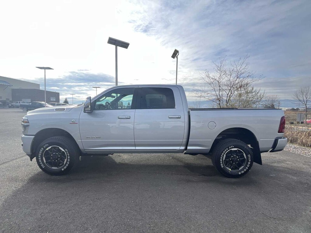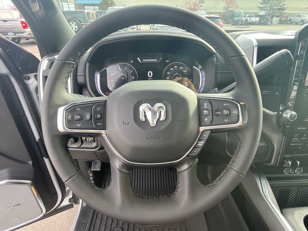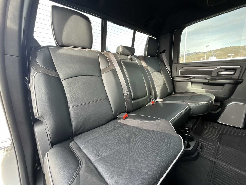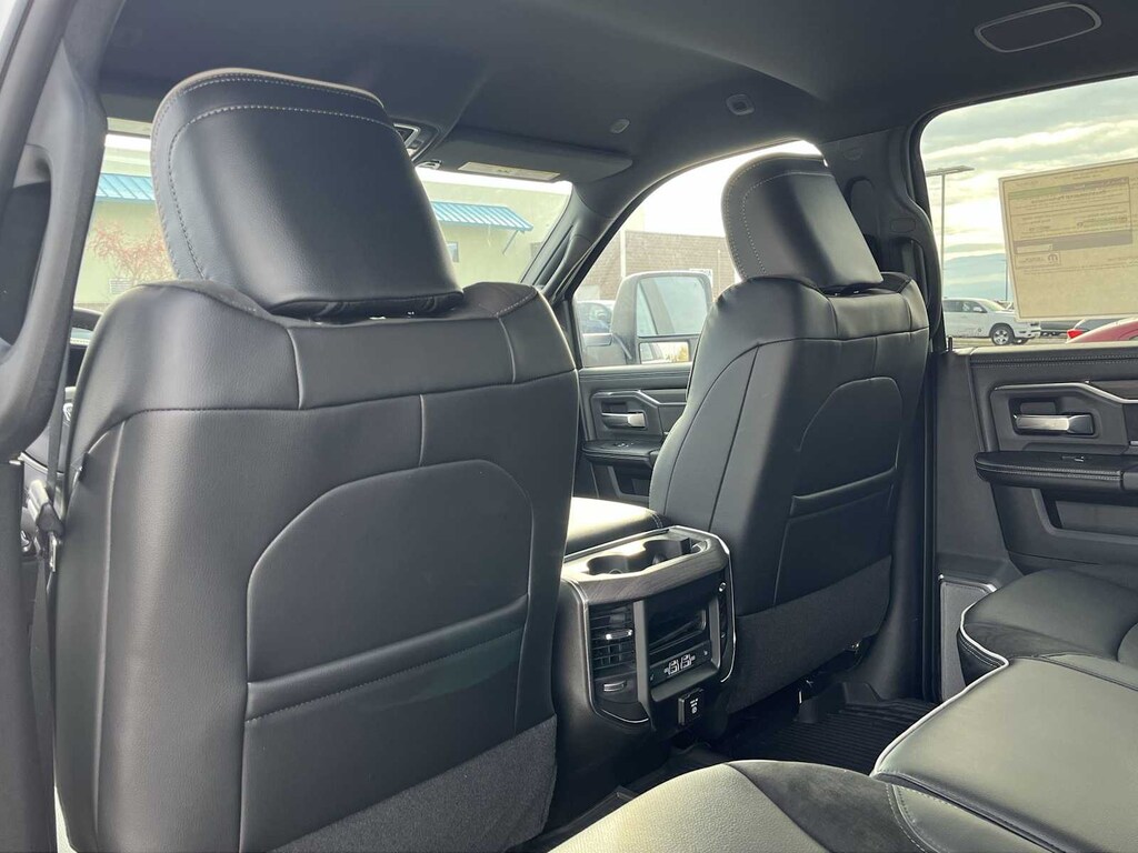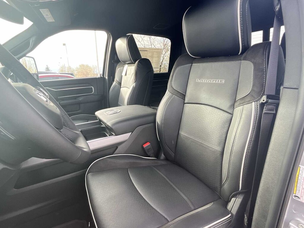 ENGINE: 6.7L I6 CUMMINS HO TURBO DIESEL Selective Catalytic Reduction (Urea), Dual 730 Amp Maintenance Free Batteries, Cummins Turbo Diesel Badge, Heavy Duty Engine Cooling, Diesel Exhaust Brake, Supplemental Heater, 3.42 Axle Ratio, Front Bumper Sight Shields, Capless Fuel Fill w/o Discriminator, GVWR: 11,040 lbs, LARAMIE LEVEL 2 EQUIPMENT GROUP Rain Sensitive Windshield Wipers, Power Adjustable Pedals w/Memory, Auto Dim Exterior Mirror, Anti-Spin Differential Rear Axle, Foam Bottle Insert (Door Trim Panel), 14.4 Touchscreen Display, Power Heated Fold Telescopic Mirrors w/Memory, Radio: Uconnect 5 Nav w/14.4 Display, Remote Tailgate Release, 17 Speaker harman/kardon® Premium Sound, Auto High Beam Headlamp Control, Exterior Mirrors w/Memory, 2nd Row In Floor Storage Bins, Auto Dim Exterior Passenger Mirror, Auto Adjust In Reverse Exterior Mirrors, MOPAR FRONT & REAR RUBBER FLOOR MATS, TRANSMISSION: 8-SPEED TORQUEFLITE HD AUTOMATIC, BLACK, LEATHER TRIMMED BUCKET SEATS Bucket Seats, Dual Wireless Charging Pad, Ventilated Front Seats, Radio/Driver Seat/Mirrors/Pedals Memory, Full Length Upgraded Floor Console. Ram Laramie with Silver Zynith exterior and Black interior features a Straight 6 Cylinder Engine with 430 HP at 2800 RPM*. Approx. Original Base Sticker Price: $84,200*.
