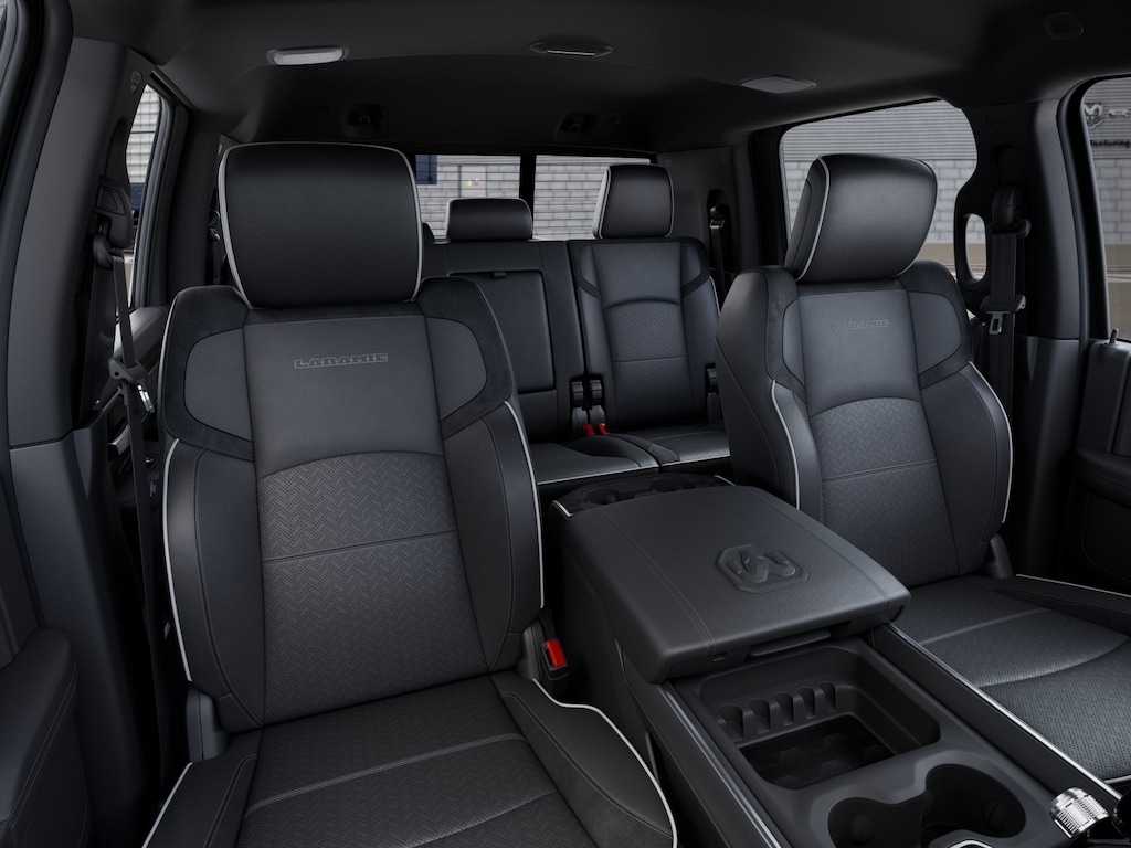 LARAMIE LEVEL 2 PLUS EQUIPMENT GROUP Power Adjustable Pedals w/Memory, Power Deployable Running Boards, Anti-Spin Differential Rear Axle, Drowsy Driver Detection, MOPAR Deployable Bed Step, Active Lane Management System, Remote Tailgate Release, 17 Speaker harman/kardon® Premium Sound, Center Stop Lamp w/Cargo View Camera, Rain Sensitive Windshield Wipers, LED Bed Lighting, Traffic Sign Recognition, Adaptive Steering System, Auto Dim Exterior Mirror, Foam Bottle Insert (Door Trim Panel), 14.4 Touchscreen Display, Power Heated Fold Telescope Mirrors w/Memory, Radio: Uconnect 5 Nav w/14.4 Display, MOPAR Spray In Bedliner, Auto High Beam Headlamp Control, Exterior Mirrors w/Memory, Auto Dim Exterior Passenger Mirror, Auto Adjust In Reverse Exterior Mirrors, NIGHT EDITION Tires: LT285/60R20E OWL On/Off Road, Black Exterior Truck Badging, Wheels: 20 x 8 Black Painted Aluminum, Gloss Black Grille Billets/Accents, Body Color Grille Surround, Sport Performance Hood, MOPAR FRONT & REAR RUBBER FLOOR MATS, TRANSMISSION: 8-SPEED TORQUEFLITE HD AUTOMATIC (STD), ENGINE: 6.7L I6 CUMMINS HO TURBO DIESEL (STD), BLACK, LEATHER TRIMMED BUCKET SEATS Bucket Seats, Dual Wireless Charging Pad, Full Length Upgraded Floor Console. Ram Laramie with Ceramic Gray Clearcoat exterior and Black interior features a Straight 6 Cylinder Engine with 430 HP at 2800 RPM*.
