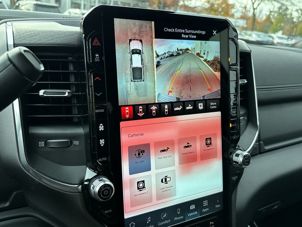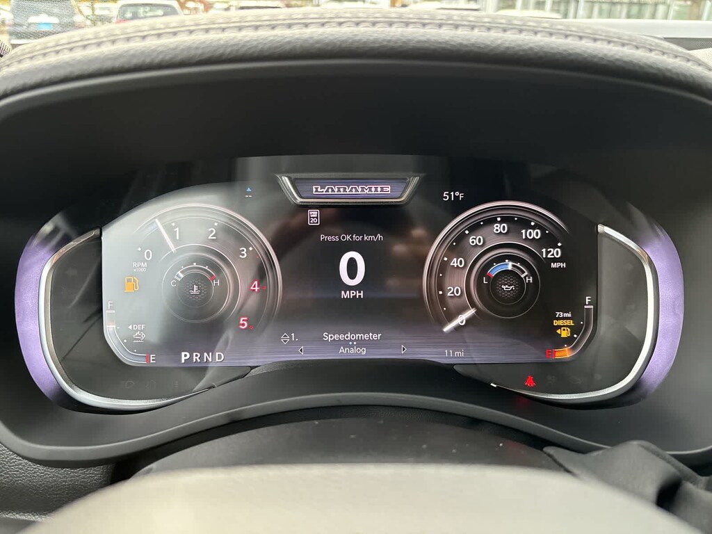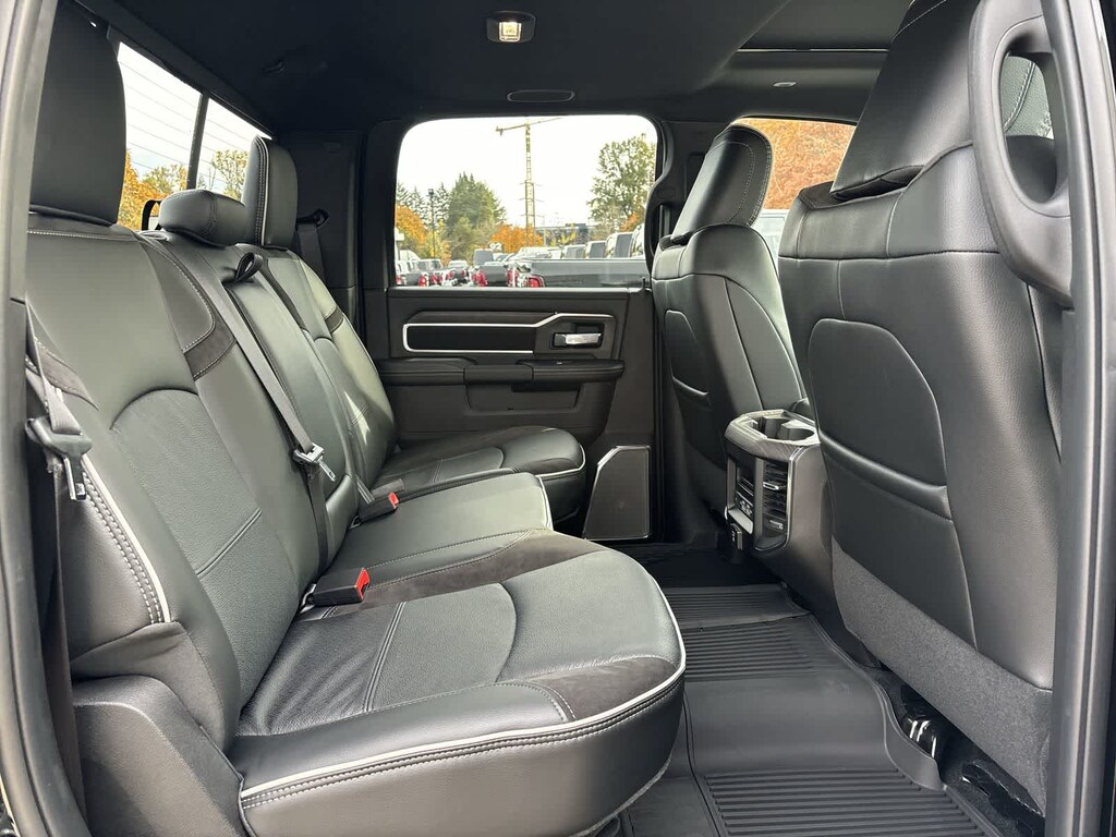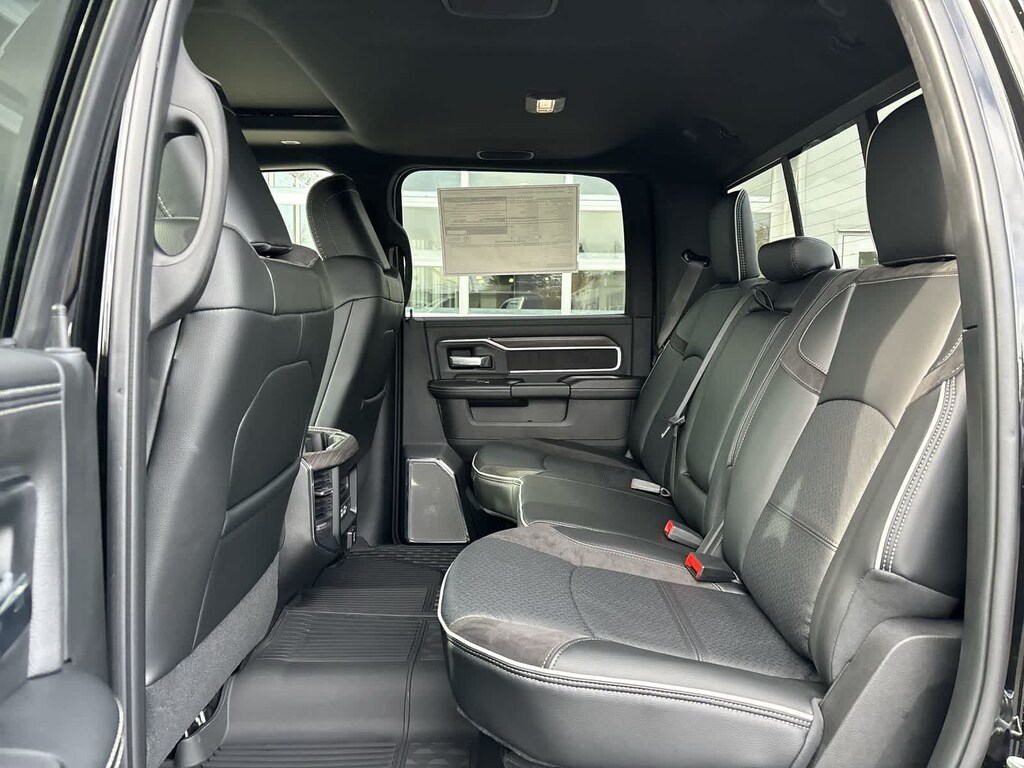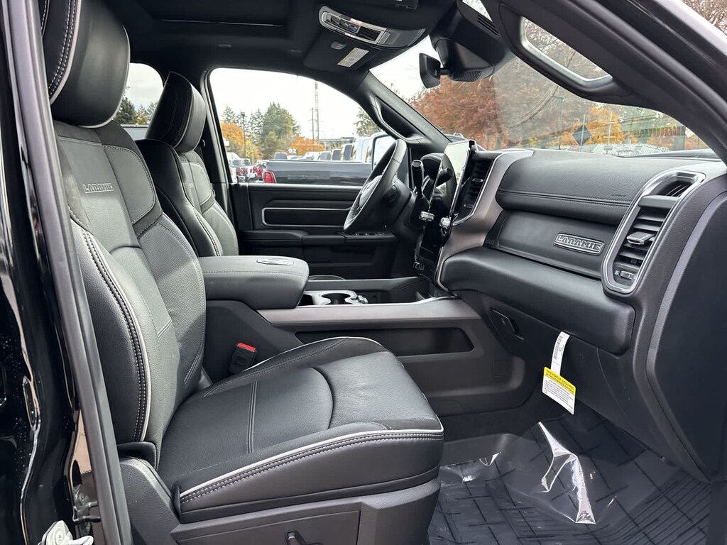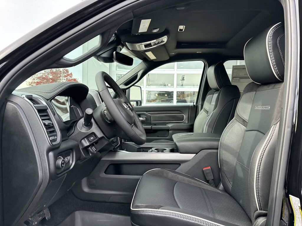 ENGINE: 6.7L I6 CUMMINS HO TURBO DIESEL Selective Catalytic Reduction (Urea), Dual 730 Amp Maintenance Free Batteries, Cummins Turbo Diesel Badge, Heavy Duty Engine Cooling, Diesel Exhaust Brake, Supplemental Heater, 3.42 Axle Ratio, Front Bumper Sight Shields, Capless Fuel Fill w/o Discriminator, GVWR: 11,040 lbs, LARAMIE LEVEL 2 PLUS EQUIPMENT GROUP Power Adjustable Pedals w/Memory, Power Deployable Running Boards, Anti-Spin Differential Rear Axle, Drowsy Driver Detection, MOPAR Deployable Bed Step, Active Lane Management System, Remote Tailgate Release, 17 Speaker harman/kardon® Premium Sound, 2nd Row In Floor Storage Bins, CTR Stop Lamp w/Cargo View Camera, Rain Sensitive Windshield Wipers, LED Bed Lighting, Traffic Sign Recognition, Adaptive Steering System, Auto Dim Exterior Mirror, Foam Bottle Insert (Door Trim Panel), 14.4 Touchscreen Display, Power Heated Fold Telescopic Mirrors w/Memory, Radio: Uconnect 5 Nav w/14.4 Display, MOPAR Spray In Bedliner, Auto High Beam Headlamp Control, Exterior Mirrors w/Memory, Auto Dim Exterior Passenger Mirror, Auto Adjust In Reverse Exterior Mirrors, NIGHT EDITION Tires: LT285/60R20E OWL On/Off Road, Black Exterior Truck Badging, Wheels: 20 x 8.0 Black Painted Aluminum, Gloss Black Grille Billets/Accents, Body Color Grille-Surround, Sport Performance Hood, Black Exterior Mirrors, TOWING TECHNOLOGY GROUP Surround View Camera System, Trailer Tire Pressure Monitoring System, Trailer Reverse Guidance, POWER SUNROOF, MOPAR FRONT & REAR RUBBER FLOOR MATS, TRANSMISSION: 8-SPEED TORQUEFLITE HD AUTOMATIC, BLACK, LEATHER TRIMMED BUCKET SEATS Bucket Seats, Dual Wireless Charging Pad, Ventilated Front Seats, Radio/Driver Seat/Mirrors/Pedals Memory, Full Length Upgraded Floor Console. Ram Laramie with Diamond Black Crystal Pearlcoat exterior and Black interior features a Straight 6 Cylinder Engine with 430 HP at 2800 RPM*.