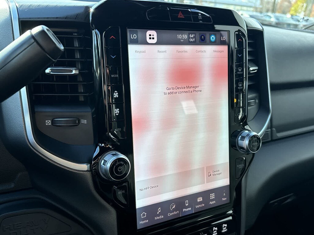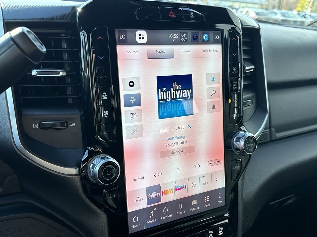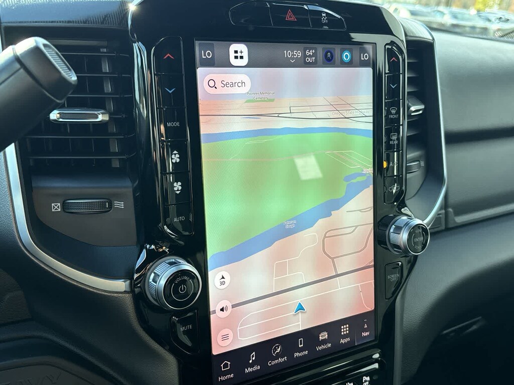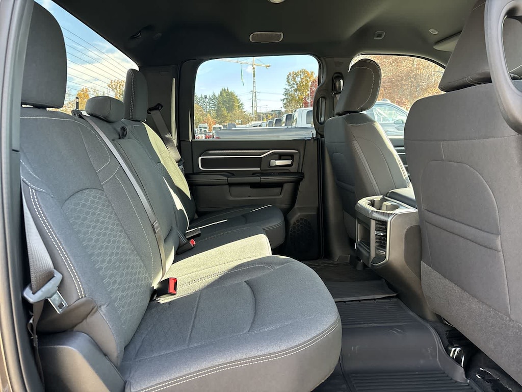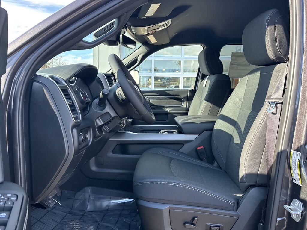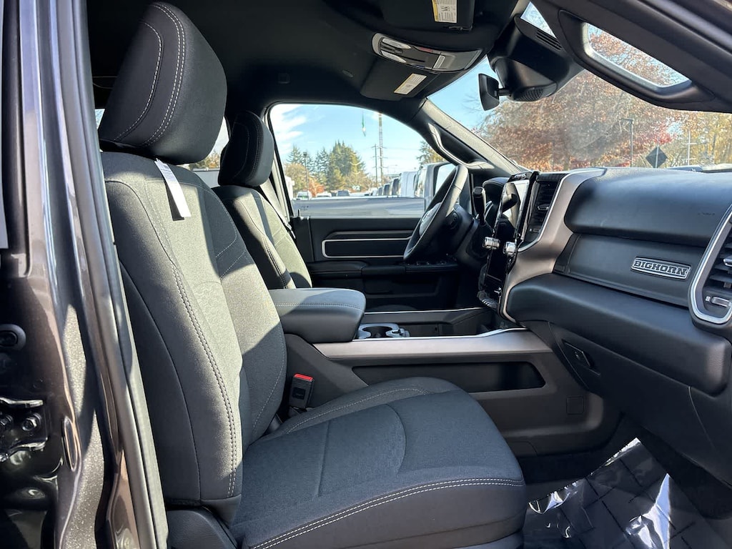 ENGINE: 6.7L I6 CUMMINS HO TURBO DIESEL Selective Catalytic Reduction (Urea), Dual 730 Amp Maintenance Free Batteries, Cummins Turbo Diesel Badge, Heavy Duty Engine Cooling, Diesel Exhaust Brake, Supplemental Heater, 3.42 Axle Ratio, Front Bumper Sight Shields, Capless Fuel Fill w/o Discriminator, GVWR: 11,040 lbs, BIG HORN LEVEL 1 PLUS EQUIPMENT GROUP Emergency Vehicle Alert System (EVAS), 12 Touchscreen Display, Glove Box Lamp, Auto Power-Folding Mirrors, Footwell Courtesy Lamp, Anti-Spin Differential Rear Axle, MOPAR Deployable Bed Step, Alexa Built-In, Forward & Reverse Utility Lights, Locking Lower Glove Box, Remote Start System, 9 Alpine Speakers w/Subwoofer, Disassociated Touchscreen Display, Dual Glove Boxes, 2nd Row In Floor Storage Bins, Rear View Auto Dim Mirror, Rear Dome w/On/Off Switch Lamp, LED Bed Lighting, GPS Navigation, SiriusXM w/360L, Connected Travel & Traffic Services, Foam Bottle Insert (Door Trim Panel), Big Horn IP Badge, Off-Road Info Pages, Trailer Tow Pages, HD Radio, Radio: Uconnect 5 Nav w/12.0 Display, Power Heated Folding Telescopic Mirrors, Steering Wheel Mounted, TOWING TECHNOLOGY GROUP CTR Stop Lamp w/Cargo View Camera, Surround View Camera System, Trailer Tire Pressure Monitoring System, Blind Spot & Cross Path Detection, LED Tail Lamps, Red Tail Lamp Bezels, Trailer Reverse Guidance, NIGHT EDITION Gloss Black Nostrils/Mic Black Grille, Tires: LT285/60R20E OWL On/Off Road, Black Exterior Truck Badging, Wheels: 20 x 8.0 Black Painted Aluminum, Body Color Grille-Surround, Black Interior Accents, Black Wheel Center Hub, Painted Front Bumper, Painted Rear Bumper, PAINTED FLAT WHEEL-TO-WHEEL SIDE STEPS, BLACK, PREMIUM CLOTH BUCKET SEATS Bucket Seats, Power Adjust 8-Way Driver Seat, Folding Flat Load Floor Storage, Rear 60/40 Folding Seat, Front Seat Back Map Pockets, Power 2-Way Driver Lumbar Adjust, Full Length Upgraded Floor Console, MOPAR FRONT & REAR RUBBER FLOOR MATS, TRANSMISSION: 8-SPEED TORQUEFLITE HD AUTOMATIC. Ram Big Horn with Granite Crystal Metallic Clearcoat exterior and Black interior features a Straight 6 Cylinder Engine with 430 HP at 2800 RPM*.