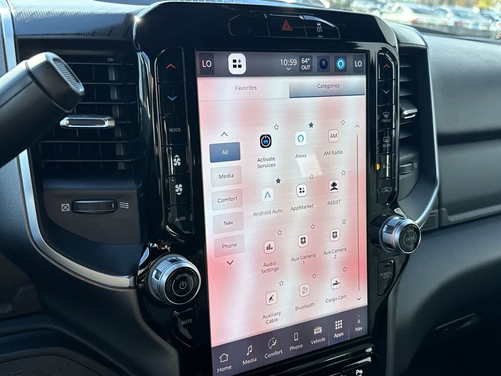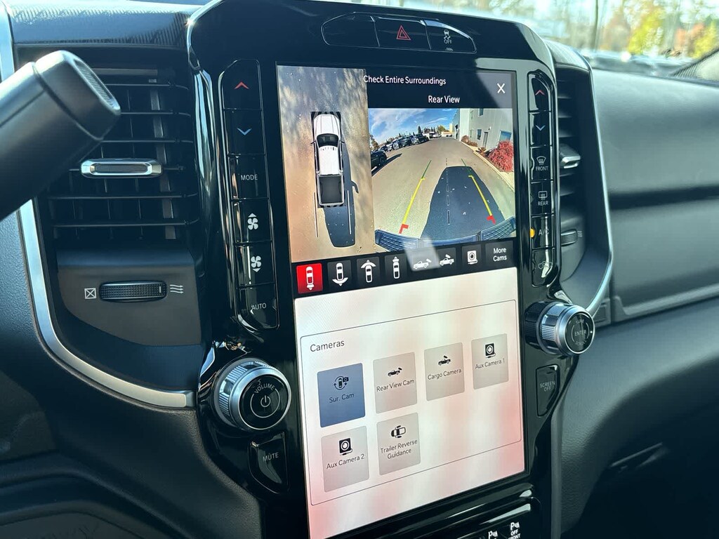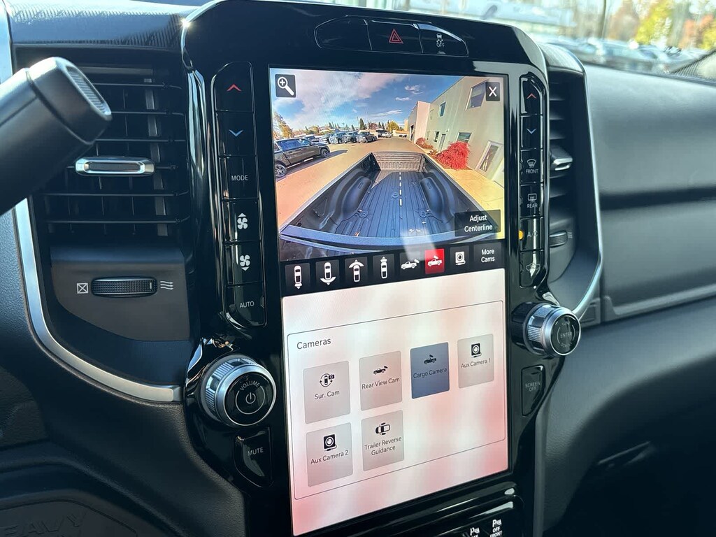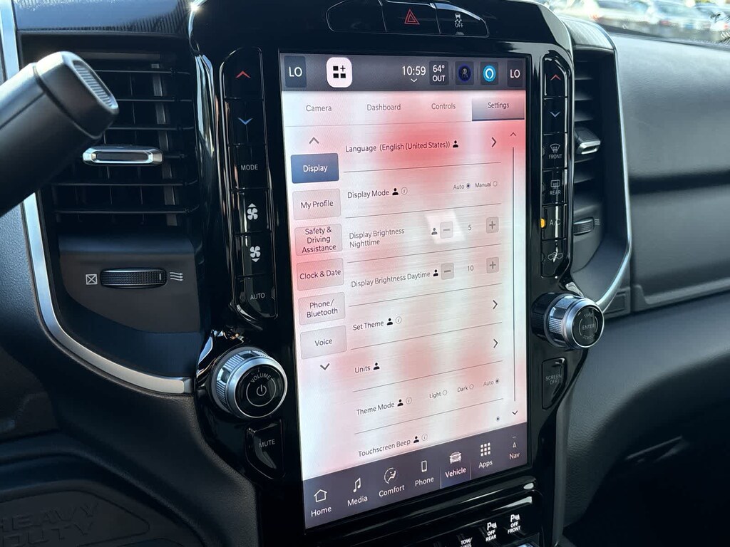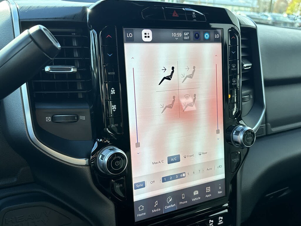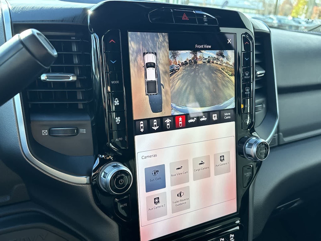 ENGINE: 6.7L I6 CUMMINS HO TURBO DIESEL Selective Catalytic Reduction (Urea), Dual 730 Amp Maintenance Free Batteries, Cummins Turbo Diesel Badge, Heavy Duty Engine Cooling, Diesel Exhaust Brake, Supplemental Heater, 3.42 Axle Ratio, Front Bumper Sight Shields, Capless Fuel Fill w/o Discriminator, GVWR: 11,040 lbs, BIG HORN LEVEL 1 PLUS EQUIPMENT GROUP Emergency Vehicle Alert System (EVAS), 12 Touchscreen Display, Glove Box Lamp, Auto Power-Folding Mirrors, Footwell Courtesy Lamp, Anti-Spin Differential Rear Axle, MOPAR Deployable Bed Step, Alexa Built-In, Forward & Reverse Utility Lights, Locking Lower Glove Box, Remote Start System, 9 Alpine Speakers w/Subwoofer, Disassociated Touchscreen Display, Dual Glove Boxes, 2nd Row In Floor Storage Bins, Rear View Auto Dim Mirror, Rear Dome w/On/Off Switch Lamp, LED Bed Lighting, GPS Navigation, SiriusXM w/360L, Connected Travel & Traffic Services, Foam Bottle Insert (Door Trim Panel), Big Horn IP Badge, Off-Road Info Pages, Trailer Tow Pages, HD Radio, Radio: Uconnect 5 Nav w/12.0 Display, Power Heated Folding Telescopic Mirrors, Steering Wheel Mounted, TOWING TECHNOLOGY GROUP CTR Stop Lamp w/Cargo View Camera, Surround View Camera System, Trailer Tire Pressure Monitoring System, Blind Spot & Cross Path Detection, LED Tail Lamps, Red Tail Lamp Bezels, Trailer Reverse Guidance, NIGHT EDITION Gloss Black Nostrils/Mic Black Grille, Tires: LT285/60R20E OWL On/Off Road, Black Exterior Truck Badging, Wheels: 20 x 8.0 Black Painted Aluminum, Body Color Grille-Surround, Black Interior Accents, Black Wheel Center Hub, Painted Front Bumper, Painted Rear Bumper, PAINTED FLAT WHEEL-TO-WHEEL SIDE STEPS, BLACK, PREMIUM CLOTH BUCKET SEATS Bucket Seats, Power Adjust 8-Way Driver Seat, Folding Flat Load Floor Storage, Rear 60/40 Folding Seat, Front Seat Back Map Pockets, Power 2-Way Driver Lumbar Adjust, Full Length Upgraded Floor Console, MOPAR FRONT & REAR RUBBER FLOOR MATS, TRANSMISSION: 8-SPEED TORQUEFLITE HD AUTOMATIC. Ram Big Horn with Granite Crystal Metallic Clearcoat exterior and Black interior features a Straight 6 Cylinder Engine with 430 HP at 2800 RPM*.