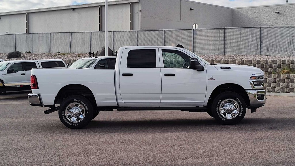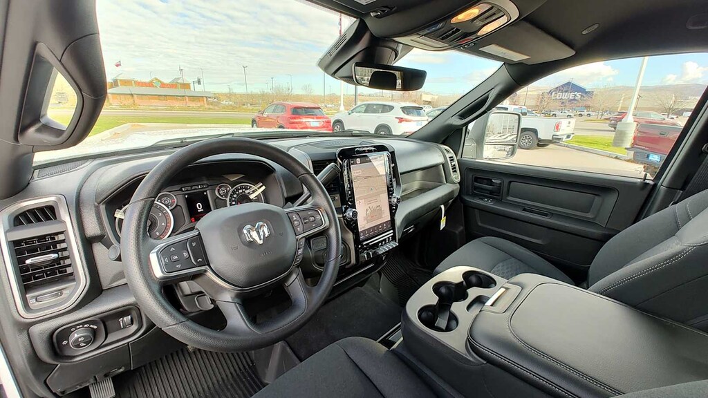 ENGINE: 6.7L I6 CUMMINS HO TURBO DIESEL Selective Catalytic Reduction (Urea), Dual 730 Amp Maintenance Free Batteries, Cummins Turbo Diesel Badge, Heavy Duty Engine Cooling, Diesel Exhaust Brake, Supplemental Heater, 3.42 Axle Ratio, Front Bumper Sight Shields, Capless Fuel Fill w/o Discriminator, GVWR: 11,040 lbs, TRADESMAN LEVEL 2 EQUIPMENT GROUP Convenience Group, Emergency Vehicle Alert System (EVAS), 12 Touchscreen Display, Anti-Spin Differential Rear Axle, Mirror Running Lights, Exterior 115V AC Outlet, Alexa Built-In, Power-Adjustable Convex Aux Mirrors, Disassociated Touchscreen Display, Matte Black Mesh Grille w/Chrome, 115V Auxiliary Front Power Outlet, Center Hub, Tires: LT275/70R18E BSW AS, Rear View Auto Dim Mirror, Rear Power Sliding Window, Tinted Acoustic Windshield Glass, GPS Navigation, Bright Rear Bumper, Exterior Mirrors w/Heating Element, Chrome Grille Surround, MOPAR Black Tubular Side Steps, SiriusXM w/360L, Connected Travel & Traffic Services, Wheels: 18 x 8.0 Steel Chrome Clad, Carpet Floor Covering, Off-Road Info Pages, Trailer Tow Pages, 400W Inverter, HD Radio, Power, BED CONVENIENCE GROUP MOPAR Spray In Bedliner, LED Bed Lighting, TRANSMISSION: 8-SPEED TORQUEFLITE HD AUTOMATIC, BLACK, CLOTH 40/20/40 BENCH SEAT. Ram Tradesman with Bright White Clearcoat exterior and Black interior features a Straight 6 Cylinder Engine with 430 HP at 2800 RPM*. Approx. Original Base Sticker Price: $73,700*.
