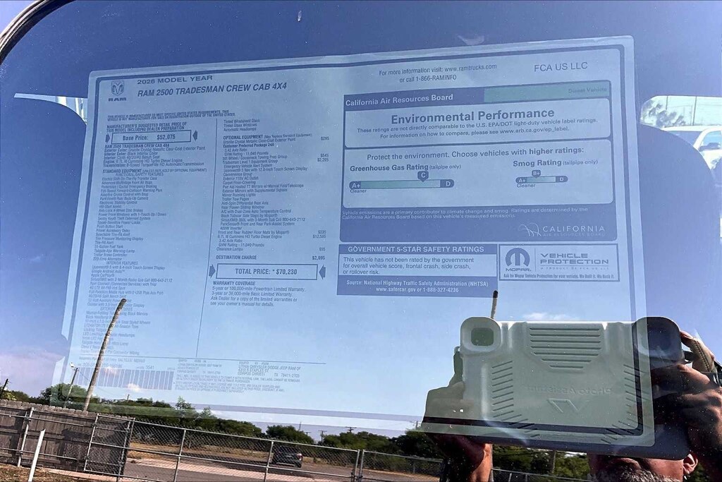 Granite Crystal Metallic Clearcoat 2026 Ram 2500 Tradesman 4WD 8-Speed Automatic 6.7L I6 FRESH OIL CHANGE, 115-Volt Auxiliary Front Power Outlet, 12 Touchscreen Display, 2 Way Rear Headrest Seat, 4 Way Front Headrests, 4-Wheel Disc Brakes, 40/20/40 Split Bench Seat, 400W Inverter, 4G LTE Wi-Fi Hot Spot, 5th Wheel/Gooseneck Towing Prep Group, 6 Speakers, ABS brakes, Air Conditioning, Air Conditioning ATC with Dual Zone Control, Alexa Built-in, AM/FM radio: SiriusXM, Anti-Spin Differential Rear Axle, Apple CarPlay, Apple CarPlay/Android Auto, Auto-Dimming Rear-View Mirror, Black Exterior Mirrors, Black Wheel Center Hub, Brake assist, Clearance Lamps, Compass, Connected Travel and Traffic Services, Connectivity - US/Canada, Delay-off headlights, Disassociated Touchscreen Display, Driver door bin, Dual front impact airbags, Dual front side impact airbags, Electronic Stability Control, Emergency Vehicle Alert System (EVAS), Exterior 115V AC Outlet, For Details, Visit DriveUconnect.com, For More Info, Call 800-643-2112, Front anti-roll bar, Front Armrest with Cupholders, Front Center Armrest w/Storage, Front fog lights, Front License Plate Bracket, Front reading lights, Fully automatic headlights, Global Telematics Box Module, Google Android Auto, GPS Antenna Input, GPS Navigation, HD Radio, Illuminated entry, Integrated Voice Command with Bluetooth, Low tire pressure warning, Manual Adjust 4-Way Driver Seat, Manual Adjust 4-Way Front Passenger Seat, Manual Folding Exterior Mirrors, Manual Telescoping Mirrors, Manufacturers Statement of Origin, Mopar Black Tubular Side Steps, MOPAR Front and Rear Rubber Floor Mats, Occupant sensing airbag, Off-Road Info Pages, Outside temperature display, Overhead airbag, Overhead console, Panic alarm, ParkView Rear Back-Up Camera, Passenger door bin, Passenger vanity mirror, Power steering, Power windows, Quick Order Package 24A Tradesman, Radio data system, Radio: Uconnect 5 Navigation with 12.0 Display, Radio: Uconnect 5 with 8.4 Display, Rear anti-roll bar, Rear Folding Seat, Rear Power Sliding Window, Rear step bumper, Rear window defroster, Remote keyless entry, Remote USB Port - Charge Only, Selectable Tire Fill Alert, SiriusXM Radio Service, SiriusXM with 360L, Speed control, Storage Tray, Tachometer, Tilt steering wheel, Tinted Acoustic Windshield Glass, Traction control, Tradesman Level 1 Equipment Group, Trailer Tow Pages, Variably intermittent wipers, Voltmeter, Wheels: 17 x 7.5 Black Steel Styled. Price includes: $1000 - 2026 National Bonus Cash . Exp. 02/02/2026