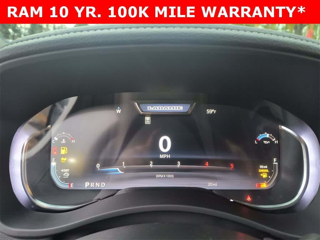 ENGINE: 6.7L I6 CUMMINS HO TURBO DIESEL Selective Catalytic Reduction (Urea), Dual 730 Amp Maintenance Free Batteries, GVWR: 11,800 lb, Cummins Turbo Diesel Badge, Heavy Duty Engine Cooling, Current Generation Engine Controller, Diesel Exhaust Brake, Supplemental Heater, 3.42 Axle Ratio, Front Bumper Sight Shields, Capless Fuel Fill w/o Discriminator, TOWING TECHNOLOGY GROUP CTR Stop Lamp w/Cargo View Camera, Surround View Camera System, Trailer Tire Pressure Monitoring System, Trailer Reverse Guidance, LARAMIE LEVEL 1 PLUS EQUIPMENT GROUP CTR Stop Lamp w/Cargo View Camera, Rain Sensitive Windshield Wipers, Power Adjustable Pedals w/Memory, LED Bed Lighting, Traffic Sign Recognition, Adaptive Steering System, Auto Dimming Exterior Mirrors, Drowsy Driver Detection, MOPAR Deployable Bed Step, Foam Bottle Insert (Door Trim Panel), Active Lane Management System, Power Heat Fold Memory Telescopic Mirrors, MOPAR Spray In Bedliner, Remote Tailgate Release, Auto High Beam Headlamp Control, Exterior Mirrors w/Memory, 2nd Row In Floor Storage Bins, Auto Dimming Exterior Passenger Mirror, Auto Adjust In Reverse Exterior Mirrors, POWER SUNROOF, MOPAR FRONT & REAR RUBBER FLOOR MATS, TRANSMISSION: 8-SPEED TORQUEFLITE HD AUTOMATIC 12.0 Single Rear Wheel Axle, BLACK, LEATHER TRIMMED BUCKET SEATS Bucket Seats, Dual Wireless Charging Pad, Full Length Upgraded Floor Console.
