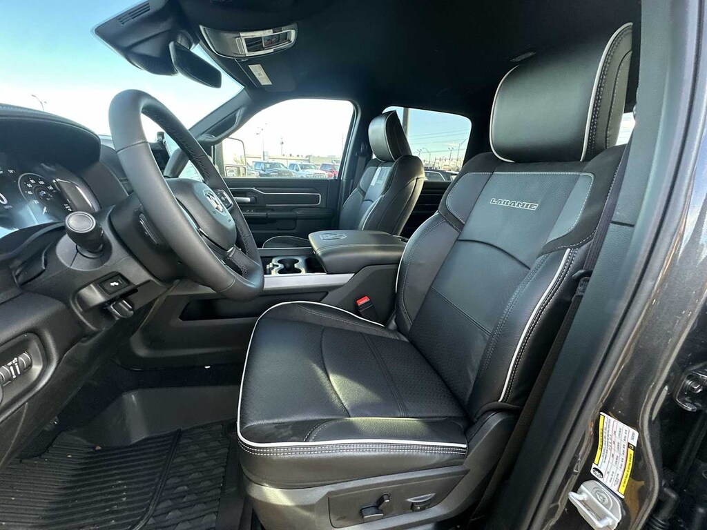 ENGINE: 6.7L I6 CUMMINS HO TURBO DIESEL Selective Catalytic Reduction (Urea), Dual 730 Amp Maintenance Free Batteries, GVWR: 11,800 lb, Cummins Turbo Diesel Badge, Heavy Duty Engine Cooling, Current Generation Engine Controller, Diesel Exhaust Brake, Supplemental Heater, 3.42 Axle Ratio, Front Bumper Sight Shields, Capless Fuel Fill w/o Discriminator, LARAMIE LEVEL 2 EQUIPMENT GROUP Rain Sensitive Windshield Wipers, Power Adjustable Pedals w/Memory, For Details Visit DriveUconnect.com, For More Info, Call 800-643-2112, Auto Dimming Exterior Mirrors, Foam Bottle Insert (Door Trim Panel), 14.4 Touchscreen Display, Power Heat Fold Memory Telescopic Mirrors, Radio: Uconnect 5 Nav w/14.4 Display, Remote Tailgate Release, 17 Speaker harman/kardon® Premium Sound, Auto High Beam Headlamp Control, Exterior Mirrors w/Memory, 2nd Row In Floor Storage Bins, Auto Dimming Exterior Passenger Mirror, Auto Adjust In Reverse Exterior Mirrors, MOPAR FRONT & REAR RUBBER FLOOR MATS, TRANSMISSION: 8-SPEED TORQUEFLITE HD AUTOMATIC 12.0 Single Rear Wheel Axle, BLACK, LEATHER TRIMMED BUCKET SEATS Bucket Seats, Dual Wireless Charging Pad, Full Length Upgraded Floor Console. Ram Laramie with Granite Crystal Metallic Clearcoat exterior and Black interior features a Straight 6 Cylinder Engine with 430 HP at 2800 RPM*. Approx. Original Base Sticker Price: $85,000*.