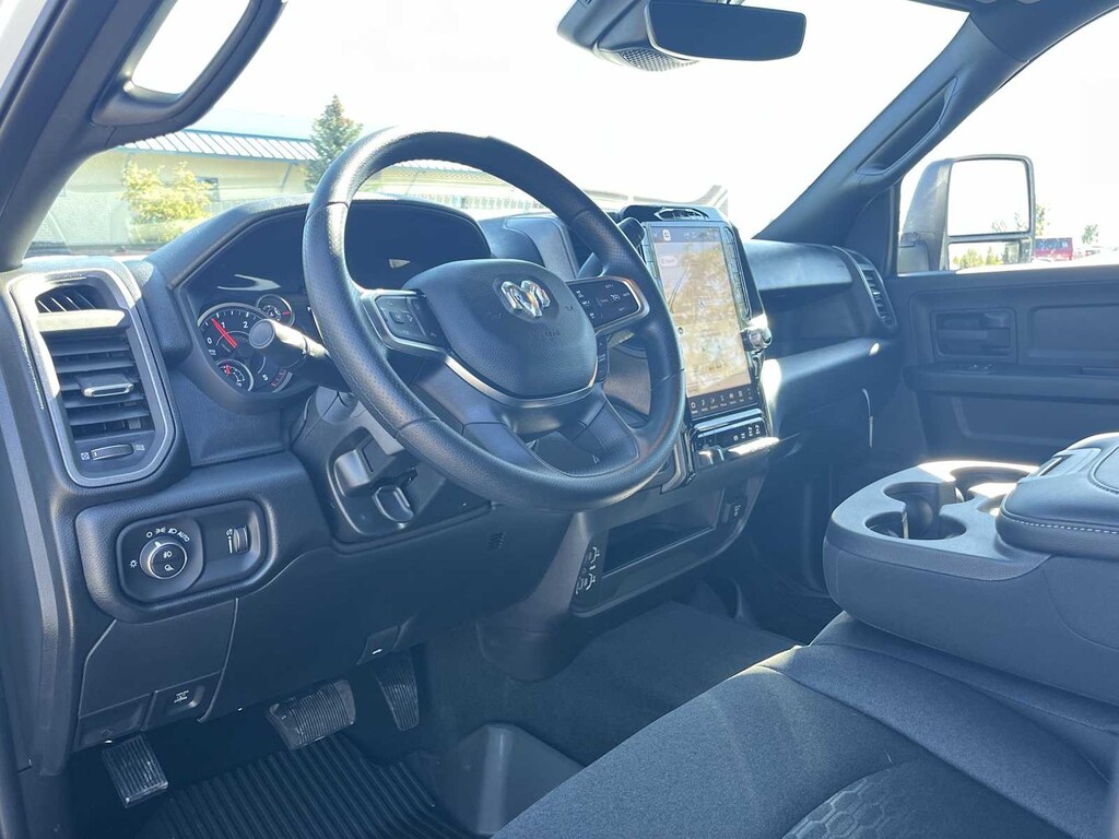 ENGINE: 6.7L I6 CUMMINS HO TURBO DIESEL Selective Catalytic Reduction (Urea), Dual 730 Amp Maintenance Free Batteries, GVWR: 11,800 lb, Cummins Turbo Diesel Badge, Heavy Duty Engine Cooling, Current Generation Engine Controller, Diesel Exhaust Brake, Supplemental Heater, 3.42 Axle Ratio, Front Bumper Sight Shields, Capless Fuel Fill w/o Discriminator, TRADESMAN LEVEL 2A EQUIPMENT GROUP Convenience Group, For Details Visit DriveUconnect.com, For More Info, Call 800-643-2112, Emergency Vehicle Alert System (EVAS), 12 Touchscreen Display, Mirror Running Lights, Exterior 115V AC Outlet, Alexa Built-In, Power-Adjustable Convex Aux Mirrors, Disassociated Touchscreen Display, Matte Black Mesh w/Chrome Grille, 115V Auxiliary Front Power Outlet, Center Hub, Rear View Auto Dim Mirror, Rear Power Sliding Window, Tinted Acoustic Windshield Glass, GPS Navigation, Bright Rear Bumper, Exterior Mirrors w/Heating Element, Chrome Grille Surround, MOPAR Black Tubular Side Steps, SiriusXM w/360L, Connected Travel & Traffic Services, Wheels: 18 x 8.0 Steel Chrome Clad, Carpet Floor Covering, Off-Road Information Pages, Trailer Tow Pages, 400W Inverter, TRANSMISSION: 8-SPEED TORQUEFLITE HD AUTOMATIC 12.0 Single Rear Wheel Axle, BLACK, CLOTH 40/20/40 BENCH SEAT. Ram Tradesman with Bright White Clearcoat exterior and Black interior features a Straight 6 Cylinder Engine with 430 HP at 2800 RPM*. Approx. Original Base Sticker Price: $73,500*.