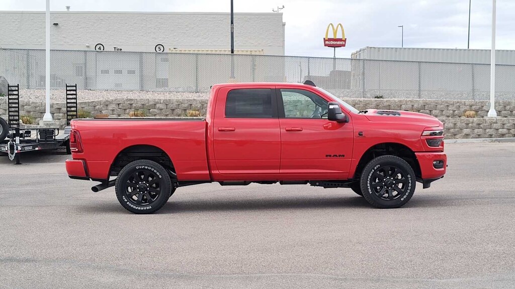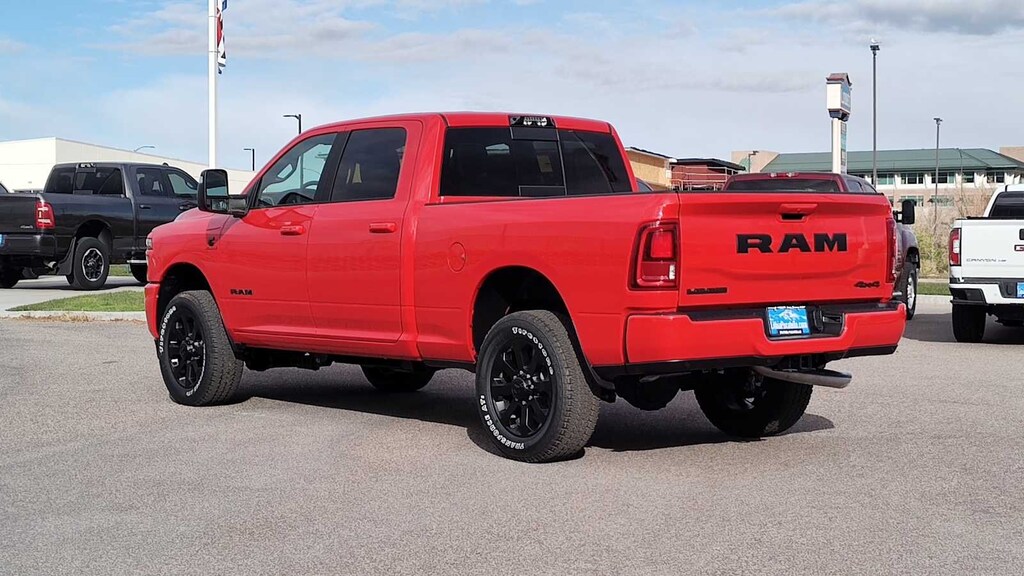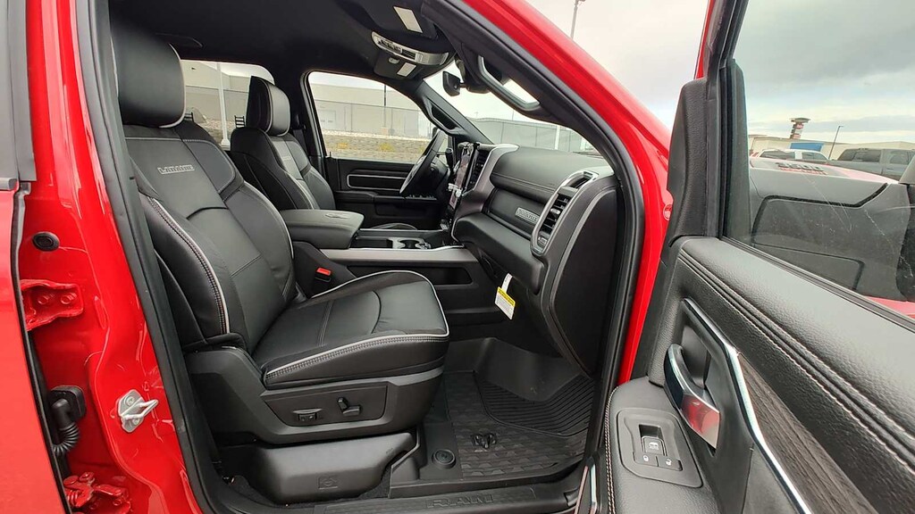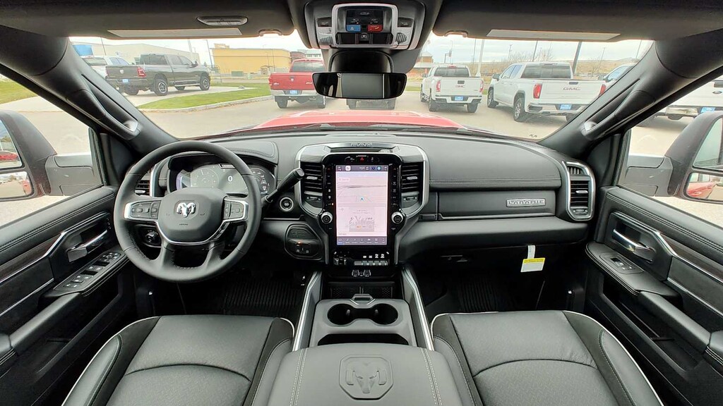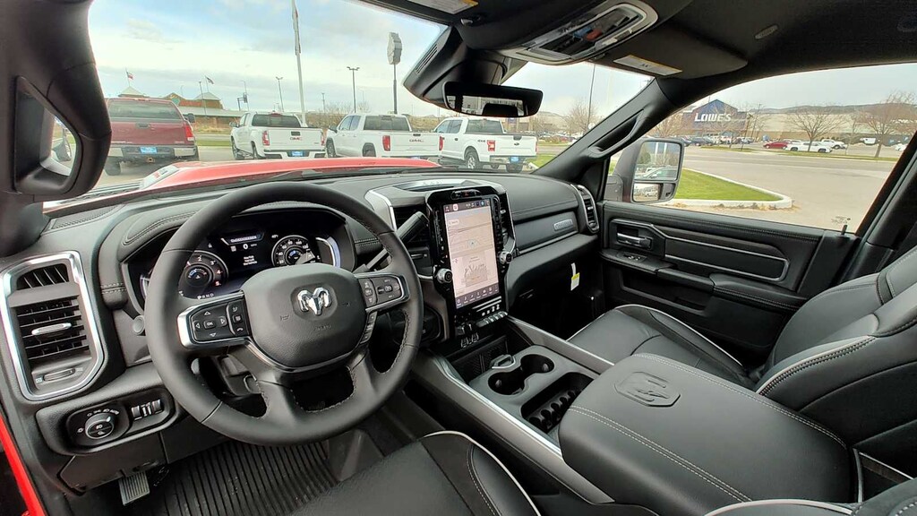 ENGINE: 6.7L I6 CUMMINS HO TURBO DIESEL Selective Catalytic Reduction (Urea), Dual 730 Amp Maintenance Free Batteries, GVWR: 11,800 lb, Cummins Turbo Diesel Badge, Heavy Duty Engine Cooling, Current Generation Engine Controller, Diesel Exhaust Brake, Supplemental Heater, 3.42 Axle Ratio, Front Bumper Sight Shields, Capless Fuel Fill w/o Discriminator, NIGHT EDITION Firestone Brand Tires, Tires: LT285/60R20E OWL On/Off Road, Black Exterior Truck Badging, Wheels: 20 x 8.0 Black Painted Aluminum, Gloss Black Grille Billets/Accents, Body Color Grille Surround, Sport Performance Hood, Black Exterior Mirrors, LARAMIE LEVEL 1 PLUS EQUIPMENT GROUP CTR Stop Lamp w/Cargo View Camera, Rain Sensitive Windshield Wipers, Power Adjustable Pedals w/Memory, LED Bed Lighting, Traffic Sign Recognition, Adaptive Steering System, Auto Dimming Exterior Mirrors, Drowsy Driver Detection, MOPAR Deployable Bed Step, Foam Bottle Insert (Door Trim Panel), Active Lane Management System, Power Heat Fold Memory Telescopic Mirrors, MOPAR Spray In Bedliner, Remote Tailgate Release, Auto High Beam Headlamp Control, Exterior Mirrors w/Memory, 2nd Row In Floor Storage Bins, Auto Dimming Exterior Passenger Mirror, Auto Adjust In Reverse Exterior Mirrors, MOPAR FRONT & REAR RUBBER FLOOR MATS, TRANSMISSION: 8-SPEED TORQUEFLITE HD AUTOMATIC 12.0 Single Rear Wheel Axle, BLACK, LEATHER TRIMMED BUCKET SEATS Bucket Seats, Dual Wireless Charging Pad, Full Length Upgraded Floor Console. Ram Laramie with Flame Red Clearcoat exterior and Black interior features a Straight 6 Cylinder Engine with 430 HP at 2800 RPM*. Approx. Original Base Sticker Price: $87,500*.
