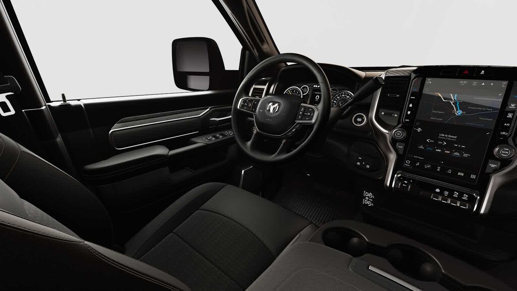 Our Big Horn cabin rewards you with satisfying features engineered for everyday use. Its easy to stay relaxed on the road with supportive cloth seats, a tilt-adjustable steering wheel, air conditioning, power accessories, pushbutton ignition, and keyless entry. Digital convenience comes into the picture with an 8.4-inch touchscreen, a 3.5-inch driver display, Uconnect 5, WiFi compatibility, Apple CarPlay/Android Auto, Bluetooth, voice command, and a six-speaker sound system.
