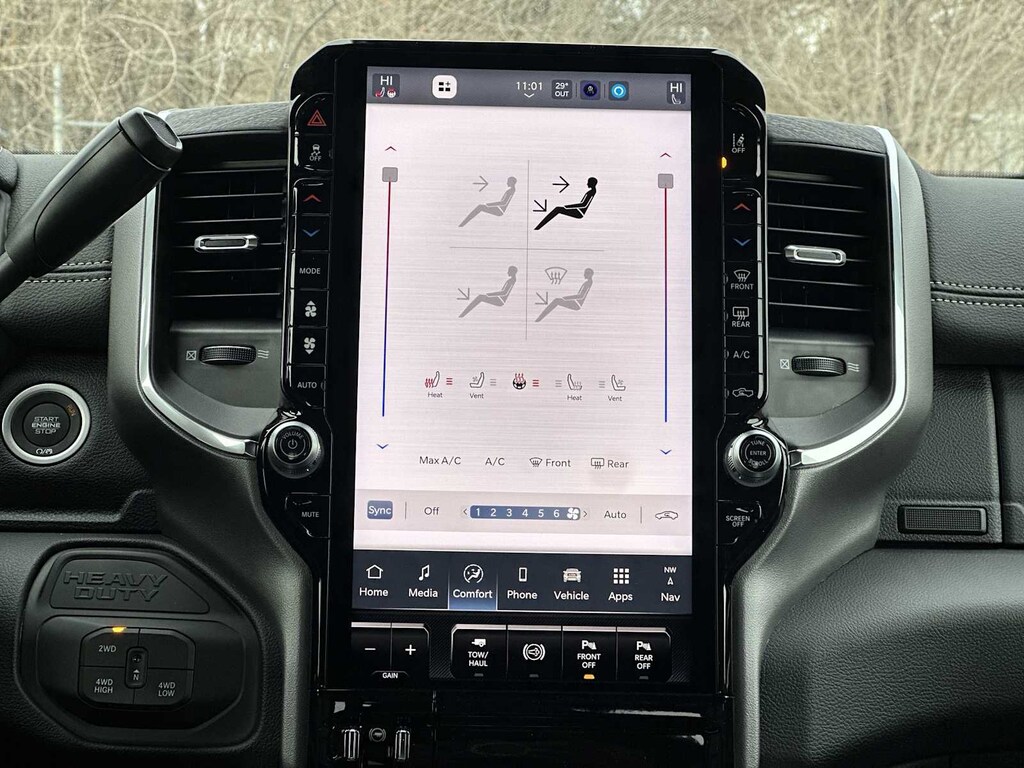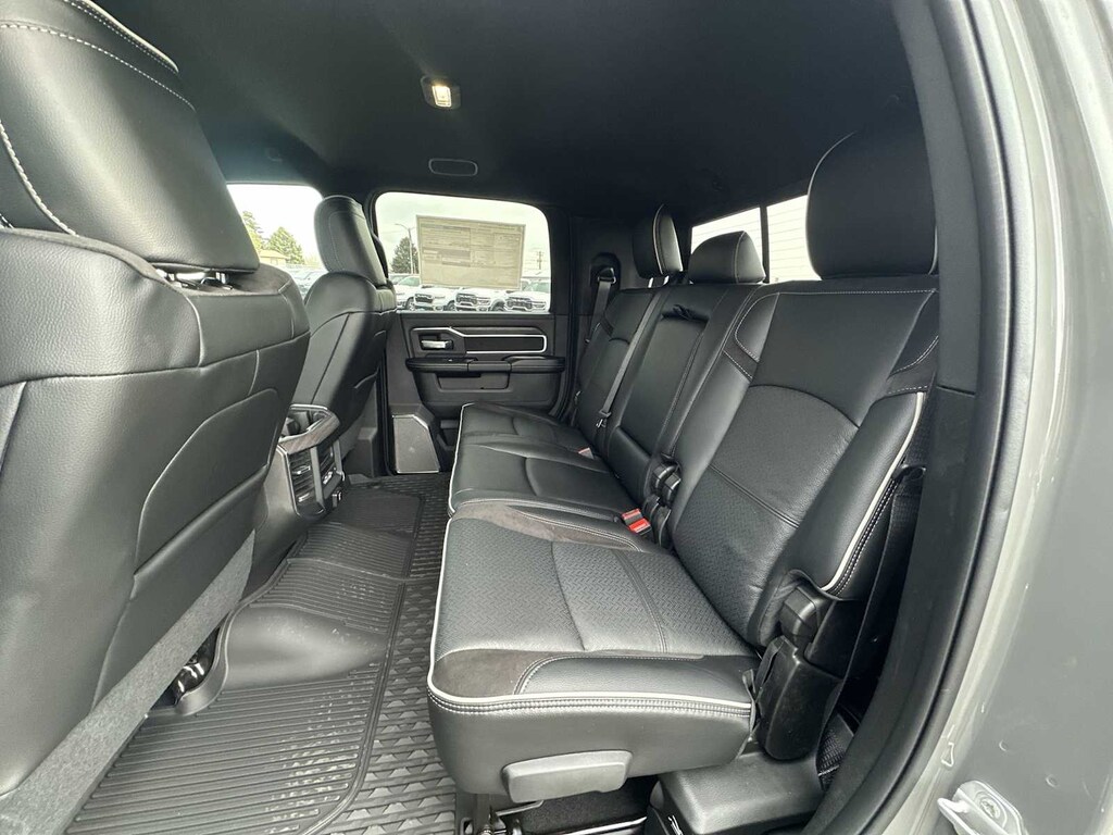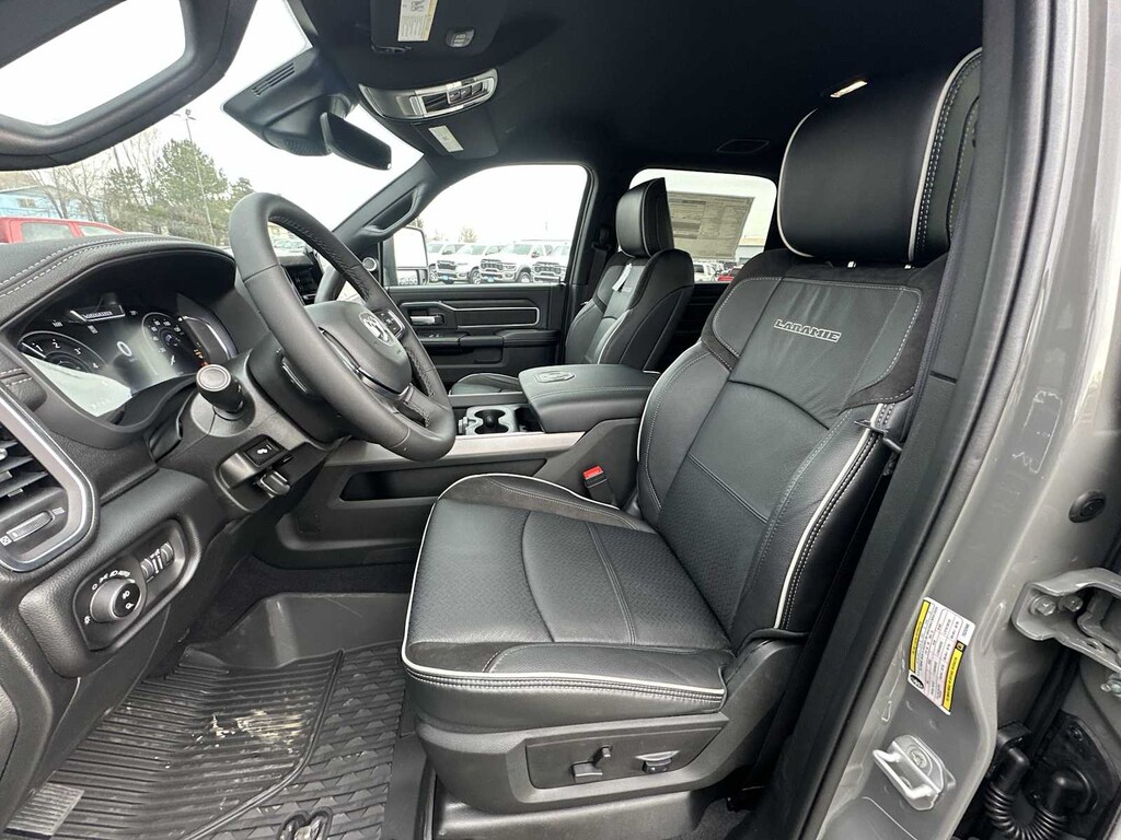 LARAMIE LEVEL 2 PLUS EQUIPMENT GROUP Power Adjustable Pedals w/Memory, Power Deployable Running Boards, Drowsy Driver Detection, MOPAR Deployable Bed Step, Active Lane Management System, Remote Tailgate Release, 17 Speaker harman/kardon® Premium Sound, Center Stop Lamp w/Cargo View Camera, Rain Sensitive Windshield Wipers, LED Bed Lighting, Traffic Sign Recognition, Adaptive Steering System, Auto Dim Exterior Mirror, Foam Bottle Insert (Door Trim Panel), 14.4 Touchscreen Display, Power Heated Folding Telescopic Mirrors w/Memory, Radio: Uconnect 5 Nav w/14.4 Display, MOPAR Spray In Bedliner, Auto High Beam Headlamp Control, Exterior Mirrors w/Memory, Auto Dim Exterior Passenger Mirror, Auto Adjust In Reverse Exterior Mirrors, TOWING TECHNOLOGY GROUP Center Stop Lamp w/Cargo View Camera, Surround View Camera System, Trailer Tire Pressure Monitoring System, Trailer Reverse Guidance, MOPAR FRONT & REAR RUBBER FLOOR MATS, TRANSMISSION: 8-SPEED TORQUEFLITE HD AUTOMATIC (STD), ENGINE: 6.7L I6 CUMMINS HO TURBO DIESEL (STD), BLACK, LEATHER TRIMMED BUCKET SEATS Bucket Seats, Dual Wireless Charging Pad, Ventilated Front Seats, Radio/Driver Seat/Mirrors/Pedals Memory, Full Length Upgraded Floor Console. Ram Laramie with Ceramic Gray Clearcoat exterior and Black interior features a Straight 6 Cylinder Engine with 430 HP at 2800 RPM*. Approx. Original Base Sticker Price: $93,600*.