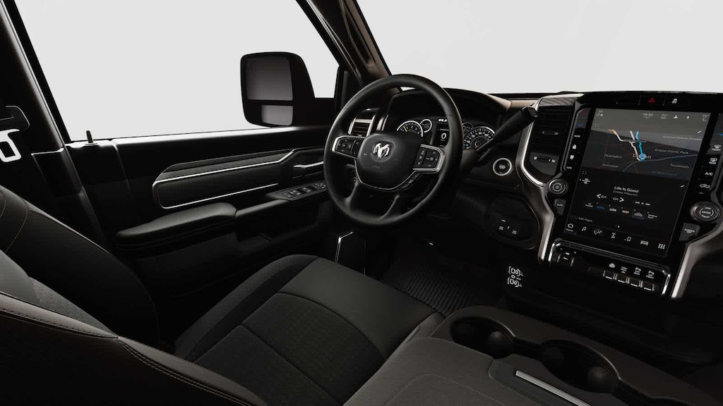 Our Big Horn cabin rewards you with satisfying features engineered for everyday use. Its easy to stay relaxed on the road with supportive heated cloth seats, a tilt-adjustable heated steering wheel, air conditioning, power accessories, pushbutton ignition, and keyless entry. Digital convenience comes into the picture with a 12-inch touchscreen, a 3.5-inch driver display, Uconnect 5, full-color navigation, WiFi compatibility, Apple CarPlay/Android Auto, Bluetooth, voice command, and a six-speaker sound system.