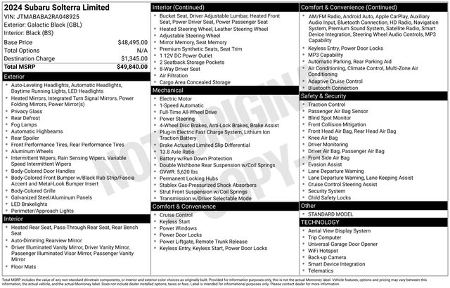 Galactic Black 2024 Subaru Solterra Limited 4D Sport Utility AWD 1-Speed Automatic Electric Motor 111/93 City/Highway MPG