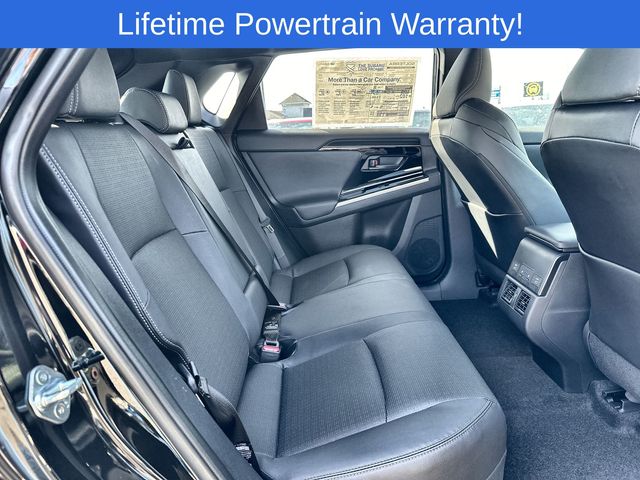 Solterra Limited is nicely equipped with Standard Model, All-Weather Floor Liners, Auto High-beam Headlights, Automatic temperature control, Cargo Tray, Front fog lights, harman/kardon® Speakers, Heated Front Bucket Seats, Heated rear seats, Heated steering wheel, Memory seat, Navigation system: Cloud Navigation System (Subscription required), Power driver seat, Power Liftgate, 11 Speakers, 13.8 Axle Ratio, 4-Wheel Disc Brakes, ABS brakes, Air Conditioning, Alloy wheels, AM/FM radio: SiriusXM, Auto-dimming Rear-View mirror, Brake assist, Bumpers: body-color, Driver door bin, Driver vanity mirror, Dual front impact airbags, Dual front side impact airbags, Electronic Stability Control, Emergency communication system: Subaru Solterra Connect - Safety Connect (1 year trial included), Four wheel independent suspension, Front anti-roll bar, Front Bucket Seats, Front Center Armrest, Front dual zone A/C, Front reading lights, Fully automatic headlights, Garage door transmitter: HomeLink, Heated door mirrors, Heated front seats, Illuminated entry, Knee airbag, Leather steering wheel, Low tire pressure warning, Occupant sensing airbag, Outside temperature display, Overhead airbag, Overhead console, Panic alarm, Passenger door bin, Passenger vanity mirror, Power door mirrors, Power passenger seat, Power steering, Power windows, Radio data system, Radio: Subaru 12.3" Multimedia System, Rain sensing wipers, Rear anti-roll bar, Rear reading lights, Rear seat center armrest, Rear window defroster, Remote keyless entry, Security system, Speed control, Speed-sensing steering, Split folding rear seat, Spoiler, StarTex Upholstery, Steering wheel mounted audio controls, Telescoping steering wheel, Tilt steering wheel, Traction control, Trip computer, Turn signal indicator mirrors, Variably intermittent wipers, and Wheels: 20" x 7.5" J Aluminum-Alloy Gray Finish.