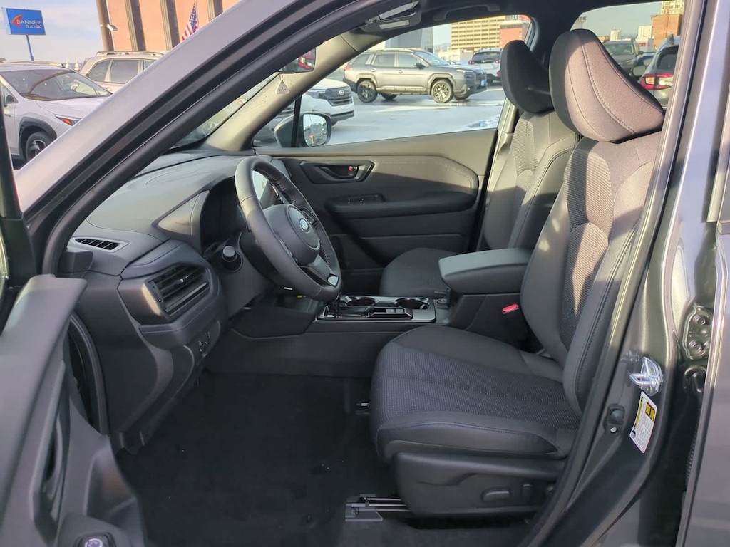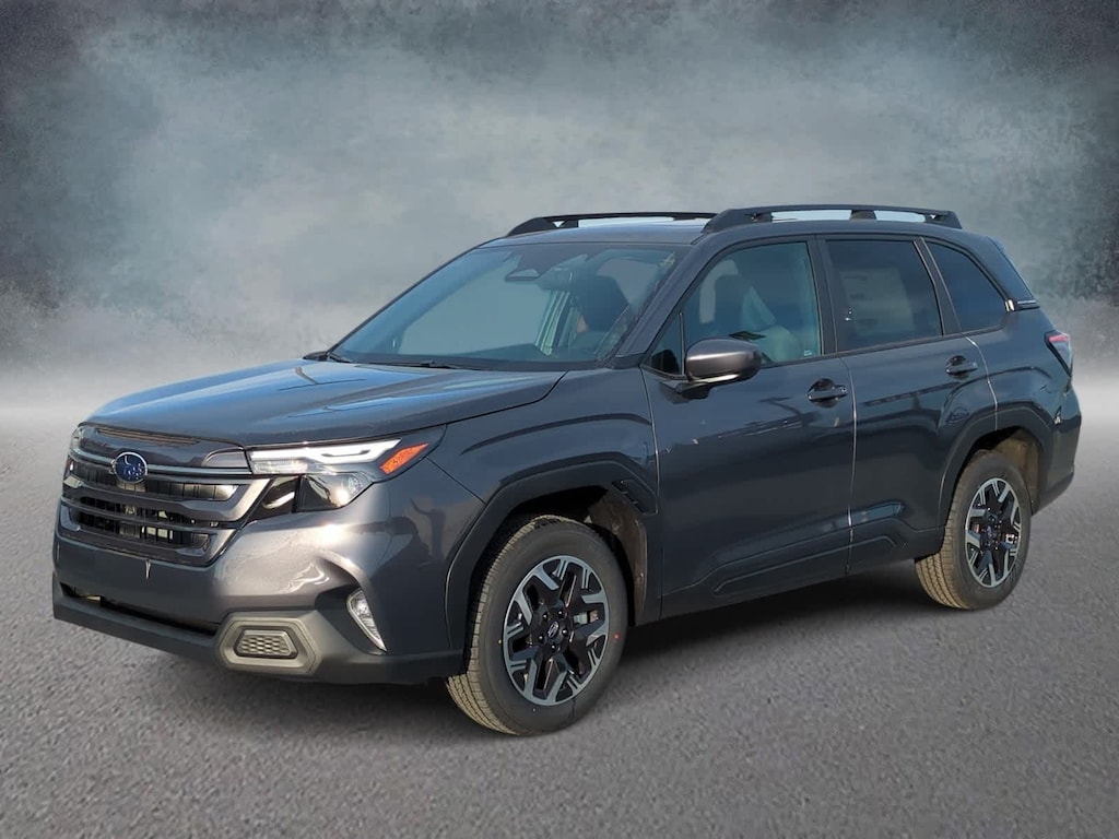 Magnetite Gray Metallic 2026 Subaru Forester Premium AWD Lineartronic CVT 2.5L 4-Cylinder DOHC 16V 4-Wheel Disc Brakes, 6 Speakers, ABS brakes, Air Conditioning, Alloy wheels, AM/FM radio: SiriusXM with 360L, Anti-whiplash front head restraints, Auto High-beam Headlights, Auto-Dimming Exterior Mirror with Approach Light, Auto-Dimming Mirror with Compass and HomeLink, Automatic Emergency Steering, Automatic temperature control, Blind-Spot Detection (BSD)/RCTA System, Brake assist, Bumpers: body-color, Driver door bin, Driver vanity mirror, Dual front impact airbags, Dual front side impact airbags, Electronic Stability Control, Emergency communication system: MySubaru Companion (5-years free), Emergency Lane Keep Assist, Exterior Parking Camera Rear, Four wheel independent suspension, Front anti-roll bar, Front Bucket Seats, Front Center Armrest, Front dual zone A/C, Front fog lights, Front reading lights, Fully automatic headlights, Heated door mirrors, Heated Front Bucket Seats, Heated front seats, Illuminated entry, Knee airbag, Leather steering wheel, Low tire pressure warning, Occupant sensing airbag, Outside temperature display, Overhead airbag, Overhead console, Panic alarm, Passenger door bin, Passenger vanity mirror, Power door mirrors, Power driver seat, Power moonroof: Panoramic, Power Rear Gate, Power Rear Gate and Blind Spot Detection with Rear Cross Traffic Alert, Power steering, Power windows, Premium Textured Cloth Upholstery, Radio data system, Radio: Subaru 11.6 Multimedia Plus System, Rear anti-roll bar, Rear seat center armrest, Rear window defroster, Rear window wiper, Remote keyless entry, Security system, Speed control, Speed-sensing steering, Split folding rear seat, Spoiler, Steering wheel mounted audio controls, Tachometer, Telescoping steering wheel, Tilt steering wheel, Traction control, Trip computer, Variably intermittent wipers, Wheels: 17 x 7.0 J Dark Metallic Aluminum-Alloy.