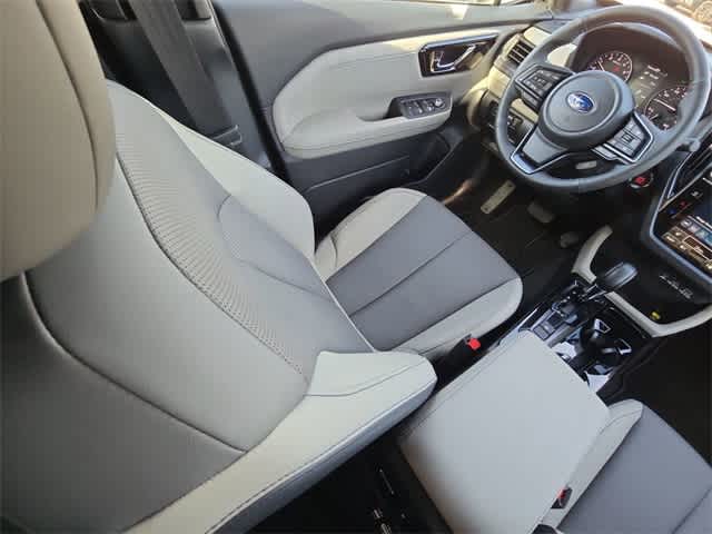 This 2026 Subaru Forester Limited in Crystal White Pearl, features Harman/Kardon Speaker System and Navigation and Reverse Automatic Braking (Radio: Subaru 11.6 Multimedia Navigation System and Reverse Automatic Braking (RAB) System), 4-Wheel Disc Brakes, 6 Speakers, ABS brakes, Air Conditioning, Alloy wheels, AM/FM radio: SiriusXM with 360L, Anti-whiplash front head restraints, Auto High-beam Headlights, Auto-Dimming Mirror with Compass and HomeLink, Automatic temperature control, Brake assist, Bumpers: body-color, Cargo Tray, Center Console Tray, Driver door bin, Driver vanity mirror, Dual front impact airbags, Dual front side impact airbags, Electronic Stability Control, Emergency communication system: MySubaru Companion (5-years free), Exterior Parking Camera Rear, Four wheel independent suspension, Front anti-roll bar, Front Bucket Seats, Front Center Armrest, Front dual zone A/C, Front fog lights, Front reading lights, Fully automatic headlights, Heated door mirrors, Heated Front Bucket Seats, Heated front seats, Heated steering wheel, Illuminated entry, Knee airbag, Leather steering wheel, LED Upgrade, Low tire pressure warning, Occupant sensing airbag, Outside temperature display, Overhead airbag, Overhead console, Panic alarm, Passenger door bin, Passenger vanity mirror, Perforated Leather-Trimmed Upholstery, Power door mirrors, Power driver seat, Power Liftgate, Power moonroof: Panoramic, Power passenger seat, Power steering, Power windows, Radio data system, Radio: Subaru 11.6 Multimedia Plus System, Rain sensing wipers, Rear anti-roll bar, Rear seat center armrest, Rear Seatback Protector, Rear window defroster, Rear window wiper, Remote keyless entry, Security system, Speed control, Speed-sensing steering, Split folding rear seat, Spoiler, Steering wheel mounted audio controls, Tachometer, Telescoping steering wheel, Tilt steering wheel, Traction control, Trip computer, Turn signal indicator mirrors, Variably intermittent wipers, and Wheels: 18 x 7.0 J Dark Metallic Aluminum-Alloy: Limited AWD