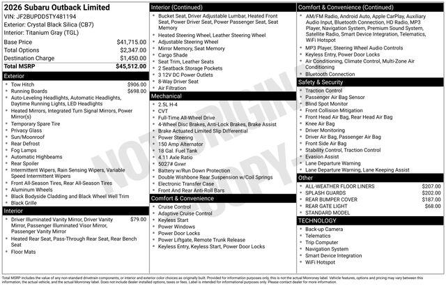 Whether you're seeking a capable adventure companion or a refined daily driver, the 2026 Subaru Outback Limited is the perfect choice. Experience the perfect blend of performance, technology, and style â" all for a list price of $45,016. Visit our showroom today and let us demonstrate why the Outback Limited should be your next vehicle.