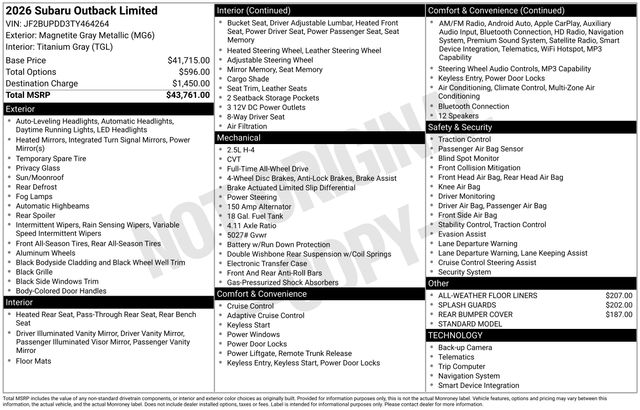 We invite you to experience the 2026 Subaru Outback Limited for yourself. Visit our showroom and let our knowledgeable team guide you through all the features and capabilities that make this SUV a true standout in its class. We're confident that once you take it for a test drive, you'll be captivated by its exceptional performance and uncompromising quality.