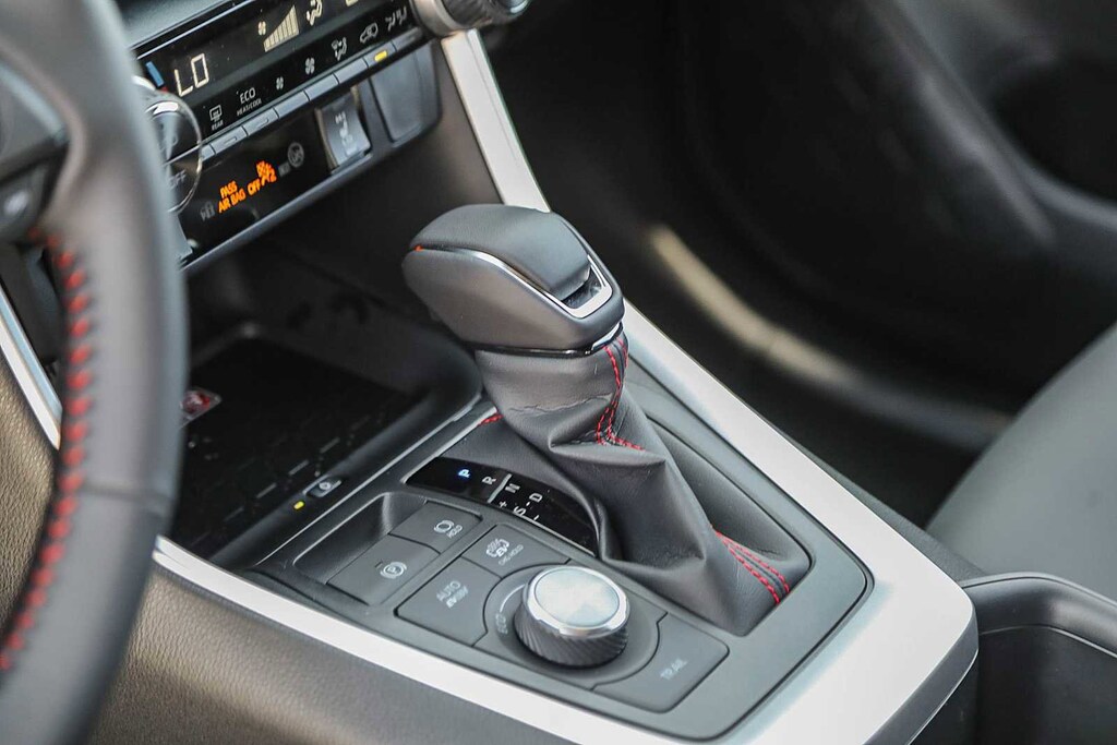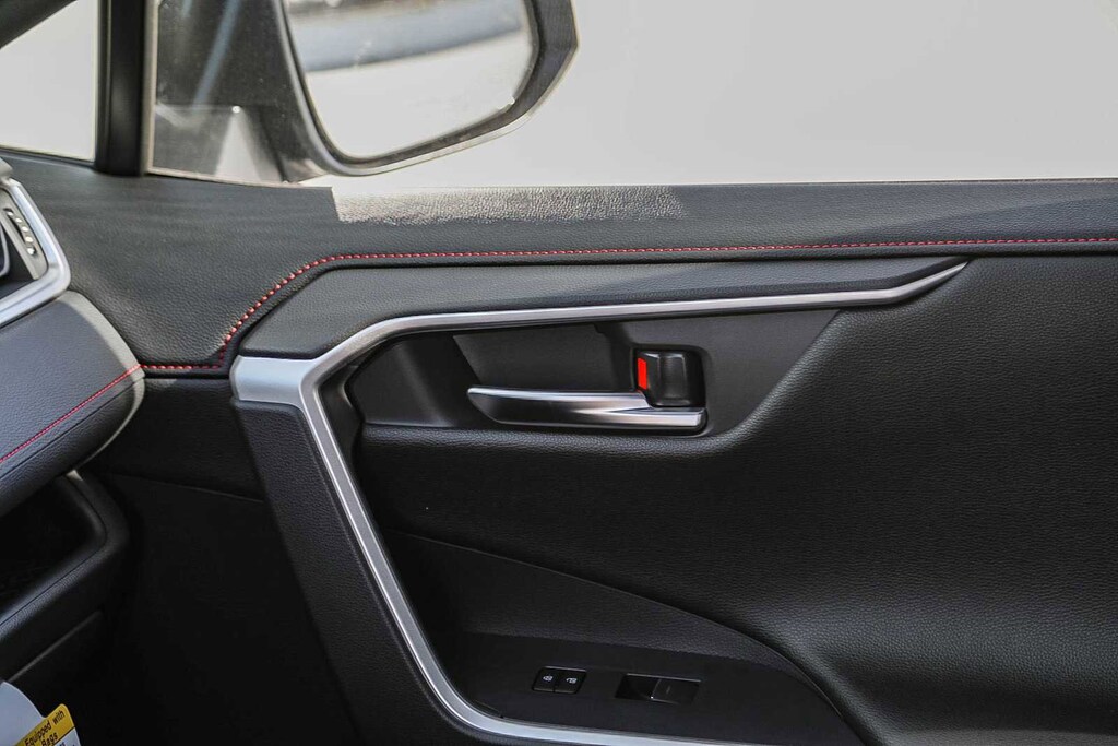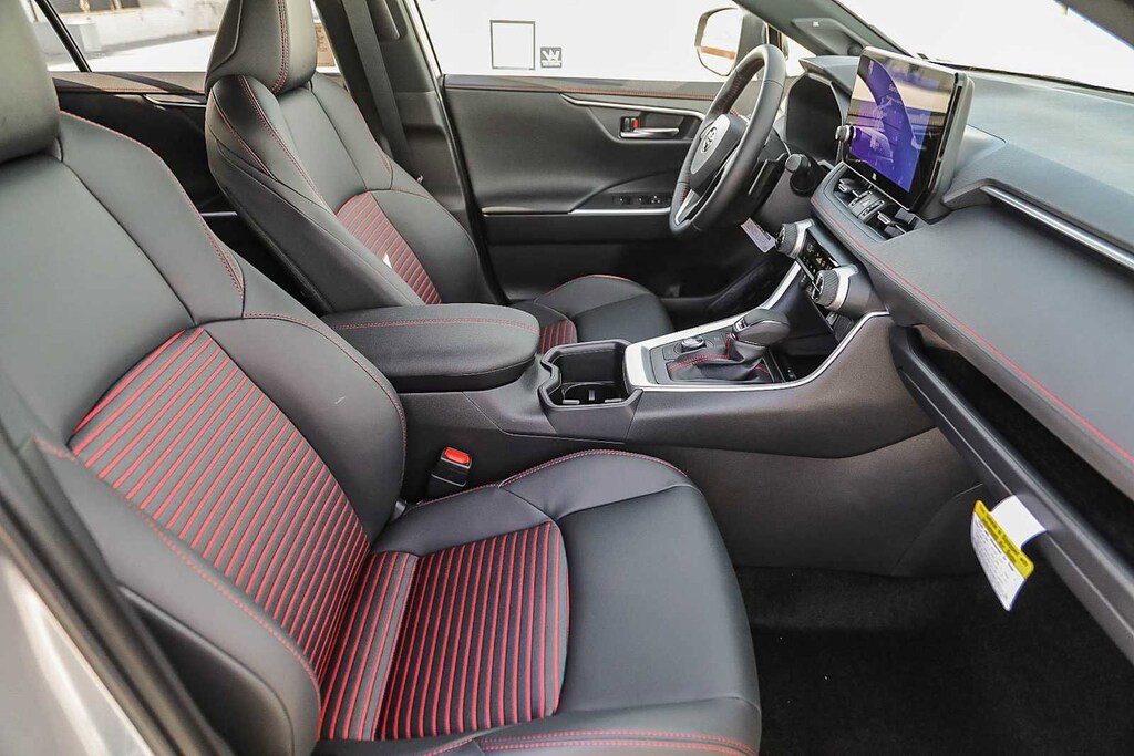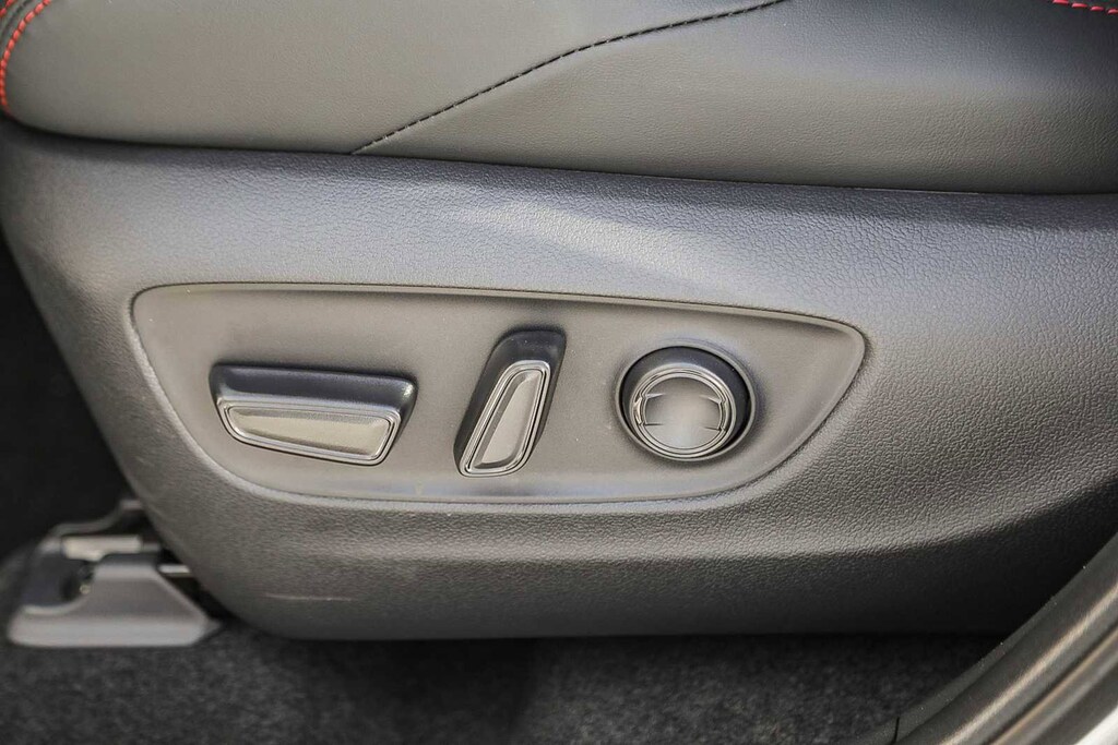 - Red-accented interior, including red stitching on dash, doors, console and seat, and black anti-slip in-dash storage trays with blue ambient lighting.