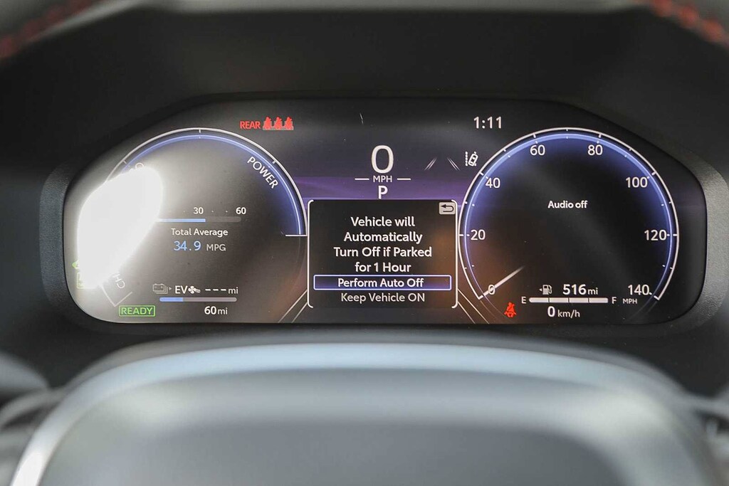 - 12.3-in. Digital gauge cluster with customizable settings, odometer, tripmeters, clock, outside temperature, rear passenger seatbelt indicators, fuel gauge, hybrid energy monitor, battery charge meter, fuel economy information, trip timer, shift-position and scheduled maintenance indicators, and warning messages.