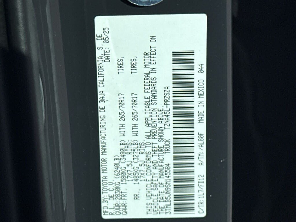 4WD, 3.583 Axle Ratio, 4-Wheel Disc Brakes, 6 Speakers, ABS brakes, Air Conditioning, All Weather Floor Liners (TMS), Alloy wheels, AM/FM radio: SiriusXM, Anti-whiplash front head restraints, Apple CarPlay/Android Auto, ARB Bed Rack HD Kit w/Molle Panels (TMS), Auto High-beam Headlights, Auto-dimming Rear-View mirror, Automatic temperature control, Bed Scene Lighting (TMS), Brake assist, Bumpers: body-color, Driver door bin, Driver vanity mirror, Dual front impact airbags, Dual front side impact airbags, Electronic Stability Control, Emergency communication system: Safety Connect (1-year trial), Exterior Parking Camera Rear, Fabric Seat Trim, Four wheel independent suspension, Front anti-roll bar, Front Bucket Seats, Front Center Armrest, Front fog lights, Front reading lights, Fully automatic headlights, Heated door mirrors, Heated Seats, Illuminated entry, JBL Premium Audio, Knee airbag, Leather Shift Knob, Leather steering wheel, Low tire pressure warning, Occupant sensing airbag, Outside temperature display, Overhead airbag, Overhead console, Panic alarm, Passenger door bin, Passenger vanity mirror, Power door mirrors, Power steering, Power windows, Predator Step (TMS), Radio: 8 Toyota Audio Multimedia, Rear step bumper, Rear window defroster, Remote keyless entry, Security system, SiriusXM Trial Offering: 33 Months (TMS), SofTex Seat Trim, Speed control, Speed-sensing steering, Split folding rear seat, Steering wheel mounted audio controls, Tachometer, Telescoping steering wheel, Tilt steering wheel, Traction control, Trip computer, Turn signal indicator mirrors, Variably intermittent wipers, Wheel Locks (TMS), and Wheels: 17 TRD Off-Road Alloy.