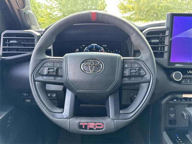 - TRD leather-wrapped manual tilt/telescopic steering wheel with TRD badge, red center stripe, and phone, audio, display/infotainment, and Driver Assist controls