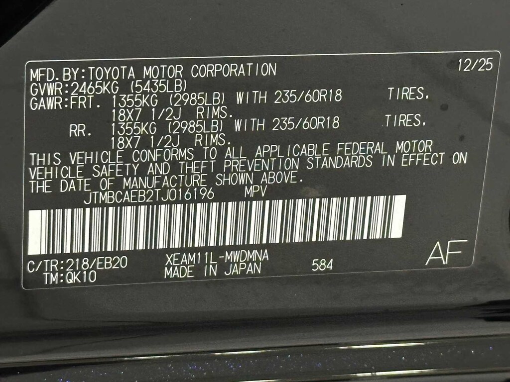 - Rear tires: 235/60VR18.0