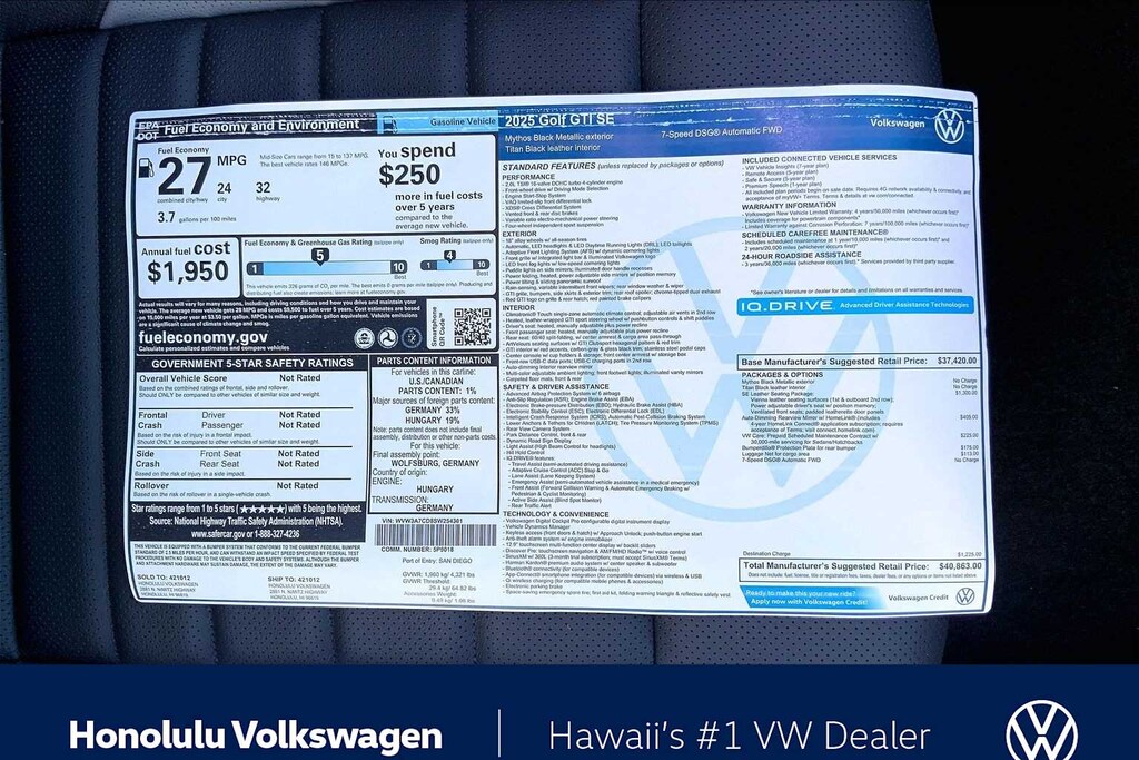 Get to know your Premier Honolulu Volkswagen Dealership, Selling New and Pre-Owned used vehicles in; Waianae, Kapolei, Ewa Beach, Waipahu, Waikele, Pearl City, Hawaii, Kai, Aiea, Mililani, Haleiwa, Honolulu, Waimanalo, Kailua, Kaneohe, Laie, Hauula, Kaaawa, Waialua, Wahiawa, Joint Base Pearl Harbor, Schofield Barracks, Pearl Harbor, Fort Schafter, Waikiki, Kaimuki, Marine Corp Base Hawaii, Kalihi, Makakilo, Oahu, https: //www.honoluluvw.com Plus government fees and taxes and $795 dealer document processing fee. MSRP includes destination and handling fee. Additional cost for dealer installed accessories. Price includes: $1000 - Customer Bonus. Exp. 02/02/2026