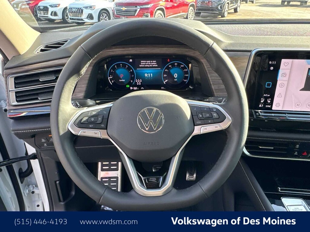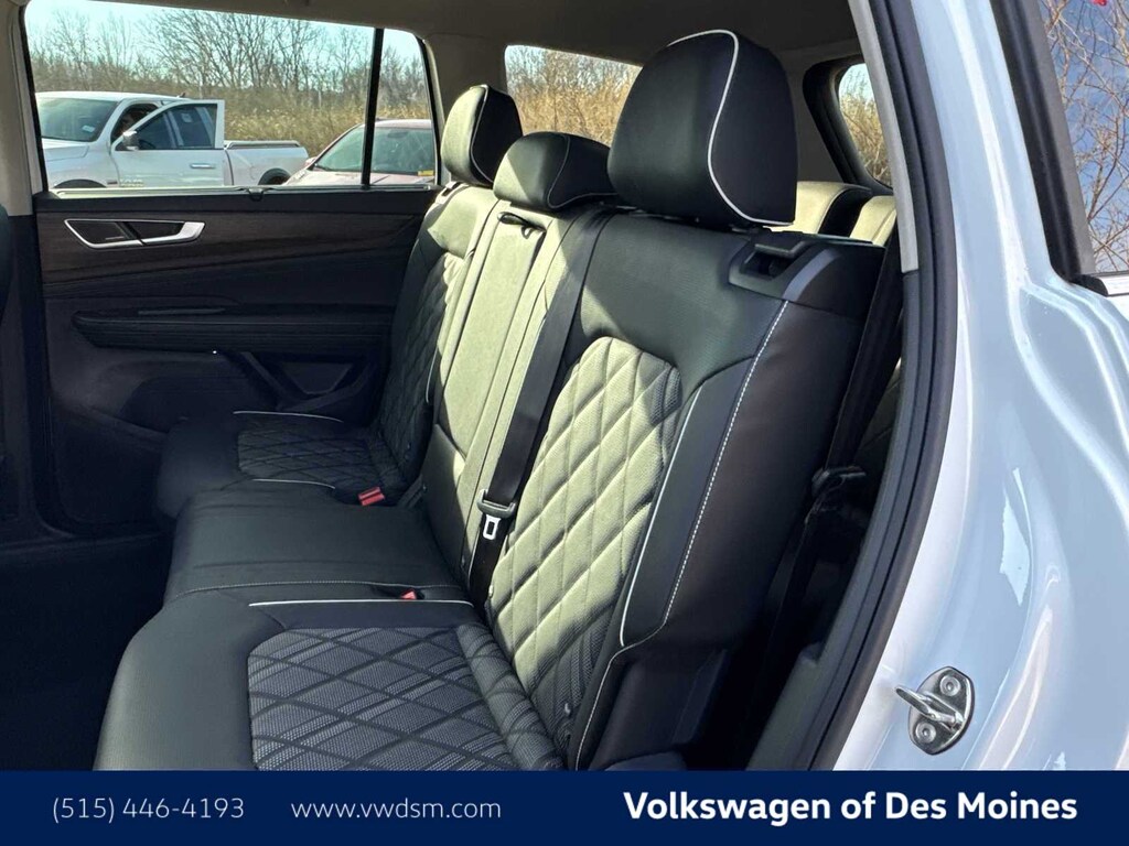 Atlas 2.0T SEL Premium R-Line is nicely equipped with 10 Speakers, 3rd row seats: split-bench, 4-Wheel Disc Brakes, 4-Wheel Independent Suspension, ABS brakes, Air Conditioning, Alloy wheels, AM/FM radio: SiriusXM with 360L, Auto High-beam Headlights, Auto-dimming Rear-View mirror, Automatic temperature control, Brake assist, Bumpers: body-color, Compass, Delay-off headlights, Driver door bin, Driver vanity mirror, Dual front impact airbags, Dual front side impact airbags, Electronic Stability Control, Emergency communication system: VW Car-Net Safe & Secure 5-year, Exterior Parking Camera Rear, Four wheel independent suspension, Front anti-roll bar, Front Bucket Seats, Front Center Armrest, Front dual zone A/C, Front fog lights, Front reading lights, Fully automatic headlights, Garage door transmitter: HomeLink, harman/kardonî Speakers, Heads-Up Display, Heated & Actively Ventilated Front Bucket Seats, Heated door mirrors, Heated front seats, Heated rear seats, Heated steering wheel, Illuminated entry, Leather steering wheel, Low tire pressure warning, Memory seat, Navigation System, Occupant sensing airbag, Outside temperature display, Overhead airbag, Overhead console, Panic alarm, Passenger door bin, Passenger vanity mirror, Perforated Vienna Leather Seating Surfaces, Power door mirrors, Power driver seat, Power Liftgate, Power moonroof: Panoramic, Power passenger seat, Power steering, Power windows, Radio data system, Radio: MIB3 Discover Pro w/Navigation, Rain sensing wipers, Rear air conditioning, Rear anti-roll bar, Rear audio controls, Rear reading lights, Rear seat center armrest, Rear window defroster, Rear window wiper, Remote keyless entry, Seat Inserts w/Diamond-Pattern Stitching, Security system, Speed control, Speed-sensing steering, Split folding rear seat, Spoiler, Sport steering wheel, Steering wheel mounted audio controls, Tachometer, Telescoping steering wheel, Tilt steering wheel, Traction control, Trip computer, Turn signal indicator mirrors, Variably intermittent wipers, Ventilated front seats, and Wheels: 21 2-Tone Machined Alloy. Price includes: $3000 - Customer Bonus. Exp. 03/02/2026