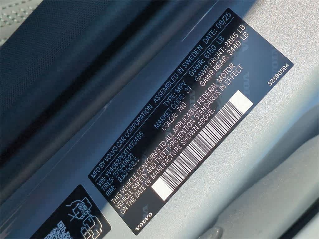 Protection Package (All-Weather Floor Mats, Bumper Cover, Cargo Tray, First Aid Kit, and Wheel Locks), AWD, Charcoal Premium Synthetic, 10 Speakers, 3rd row seats: bucket, 4-Wheel Disc Brakes, ABS brakes, Air Conditioning, Alloy wheels, AM/FM radio: SiriusXM, Anti-whiplash front head restraints, Apple CarPlay, Auto High-beam Headlights, Auto-dimming door mirrors, Auto-dimming Rear-View mirror, Automatic temperature control, Brake assist, Bumpers: body-color, Delay-off headlights, Driver door bin, Driver vanity mirror, Dual front impact airbags, Dual front side impact airbags, Electronic Stability Control, Emergency communication system: Volvo Cars App w/4 Year Subscription, Exterior Parking Camera Rear, Four wheel independent suspension, Front anti-roll bar, Front Bucket Seats, Front Center Armrest w/Storage, Front dual zone A/C, Front reading lights, Fully automatic headlights, Garage door transmitter: HomeLink, Genuine wood dashboard insert, Genuine wood door panel insert, harman/kardon Premium Sound, Headlight cleaning, Heated door mirrors, Heated Front Bucket Seats, Heated front seats, Heated rear seats, Heated steering wheel, Illuminated entry, Integrated rear child seats, Knee airbag, Low tire pressure warning, Memory seat, Navigation System, Nordico Upholstery, Occupant sensing airbag, Outside temperature display, Overhead airbag, Panic alarm, Passenger door bin, Passenger vanity mirror, Power door mirrors, Power driver seat, Power Liftgate, Power moonroof, Power passenger seat, Power steering, Power windows, Radio data system, Radio: High Performance Audio System, Rain sensing wipers, Rear air conditioning, Rear anti-roll bar, Rear dual zone A/C, Rear fog lights, Rear reading lights, Rear seat center armrest, Rear window defroster, Rear window wiper, Remote keyless entry, Security system, Speed control, Speed-sensing steering, Split folding rear seat, Spoiler, Steering wheel mounted audio controls, Tachometer, Telescoping steering wheel, Traction control, Trip computer, Turn signal indicator mirrors, Variably intermittent wipers, and Wheels: 21 5-Multi Spoke Black Diamond Cut Alloy Bluetooth Backup Camera Price does not include licensing costs, registration fees, taxes and dealer doc fee of $280, which are to be paid by the consumer. **DEALER INSPECTED**, Remote Start, Bluetooth, Rear Back-up Camera, AWD, Charcoal Premium Synthetic. Vapour Gray Metallic 2026 Volvo XC90 Plus AWD Automatic with Geartronic 2.0L I4 Turbocharged DOHC 16V LEV3-ULEV70