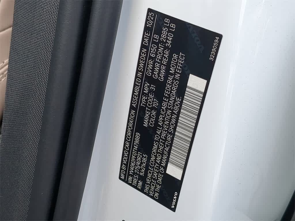 AWD, Rce0/ Leather, 14 Speakers, 3rd row seats: bucket, 4-Wheel Disc Brakes, ABS brakes, Air Conditioning, Alloy wheels, AM/FM radio: SiriusXM, Anti-whiplash front head restraints, Apple CarPlay, Auto High-beam Headlights, Auto-dimming door mirrors, Auto-dimming Rear-View mirror, Automatic temperature control, Brake assist, Bumpers: body-color, Delay-off headlights, Driver door bin, Driver vanity mirror, Dual front impact airbags, Dual front side impact airbags, Electronic Stability Control, Emergency communication system: Volvo Cars App w/4 Year Subscription, Exterior Parking Camera Rear, Four wheel independent suspension, Front anti-roll bar, Front Bucket Seats, Front Center Armrest w/Storage, Front dual zone A/C, Front reading lights, Fully automatic headlights, Garage door transmitter: HomeLink, Genuine wood dashboard insert, Genuine wood door panel insert, harman/kardonî Speakers, Headlight cleaning, Heads-Up Display, Heated door mirrors, Heated Front Bucket Seats w/Power Side Support, Heated front seats, Heated rear seats, Heated steering wheel, Illuminated entry, Integrated rear child seats, Knee airbag, Low tire pressure warning, Memory seat, Navigation System, Occupant sensing airbag, Outside temperature display, Overhead airbag, Panic alarm, Passenger door bin, Passenger vanity mirror, Power door mirrors, Power driver seat, Power Liftgate, Power moonroof, Power passenger seat, Power steering, Power windows, Radio data system, Radio: High Performance Audio System, Rain sensing wipers, Rear air conditioning, Rear anti-roll bar, Rear dual zone A/C, Rear fog lights, Rear reading lights, Rear seat center armrest, Rear window defroster, Rear window wiper, Remote keyless entry, Security system, Speed control, Speed-sensing steering, Split folding rear seat, Spoiler, Steering wheel mounted audio controls, Tachometer, Telescoping steering wheel, Traction control, Trip computer, Turn signal indicator mirrors, Variably intermittent wipers, Ventilated front seats, Ventilated Nappa Leather Upholstery, and Wheels: 21 5-Multi Spoke Black Diamond Cut Alloy Bluetooth Backup Camera Price does not include licensing costs, registration fees, taxes and dealer doc fee of $280, which are to be paid by the consumer. **DEALER INSPECTED**, Remote Start, Bluetooth, Rear Back-up Camera, AWD, Rce0/ Leather. Crystal White Pearl 2026 Volvo XC90 Ultra AWD Automatic with Geartronic 2.0L I4 Turbocharged DOHC 16V LEV3-ULEV70