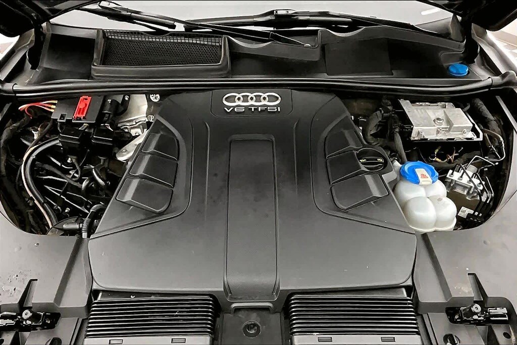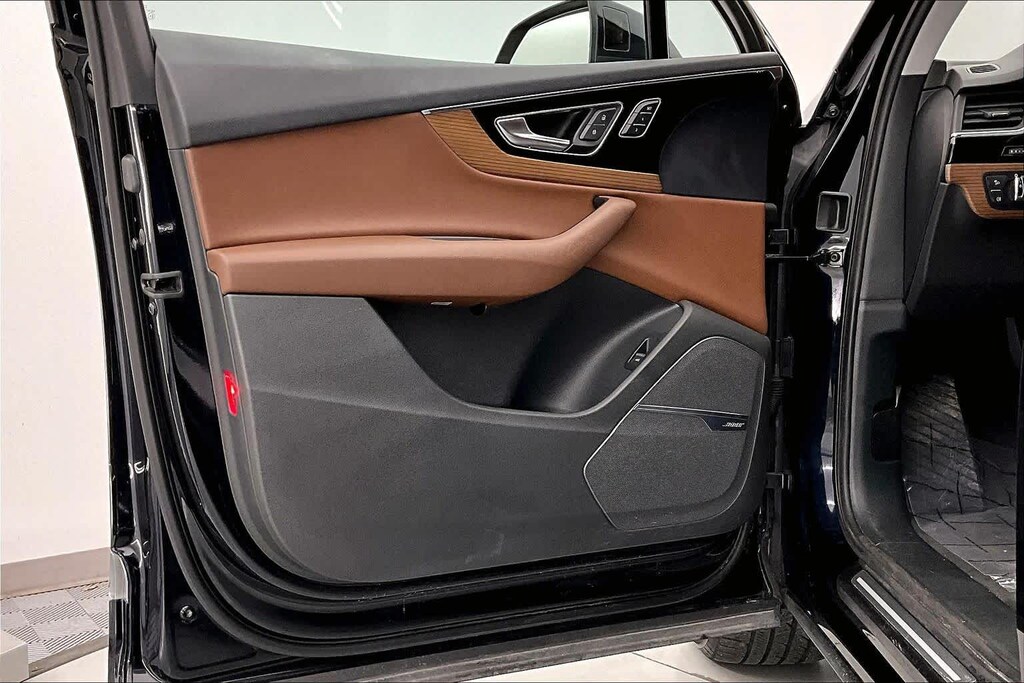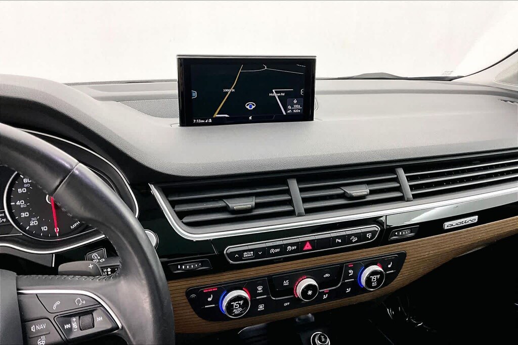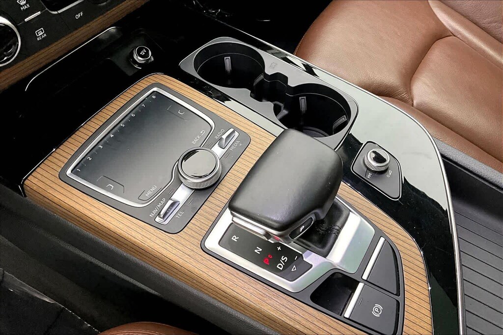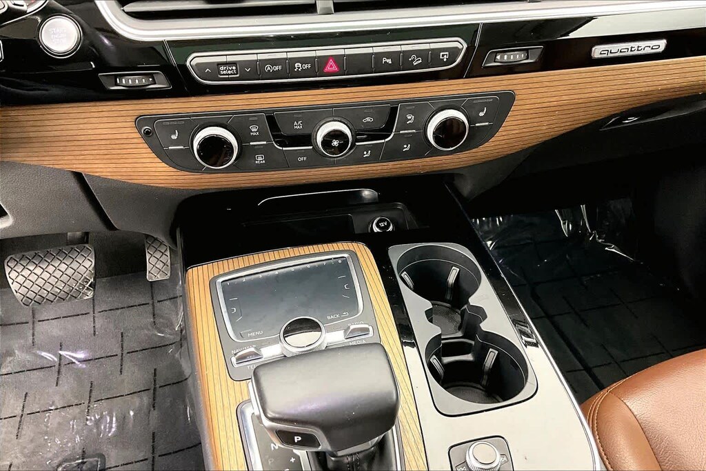 Audi MMI Navigation Plus Package, LED Interior Lighting Package, Premium Plus Package (Audi Advanced Key, Audi Side Assist, Electric Tilt/Telescopic Steering Column, Heated Auto-Dimming Power Folding Exterior Mirrors, and Stainless Steel Trunk Sill), Q7 3.0T Premium Plus quattro, 3.0L TFSI V6 DOHC, Heated front seats, Leather Seating Surfaces, Power moonroof, Radio: MMI Radio Plus w/Audi Sound System, Wheels: 20 10-Spoke-Star Design, 10 Speakers, 3.204 Axle Ratio, 3rd row seats: bench, 4-Wheel Disc Brakes, ABS brakes, Air Conditioning, Alloy wheels, AM/FM radio: SiriusXM, Auto-dimming Rear-View mirror, Automatic temperature control, Brake assist, Bumpers: body-color, CD player, Compass, Delay-off headlights, Driver door bin, Driver vanity mirror, Drivers Seat Mounted Armrest, Dual front impact airbags, Dual front side impact airbags, Electronic Stability Control, Exterior Parking Camera Rear, Four wheel independent suspension, Front anti-roll bar, Front Bucket Seats, Front dual zone A/C, Front fog lights, Front reading lights, Fully automatic headlights, Garage door transmitter: HomeLink, Heated door mirrors, Heated Front Bucket Seats, High intensity discharge headlights: Xenon plus, Illuminated entry, Leather Shift Knob, Leather steering wheel, Low tire pressure warning, Memory seat, Occupant sensing airbag, Outside temperature display, Overhead airbag, Panic alarm, Passenger door bin, Passenger seat mounted armrest, Passenger vanity mirror, Power door mirrors, Power driver seat, Power Liftgate, Power passenger seat, Power steering, Power windows, Radio data system, Rain sensing wipers, Rear air conditioning, Rear anti-roll bar, Rear fog lights, Rear reading lights, Rear seat center armrest, Rear window defroster, Rear window wiper, Remote keyless entry, Roof rack: rails only, Security system, Speed control, Speed-sensing steering, Split folding rear seat, Spoiler, Steering wheel mounted audio controls, Tachometer, Telescoping steering wheel, Tilt steering wheel, Traction control, Trip computer, Turn signal indicator mirrors, and Variably intermittent wipers. Local Trade, Q7 3.0T Premium Plus quattro, 3.0L TFSI V6 DOHC, Audi Advanced Key, Audi MMI Navigation Plus Package, Audi Side Assist, Electric Tilt/Telescopic Steering Column, Heated Auto-Dimming Power Folding Exterior Mirrors, Heated front seats, Leather Seating Surfaces, LED Interior Lighting Package, Power moonroof, Premium Plus Package, Radio: MMI Radio Plus w/Audi Sound System, Stainless Steel Trunk Sill, Wheels: 20 10-Spoke-Star Design.