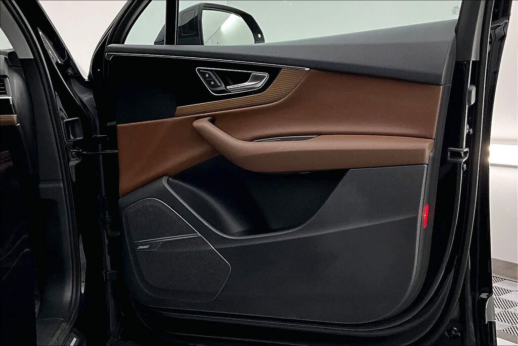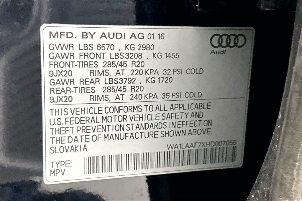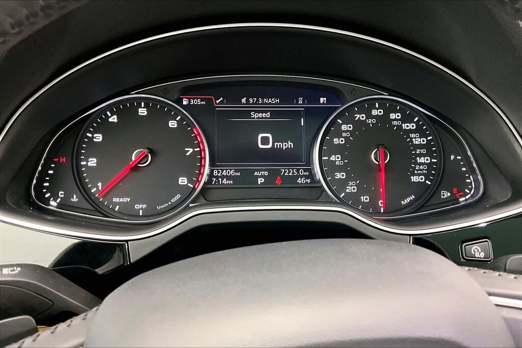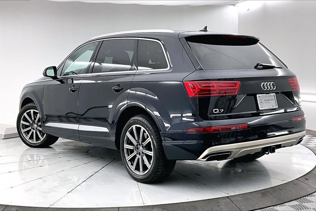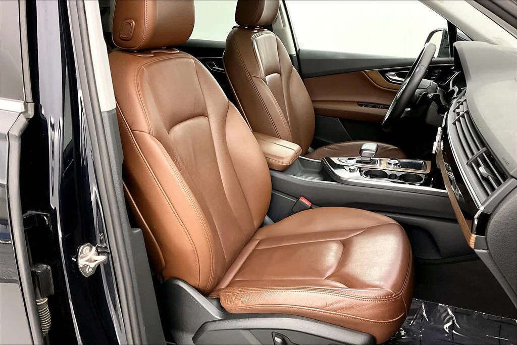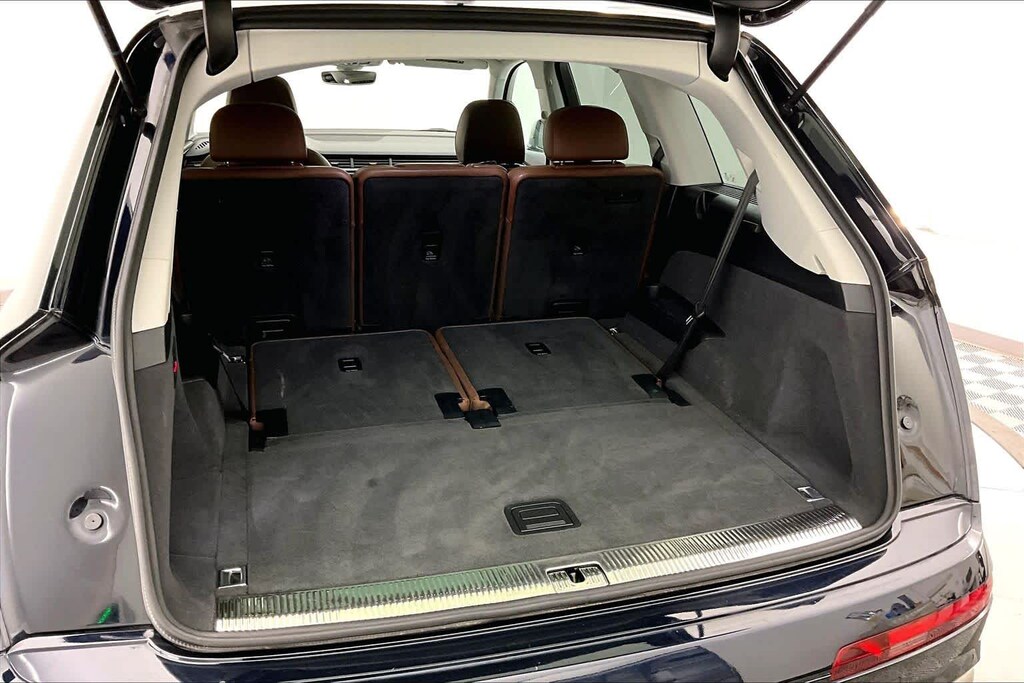 Audi MMI Navigation Plus Package, LED Interior Lighting Package, Premium Plus Package (Audi Advanced Key, Audi Side Assist, Electric Tilt/Telescopic Steering Column, Heated Auto-Dimming Power Folding Exterior Mirrors, and Stainless Steel Trunk Sill), Q7 3.0T Premium Plus quattro, 3.0L TFSI V6 DOHC, Heated front seats, Leather Seating Surfaces, Power moonroof, Radio: MMI Radio Plus w/Audi Sound System, Wheels: 20 10-Spoke-Star Design, 10 Speakers, 3.204 Axle Ratio, 3rd row seats: bench, 4-Wheel Disc Brakes, ABS brakes, Air Conditioning, Alloy wheels, AM/FM radio: SiriusXM, Auto-dimming Rear-View mirror, Automatic temperature control, Brake assist, Bumpers: body-color, CD player, Compass, Delay-off headlights, Driver door bin, Driver vanity mirror, Drivers Seat Mounted Armrest, Dual front impact airbags, Dual front side impact airbags, Electronic Stability Control, Exterior Parking Camera Rear, Four wheel independent suspension, Front anti-roll bar, Front Bucket Seats, Front dual zone A/C, Front fog lights, Front reading lights, Fully automatic headlights, Garage door transmitter: HomeLink, Heated door mirrors, Heated Front Bucket Seats, High intensity discharge headlights: Xenon plus, Illuminated entry, Leather Shift Knob, Leather steering wheel, Low tire pressure warning, Memory seat, Occupant sensing airbag, Outside temperature display, Overhead airbag, Panic alarm, Passenger door bin, Passenger seat mounted armrest, Passenger vanity mirror, Power door mirrors, Power driver seat, Power Liftgate, Power passenger seat, Power steering, Power windows, Radio data system, Rain sensing wipers, Rear air conditioning, Rear anti-roll bar, Rear fog lights, Rear reading lights, Rear seat center armrest, Rear window defroster, Rear window wiper, Remote keyless entry, Roof rack: rails only, Security system, Speed control, Speed-sensing steering, Split folding rear seat, Spoiler, Steering wheel mounted audio controls, Tachometer, Telescoping steering wheel, Tilt steering wheel, Traction control, Trip computer, Turn signal indicator mirrors, and Variably intermittent wipers. Local Trade, Q7 3.0T Premium Plus quattro, 3.0L TFSI V6 DOHC, Audi Advanced Key, Audi MMI Navigation Plus Package, Audi Side Assist, Electric Tilt/Telescopic Steering Column, Heated Auto-Dimming Power Folding Exterior Mirrors, Heated front seats, Leather Seating Surfaces, LED Interior Lighting Package, Power moonroof, Premium Plus Package, Radio: MMI Radio Plus w/Audi Sound System, Stainless Steel Trunk Sill, Wheels: 20 10-Spoke-Star Design.