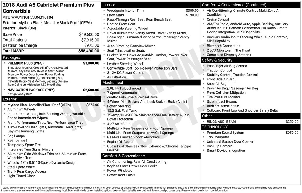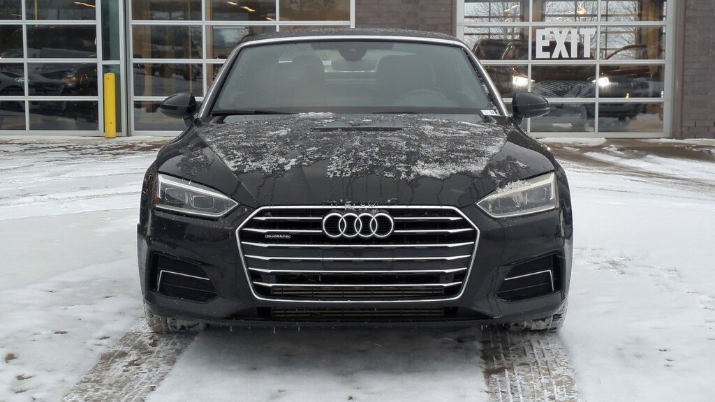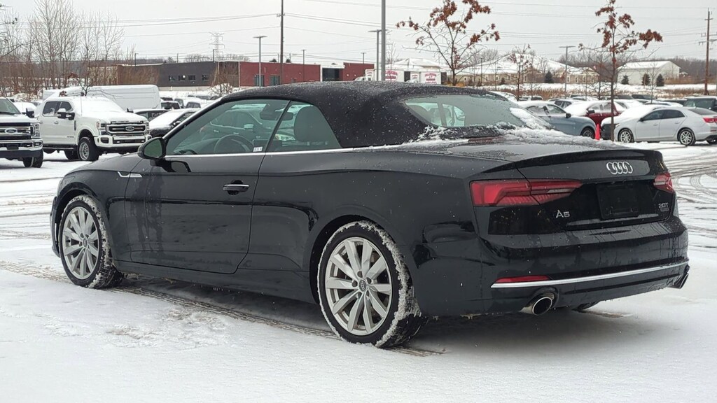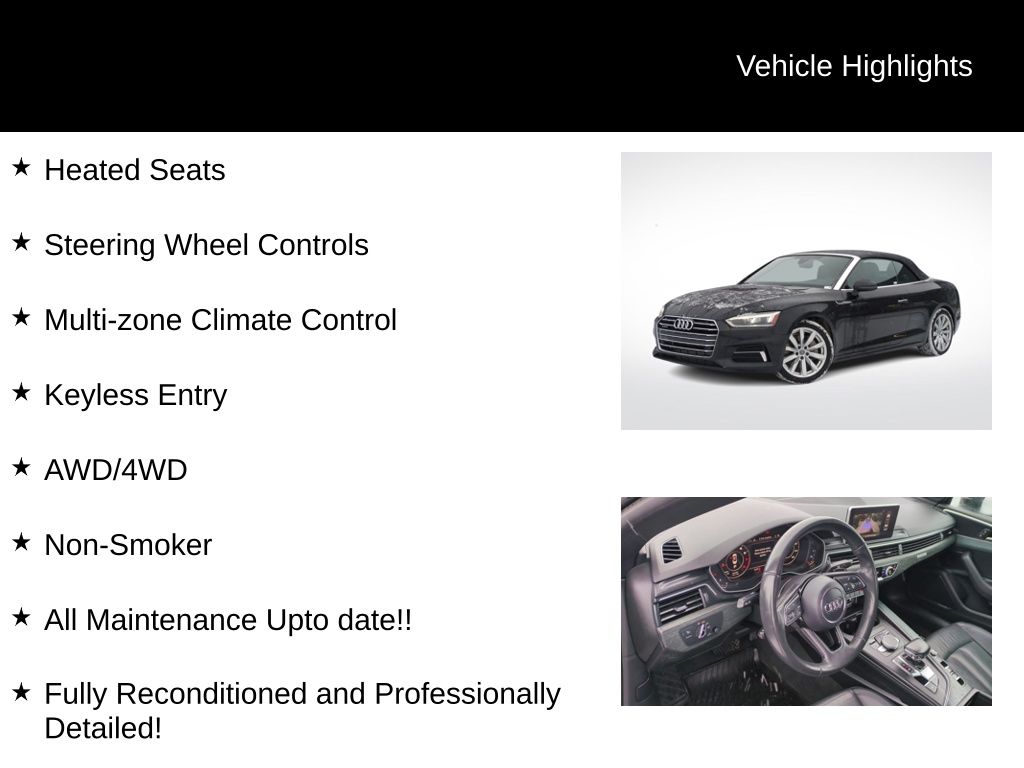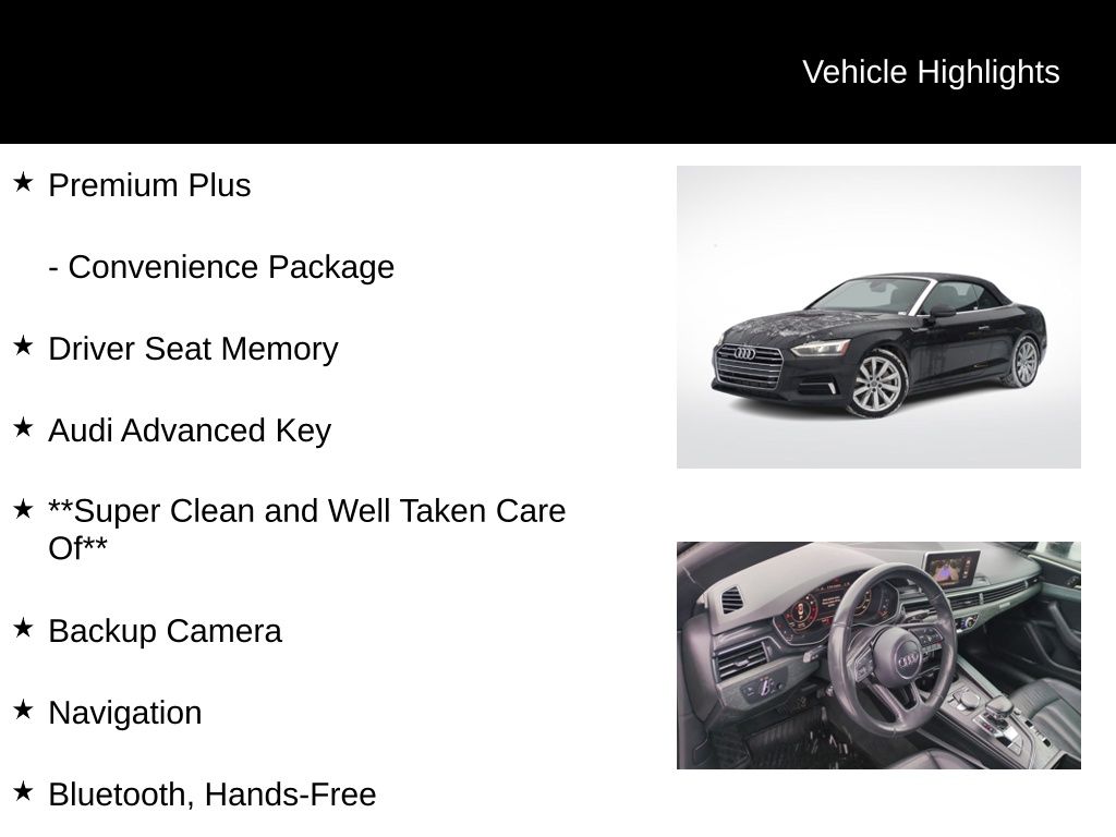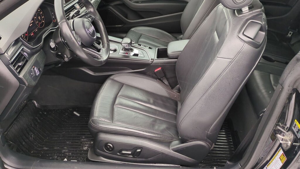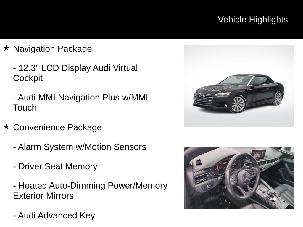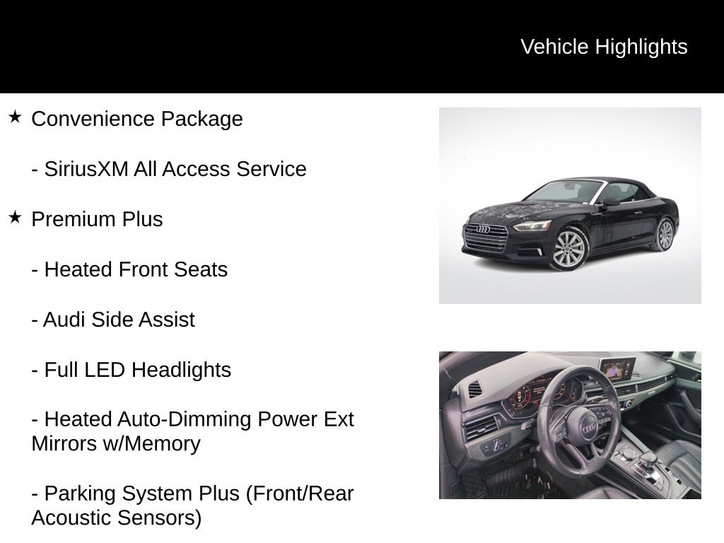 2018 Audi A5 2.0T Premium Plus quattro Is nicely equipped with Convenience Package (Alarm System w/Motion Sensors, Audi Advanced Key, Driver Seat Memory, Heated Auto-Dimming Power/Memory Exterior Mirrors, and SiriusXM All Access Service), Navigation Package (12.3" LCD Display Audi Virtual Cockpit and Audi MMI Navigation Plus w/MMI Touch), Premium Plus (Audi Side Assist, Full LED Headlights, Heated Auto-Dimming Power Ext Mirrors w/Memory, Heated Front Seats, Parking System Plus (Front/Rear Acoustic Sensors), and Rear Audi Pre Sense), quattro, Black Leather, Navigation System, 10 Speakers, 4-Wheel Disc Brakes, ABS brakes, Air Conditioning, Alloy wheels, Anti-whiplash front head restraints, Audi Guard All-Weather Front & Rear Mats, Audi smartphone interface (Apple CarPlay/Android Auto), Auto-dimming Rear-View mirror, Automatic temperature control, Bang & Olufsen Sound System w/3D Sound, Brake assist, Bumpers: body-color, CD player, Convertible roof lining, Convertible roof wind blocker, Delay-off headlights, Driver door bin, Driver vanity mirror, Dual front impact airbags, Dual front side impact airbags, Electronic Stability Control, Exterior Parking Camera Rear, Four wheel independent suspension, Front anti-roll bar, Front Bucket Seats, Front Center Armrest, Front dual zone A/C, Front fog lights, Front reading lights, Garage door transmitter: HomeLink, Glass rear window, Gray Oak Wood Natural Inlays, Headlight cleaning, Heated door mirrors, High intensity discharge headlights: Xenon plus, Illuminated entry, Integrated roll-over protection, Knee airbag, Leather Seating Surfaces, Leather Shift Knob, Leather steering wheel, Low tire pressure warning, Occupant sensing airbag, Outside temperature display, Panic alarm, Passenger door bin, Passenger vanity mirror, Power adjustable front head restraints, Power convertible roof, Power door mirrors, Power driver seat, Power passenger seat, Power steering, Power windows, Radio data system, Radio: Audi Sound System, Rain sensing wipers, Rear air conditioning, Rear anti-roll bar, Rear reading lights, Rear window defroster, Remote keyless entry, Rings Audi Beam, Speed control, Speed-sensing steering, Speed-Sensitive Wipers, Split folding rear seat, Sport steering wheel, Steering wheel mounted audio controls, Tachometer, Telescoping steering wheel, Tilt steering wheel, Traction control, Trip computer, Turn signal indicator mirrors, Variably intermittent wipers, and Wheels: 18" x 8.5" 10-Spoke-Dynamic-Design.