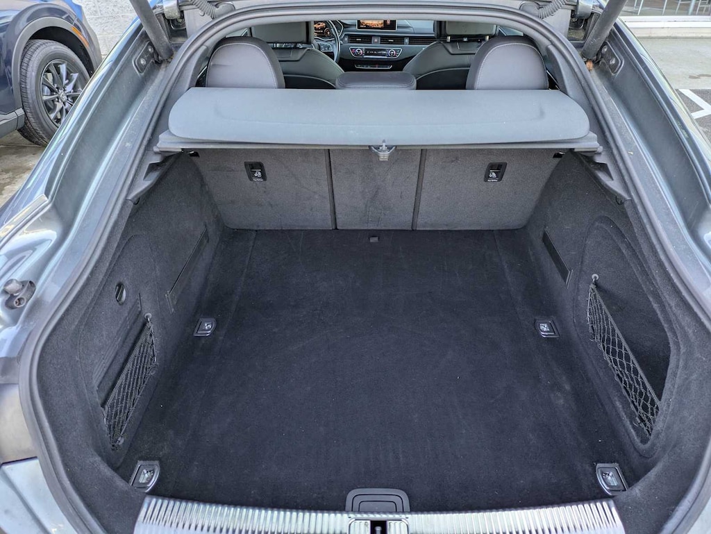 Second, upfront interior storage is nearly nonexistent. There appears to have been only a halfhearted attempt to provide in-console storage, which amounts to a tiny, shallow bin that has only a partially enclosing lid—one that doesn’t fully conceal the few articles one is able to fit in it. And unlike other cars in this class, there’s no dedicated compartment in which to store sunglasses, forcing you to be creative with where you choose to stow them. On top of all that, the cup holders are placed so close to the center dash controls that they can barely hold anything larger than a small water bottle or a medium size drink before interfering with the use of those controls. So no Big Gulps allowed in this A5’s cozy cockpit!