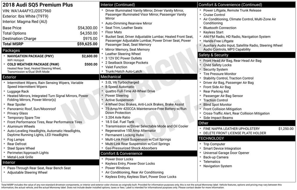 Discover the exceptional 2018 Audi SQ5 3.0T Premium Plus quattro, a masterpiece of engineering and design. This captivating SUV seamlessly blends power, sophistication, and cutting-edge technology, making it the perfect companion for the discerning driver. Navigation Package Fine Nappa Leather Upholstery Cold Weather PackageBoasting a stunning 3.0L TFSI engine, this SQ5 delivers exhilarating performance with 8-speed Tiptronic transmission and legendary quattro all-wheel drive. Indulge in the convenience of the Audi Virtual Cockpit, a 12.3-inch fully digital instrument cluster that puts critical information at your fingertips. The Audi Connect PRIME & PLUS system offers seamless smartphone integration and a wealth of online services, keeping you connected and entertained on every journey.Experience the ultimate in comfort and style with the Fine Nappa Leather upholstery, heated front sport seats, and a 3-spoke heated steering wheel with shift paddles. The Cold Weather Package adds heated rear seats and a heated steering wheel, ensuring you and your passengers stay cozy even in the harshest conditions.Elevate your driving experience with the SQ5's impressive array of advanced features, including a power liftgate, rain-sensing wipers, and an exterior parking camera for effortless maneuverability. The adaptive suspension and speed-sensing steering provide a dynamic and responsive ride, while the 4-wheel disc brakes with ABS ensure confident stopping power.Crafted with meticulous attention to detail, the 2018 Audi SQ5 3.0T Premium Plus quattro is a true testament to the brand's commitment to excellence. This exceptional SUV is the embodiment of Audi's relentless pursuit of perfection, delivering a driving experience that is both thrilling and refined.Price does not include licensing costs, registration fees, taxes and dealer doc fee of $280, which are to be paid by the consumer.