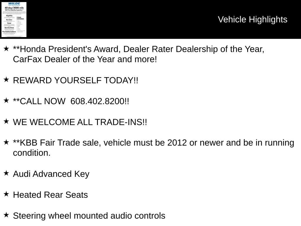 **Honda Presidents Award, Dealer Rater Dealership of the Year, CarFax Dealer of the Year and more!, REWARD YOURSELF TODAY!!, **CALL NOW 608.402.8200!!, WE WELCOME ALL TRADE-INS!!, **KBB Fair Trade sale, vehicle must be 2012 or newer and be in running condition., Besides many of the features just listed, this Audi A6 also may have many of the following;, quattro, Black Leather, Audi Advanced Key, Heated Rear Seats, Steering wheel mounted audio controls, 10 Speakers, 20 Sport Package, 4-Wheel Disc Brakes, 4-Zone Automatic Climate Control, ABS brakes, Air Conditioning, Alloy wheels, AM/FM radio: SiriusXM, Audi Active Lane Assist w/Emergency Assist, Audi Adaptive Cruise Assist, Audi Phone Box w/Wireless Charging, Audi Side Assist w/Pre Sense Rear, Audi smartphone interface (Apple CarPlay/Android Auto), Audi Virtual Cockpit, Auto tilt-away steering wheel, Auto-dimming door mirrors, Auto-dimming Rear-View mirror, Automatic temperature control, Bang & Olufsen 3D Premium Sound System, Brake assist, Bumpers: body-color, Cold Weather Package, Compass, Contrast Stitching on Door Armrests & Knee Bolster, Convenience Package, Delay-off headlights, Driver Assistance Package, Driver door bin, Driver vanity mirror, Dual front impact airbags, Dual front side impact airbags, Electronic Stability Control, Emergency communication system: Audi connect CARE, Exterior Parking Camera Rear, Four wheel independent suspension, Front & Rear Door Audi Beam-Rings, Front anti-roll bar, Front Bucket Seats, Front Center Armrest, Front dual zone A/C, Front fog lights, Front reading lights, Front Seat Ventilation & 4-Way Power Lumbar, Garage door transmitter: HomeLink, Genuine wood console insert, Genuine wood dashboard insert, Genuine wood door panel insert, Gray/Brown Fine Grain Ash Natural Wood Inlays, Headlight Washer System, Heated Auto-Dimming Power-Folding Exterior Mirrors, Heated door mirrors, Heated Front Seats, Heated front seats, Heated Steering Wheel, Illuminated entry, Knee airbag, Leather Seating Surfaces, Leather Shift Knob, Low tire pressure warning, Matrix-Design Headlights w/Highbeam Assist, Memory seat, Navigation System, Occupant sensing airbag, Outside temperature display, Overhead airbag, Overhead console, Panic alarm, Passenger door bin, Passenger vanity mirror, Power door mirrors, Power driver seat, Power moonroof, Power passenger seat, Power Rear & Manual Rear Side Window Sunshades, Power steering, Power windows, Premium Plus Package, Radio data system, Radio: Audi MMI Navigation Plus w/MMI Touch 10.1, Radio: Audi MMI Navigation w/MMI Touch Response, Rain sensing wipers, Rear air conditioning, Rear anti-roll bar, Rear reading lights, Rear seat center armrest, Rear window defroster, Remote keyless entry, Security system, Speed control, Speed-sensing steering, Speed-Sensitive Wipers, Split folding rear seat, Sport Suspension (20mm Drop), Steering wheel memory, Tachometer, Telescoping steering wheel, Tilt steering wheel, Top View Camera System w/Virtual 360 View, Traction control, Traffic Sign Recognition, Trip computer, Turn signal indicator mirrors, USB Cables, Variably intermittent wipers, Warm Weather Package, Wheels: 19 5-Double-Spoke Bi-Color, Wheels: 20 5-V-Spoke Bi-Color, quattro, Black Leather, Audi Advanced Key, Heated Rear Seats, Steering wheel mounted audio controls.