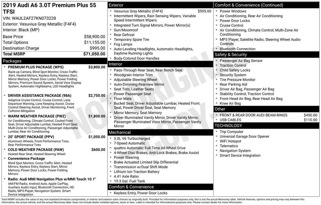 quattro 2019 Audi A6 3.0T Premium Plus quattro Odometer is 24380 miles below market average! 22/29 City/Highway MPG