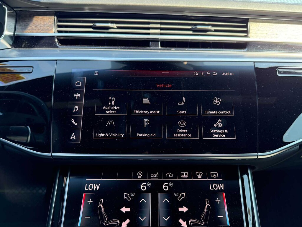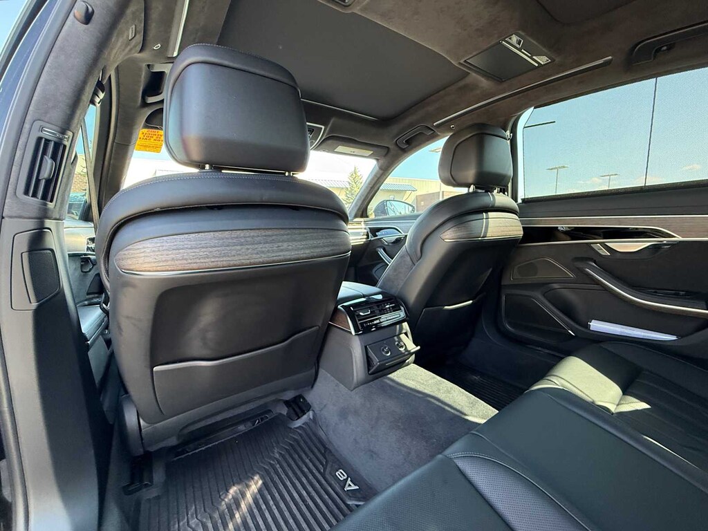 EXECUTIVE PACKAGE Audi Phone Box, wireless charging and signal booster, Chrome Exterior Package, Audi Head-Up Display, Acoustic & Break Resistant Dual-Pane Side Windows, Heated 4-Spoke Multifunction Steering Wheel, shift paddles, Audi Pre Sense Rear, Ventilated Comfort Front Seats, 22-way multi-contour front seats w/massage, Audi Side Assist, vehicle exit warning and Rear Cross Traffic Assist, Contour/Ambient LED Interior Lighting Package, Multicolor, Top View Camera System, virtual 360 view, LUXURY PACKAGE Extended Leather Package, door armrests and pulls, upper instrument panel, center console and airbag cap, Light Alcantara Headliner, Aluminum Optic Buttons, Ionizer & Fragrance Premium Air Quality, LIGHTING PACKAGE Headlight Washers, HD Matrix-Design LED Headlights, OLED Taillights w/Animation, DRIVER ASSISTANCE PACKAGE Audi Adaptive Cruise Assist, Traffic jam assist, turn assist and predictive efficiency assist, Traffic Sign Recognition, Audi Active Lane Assist, emergency assist, Intersection Assist, COLD WEATHER PACKAGE Heated Rear Outboard Seats, Heated Front Surfaces, door armrests and center armrest, Adaptive Windshield Wiping System. Audi A8 L with Mythos Black metallic exterior and Black interior features a 8 Cylinder Engine with 453 HP at 5500 RPM*.