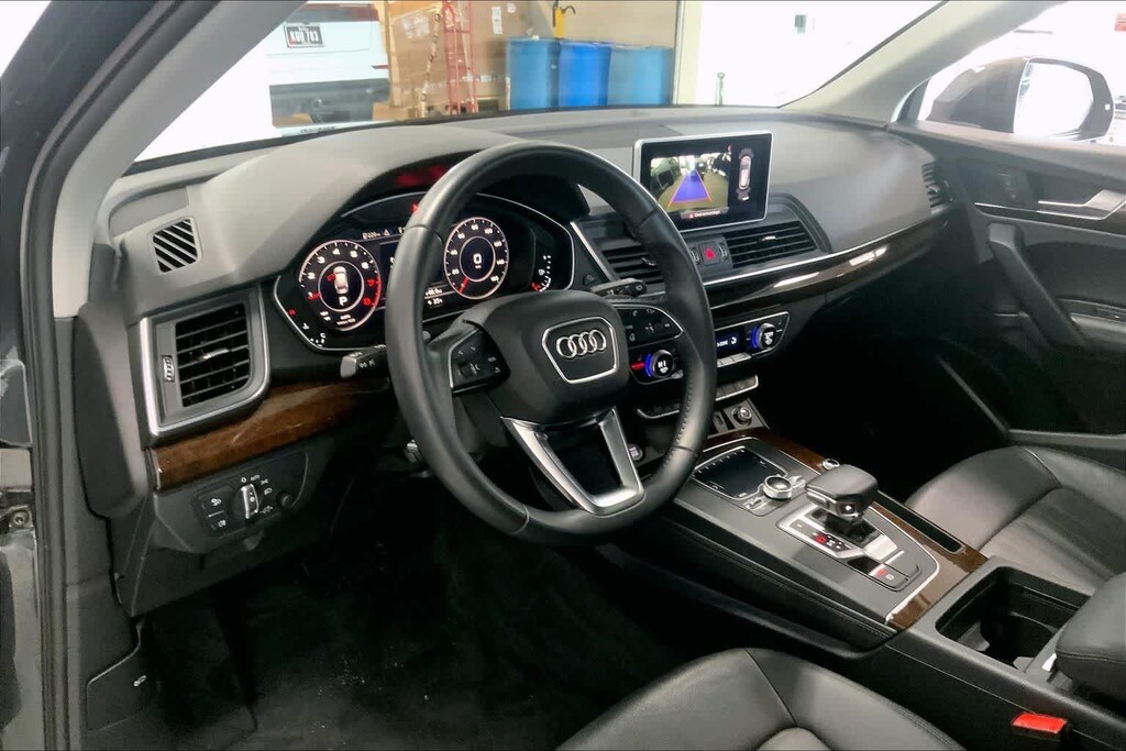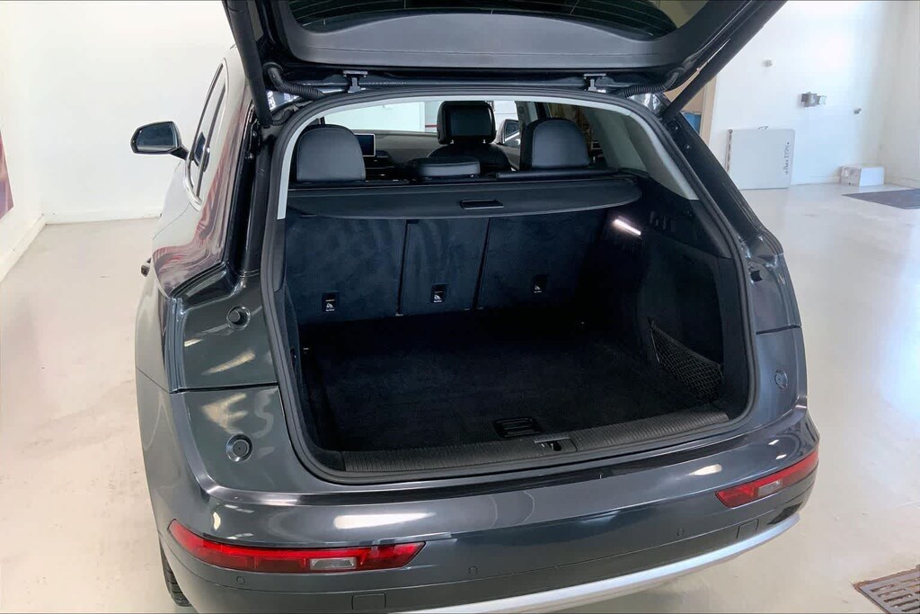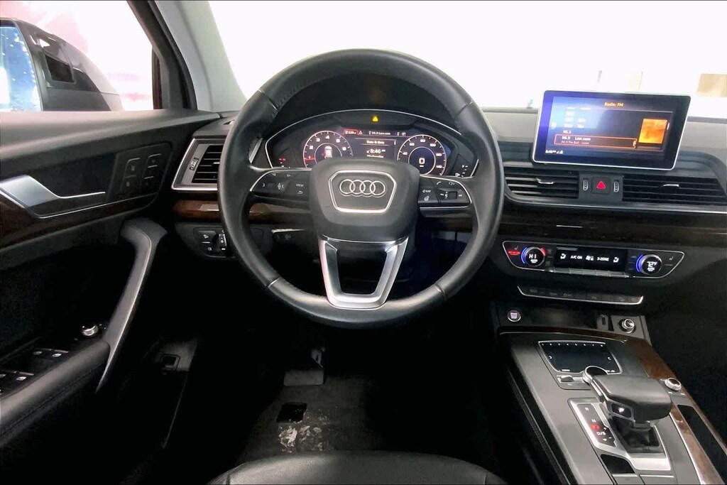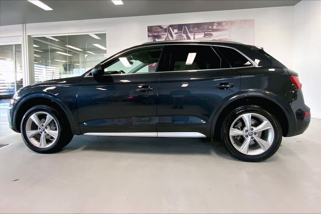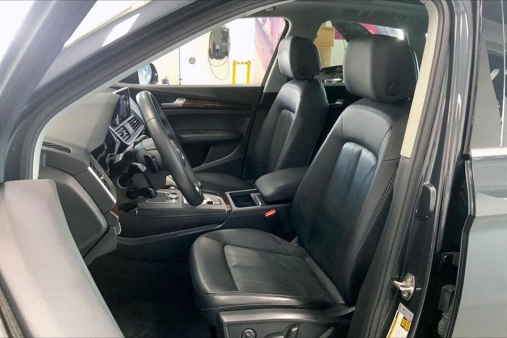 Q5 45 Premium Plus is nicely equipped with Leather, 10 Speakers, 4-Wheel Disc Brakes, 5.302 Axle Ratio, ABS brakes, Air Conditioning, Alloy wheels, AM/FM radio, Audi smartphone interface (Apple CarPlay/Android Auto), Auto High-beam Headlights, Auto-dimming Rear-View mirror, Automatic temperature control, Brake assist, Bumpers: body-color, Compass, Delay-off headlights, Driver door bin, Driver vanity mirror, Dual front impact airbags, Dual front side impact airbags, Electronic Stability Control, Emergency communication system: Audi connect CARE, Exterior Parking Camera Rear, Four wheel independent suspension, Front anti-roll bar, Front Bucket Seats, Front Center Armrest, Front dual zone A/C, Front fog lights, Front reading lights, Garage door transmitter: HomeLink, Genuine wood console insert, Genuine wood dashboard insert, Genuine wood door panel insert, Heated 8-Way Power Front Bucket Seats, Heated door mirrors, Heated front seats, High intensity discharge headlights: Xenon plus, Illuminated entry, Leather Seating Surfaces, Leather Shift Knob, Leather steering wheel, Low tire pressure warning, Occupant sensing airbag, Outside temperature display, Overhead airbag, Overhead console, Panic alarm, Passenger door bin, Passenger vanity mirror, Power door mirrors, Power driver seat, Power Liftgate, Power passenger seat, Power steering, Power windows, Radio data system, Radio: Audi Sound System w/7 Display, Rain sensing wipers, Rear air conditioning, Rear anti-roll bar, Rear fog lights, Rear reading lights, Rear seat center armrest, Rear window defroster, Rear window wiper, Remote keyless entry, Roof rack, Security system, Speed control, Speed-sensing steering, Speed-Sensitive Wipers, Split folding rear seat, Spoiler, Steering wheel mounted audio controls, Tachometer, Telescoping steering wheel, Tilt steering wheel, Traction control, Trip computer, Turn signal indicator mirrors, Variably intermittent wipers, and Wheels: 18 5-Arm-Turbine Design.