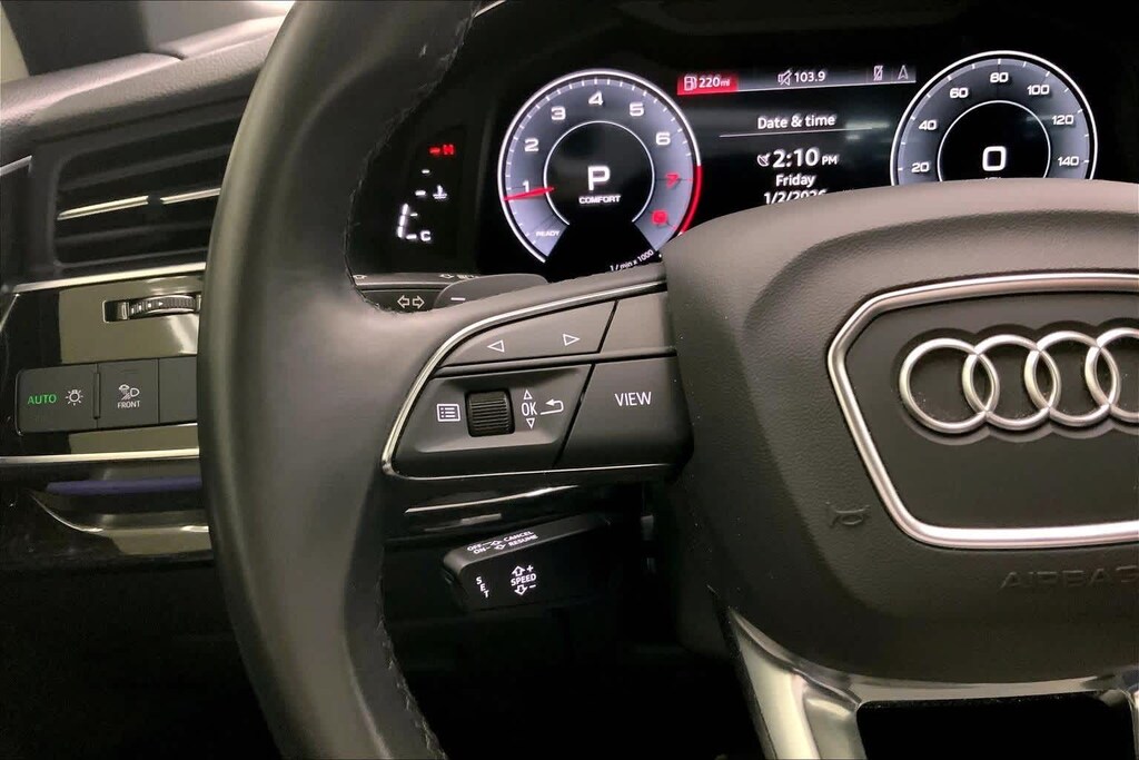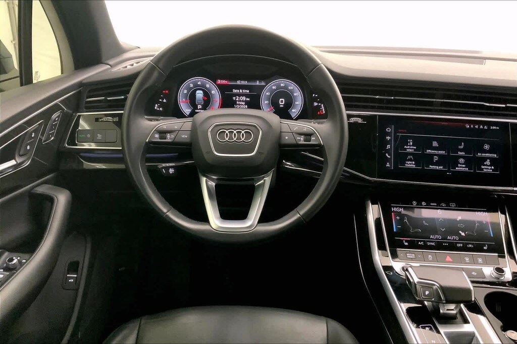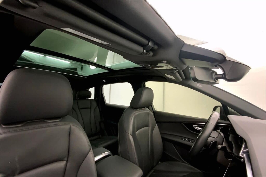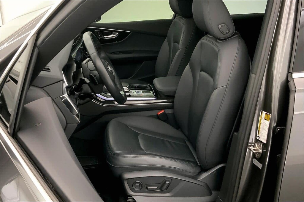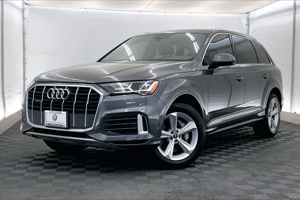 Gray Metallic 2021 Audi Q7 45 Premium quattro quattro 8-Speed Automatic with Tiptronic 2.0L 4-Cylinder TFSI 10 Speakers, 3-Spoke Multifunction Steering Wheel w/Paddles, 3.76 Axle Ratio, 3rd row seats: bench, 4-Wheel Disc Brakes, ABS brakes, Air Conditioning, Alloy wheels, AM/FM radio: SiriusXM, Ambient Interior Lighting Package, Audi Guard Protection Kit, Audi Phone Box w/Wireless Charging, Audi smartphone interface (Apple CarPlay/Android Auto), Auto High-beam Headlights, Auto-dimming Rear-View mirror, Automatic temperature control, Black Cloth Headliner, Brake assist, Bumpers: body-color, Compass, Convenience Package, Delay-off headlights, Driver door bin, Driver vanity mirror, Dual front impact airbags, Dual front side impact airbags, Electronic Stability Control, Emergency communication system: Audi connect CARE, PRIME & PLUS, Exterior Parking Camera Rear, Four wheel independent suspension, Front & Rear Doors Audi Beam-Rings, Front anti-roll bar, Front Bucket Seats, Front Center Armrest, Front dual zone A/C, Front fog lights, Front reading lights, Fully automatic headlights, Garage door transmitter: HomeLink, Genuine wood door panel insert, Heated Auto-Dimming Power Folding Exterior Mirrors, Heated door mirrors, Heated Front Bucket Seats, Heated front seats, Illuminated entry, Leather Seating Surfaces, Leather Shift Knob, Leather steering wheel, Low tire pressure warning, Memory seat, Navigation system: Audi MMI Navigation plus with Touch Response, Occupant sensing airbag, Outside temperature display, Overhead airbag, Overhead console, Panic alarm, Passenger door bin, Passenger vanity mirror, Power door mirrors, Power driver seat, Power Liftgate, Power moonroof, Power passenger seat, Power steering, Power windows, Privacy Trunk Cover, Radio data system, Radio: Audi Sound System, Rain sensing wipers, Rear air conditioning, Rear anti-roll bar, Rear fog lights, Rear reading lights, Rear seat center armrest, Rear window defroster, Rear window wiper, Reclining 3rd row seat, Remote keyless entry, Roof rack: rails only, Security system, Speed control, Speed-sensing steering, Split folding rear seat, Spoiler, Steering wheel memory, Steering wheel mounted audio controls, Tachometer, Telescoping steering wheel, Tilt steering wheel, Topview Camera System, Traction control, Trip computer, Turn signal indicator mirrors, USB Cables, Variably intermittent wipers, Wheels: 19 5-Arm-Star Design.