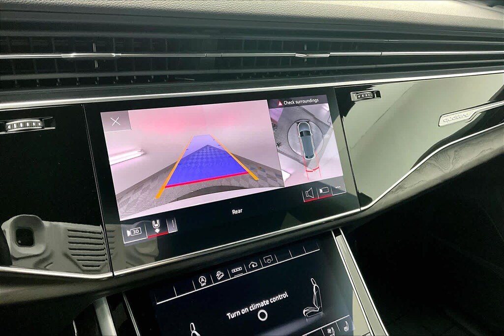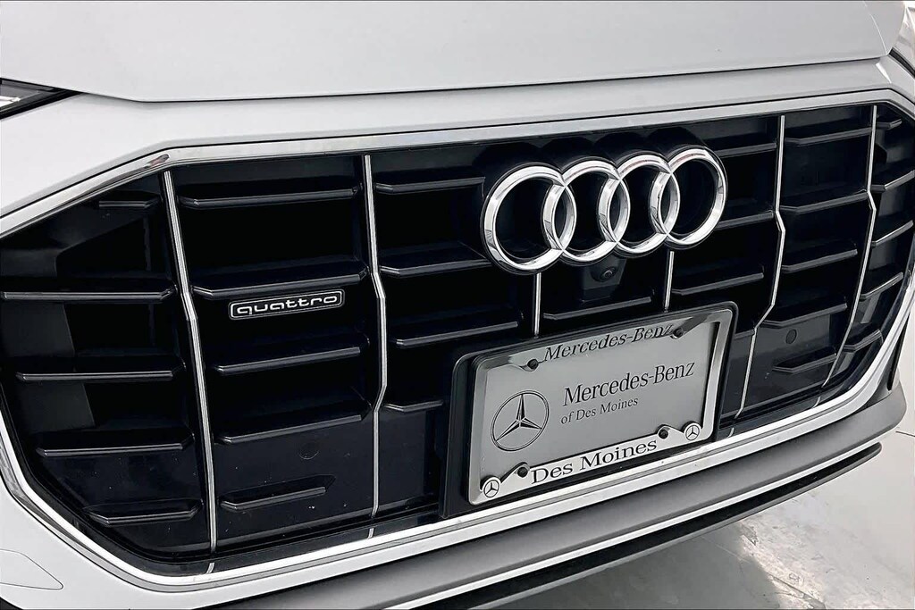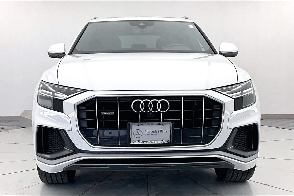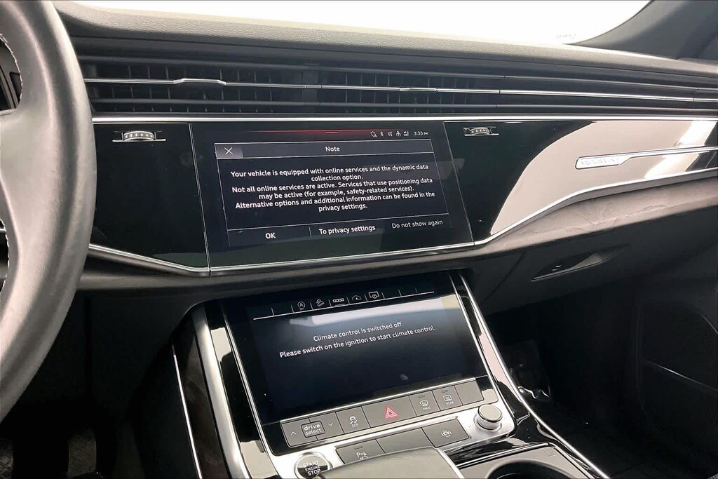 Contour/Ambient LED Interior Lighting Package, Convenience Package (Audi Phone Box w/Wireless Charging, Heated 3-Spoke Multifunction Steering Wheel, Heated Auto-Dimming Power Folding Exterior Mirrors, and Top View Camera System), Premium Plus Package (21 5-Segment-Spoke-Design Wheels, 4-Zone Climate Control, Bang & Olufsen 3D Premium Sound System, Driver & Passenger Front Seats w/Ventilation, and Illuminated Door Sills), S line Style Package (S line Fender Badges, S line Illuminated Door Sills, and Wheels: 21 5-W-Spoke-Design), S-Line Exterior Package (S line Front & Rear Bumpers and S line Side Sills), Q8 55 Premium Plus quattro, Glacier White, Navigation system: Audi MMI Navigation plus with Touch Response, 10 Speakers, 4-Wheel Disc Brakes, ABS brakes, Adaptive suspension, Air Conditioning, Alloy wheels, AM/FM radio: SiriusXM, Audi Guard Protection Kit, Audi Guard Wheel Lock Kit, Audi smartphone interface (Apple CarPlay/Android Auto), Auto High-beam Headlights, Auto-dimming Rear-View mirror, Automatic temperature control, Axle Ratio: TBD, Black Cloth Headliner, Brake assist, Bumpers: body-color, Compass, Delay-off headlights, Driver door bin, Driver vanity mirror, Dual front impact airbags, Dual front side impact airbags, Electronic Stability Control, Emergency communication system: Audi connect CARE, PRIME & PLUS, Exterior Parking Camera Rear, Four wheel independent suspension, Front anti-roll bar, Front Bucket Seats, Front Center Armrest, Front dual zone A/C, Front fog lights, Front reading lights, Fully automatic headlights, Garage door transmitter: HomeLink, Genuine wood door panel insert, Heated door mirrors, Heated Front Bucket Seats, Heated front seats, Illuminated entry, Leather Seating Surfaces, Leather Shift Knob, Leather steering wheel, Low tire pressure warning, Memory seat, Occupant sensing airbag, Outside temperature display, Overhead airbag, Overhead console, Panic alarm, Passenger door bin, Passenger vanity mirror, Power door mirrors, Power driver seat, Power Liftgate, Power moonroof, Power passenger seat, Power steering, Power windows, Radio data system, Radio: Audi MMI Navigation Plus w/Touch Response, Rain sensing wipers, Rear air conditioning, Rear anti-roll bar, Rear fog lights, Rear reading lights, Rear seat center armrest, Rear window defroster, Rear window wiper, Remote keyless entry, Roof rack: rails only, Security system, Speed control, Speed-sensing steering, Split folding rear seat, Spoiler, Steering wheel memory, Steering wheel mounted audio controls, Tachometer, Telescoping steering wheel, Tilt steering wheel, Traction control, Trip computer, Turn signal indicator mirrors, Variably intermittent wipers, and Wheels: 20 5-Arm Design. Local Trade, Q8 55 Premium Plus quattro, Glacier White, 21 5-Segment-Spoke-Design Wheels, 4-Zone Climate Control, Audi Phone Box w/Wireless Charging, Bang & Olufsen 3D Premium Sound System, Contour/Ambient LED Interior Lighting Package, Convenience Package, Driver & Passenger Front Seats w/Ventilation, Heated 3-Spoke Multifunction Steering Wheel, Heated Auto-Dimming Power Folding Exterior Mirrors, Illuminated Door Sills, Navigation system: Audi MMI Navigatio