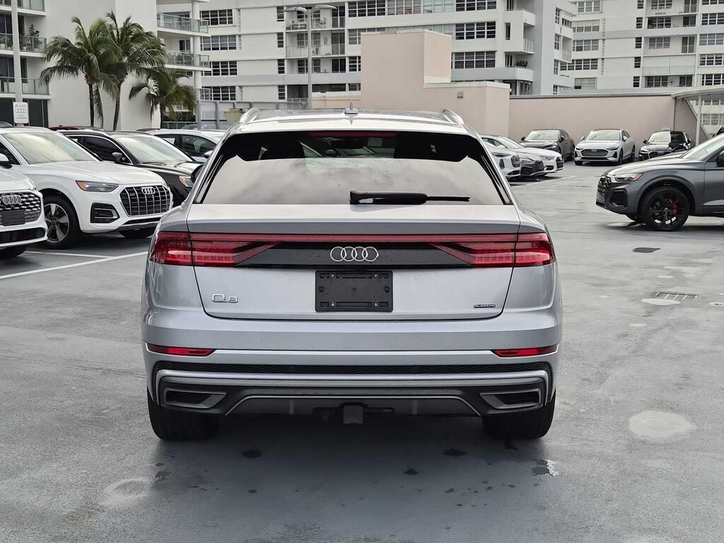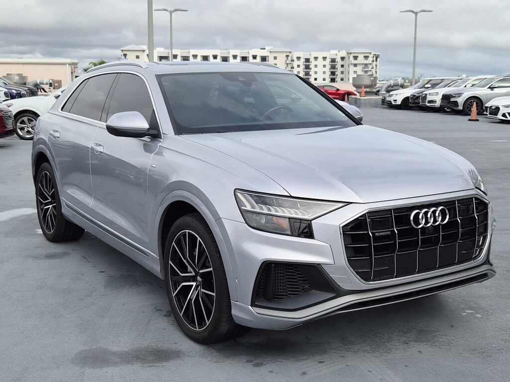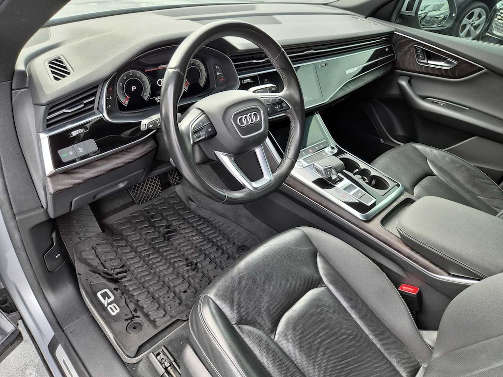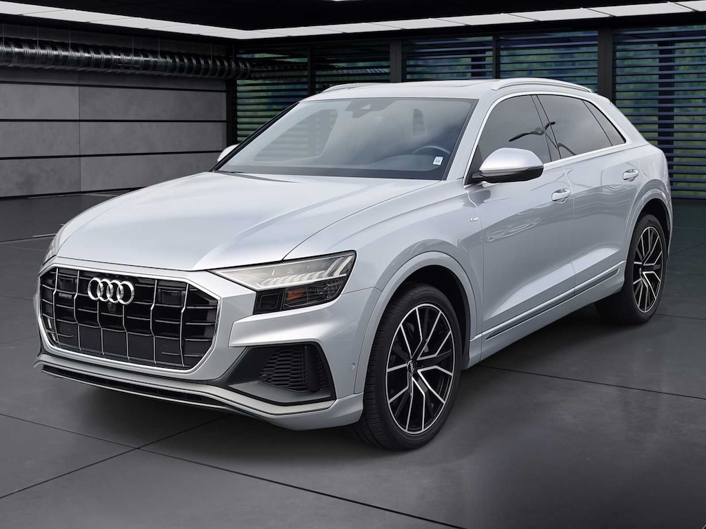 Clean CARFAX. Q8 Florett Silver Metallic 55 Premium Plus quattro 8-Speed Automatic with Tiptronic 3.0L V6 Turbocharged DOHC 24V LEV3-ULEV70 335hp Q8 55 Premium Plus quattro, 3.0L V6 Turbocharged DOHC 24V LEV3-ULEV70 335hp, Florett Silver Metallic, Black w/Rock Gray Contrast Stitching w/Leather Seating Surfaces, 21 5-Segment-Spoke-Design Wheels, 4-Zone Climate Control, Audi Active Lane Departure Warning, Audi Adaptive Cruise Assist, Bang & Olufsen 3D Premium Sound System, Contour/Ambient LED Interior Lighting Package, Convenience Package, Driver & Passenger Front Seats w/Ventilation, Executive Package, HD Matrix-Design LED Headlights, Heated Front Bucket Seats, Heated front seats, Heated Rear Seats, Illuminated Door Sills, LED DRL & Taillights, Navigation system: Audi MMI Navigation plus with Touch Response, Power Liftgate, Power moonroof, Premium Plus Package, S line Fender Badges, S line Illuminated Door Sills, S line Style Package, S-Line Exterior Package, Towing 7 Pin Connector, Towing Package, Wheels: 21 5-W-Spoke-Design.