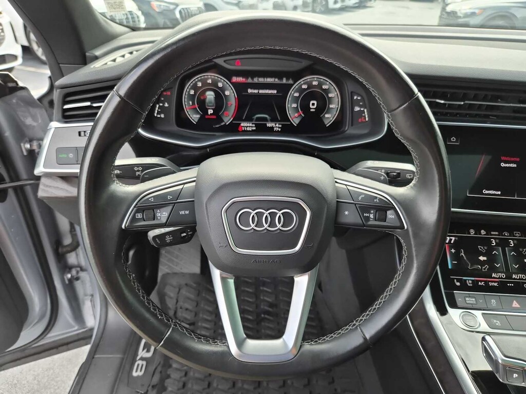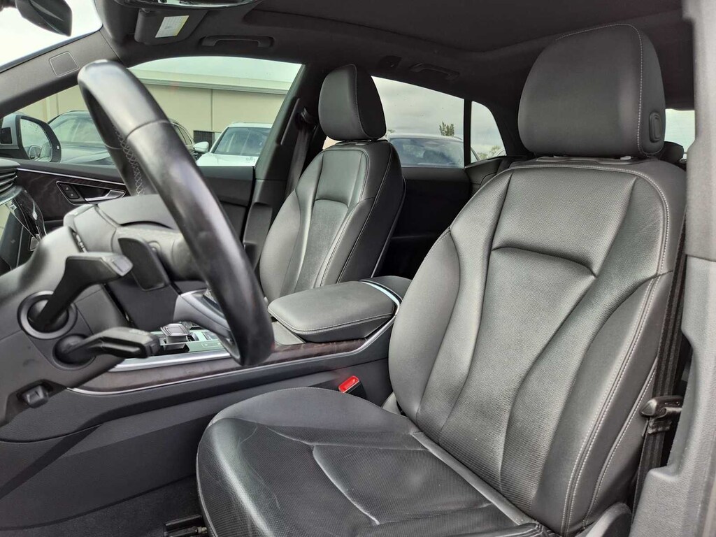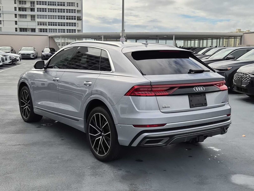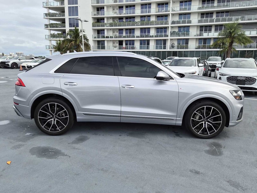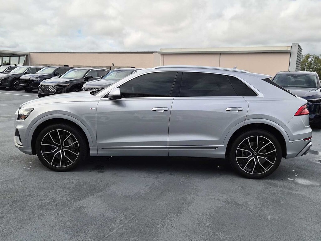 Clean CARFAX. Q8 Florett Silver Metallic 55 Premium Plus quattro 8-Speed Automatic with Tiptronic 3.0L V6 Turbocharged DOHC 24V LEV3-ULEV70 335hp Q8 55 Premium Plus quattro, 3.0L V6 Turbocharged DOHC 24V LEV3-ULEV70 335hp, Florett Silver Metallic, Black w/Rock Gray Contrast Stitching w/Leather Seating Surfaces, 21 5-Segment-Spoke-Design Wheels, 4-Zone Climate Control, Audi Active Lane Departure Warning, Audi Adaptive Cruise Assist, Bang & Olufsen 3D Premium Sound System, Contour/Ambient LED Interior Lighting Package, Convenience Package, Driver & Passenger Front Seats w/Ventilation, Executive Package, HD Matrix-Design LED Headlights, Heated Front Bucket Seats, Heated front seats, Heated Rear Seats, Illuminated Door Sills, LED DRL & Taillights, Navigation system: Audi MMI Navigation plus with Touch Response, Power Liftgate, Power moonroof, Premium Plus Package, S line Fender Badges, S line Illuminated Door Sills, S line Style Package, S-Line Exterior Package, Towing 7 Pin Connector, Towing Package, Wheels: 21 5-W-Spoke-Design.