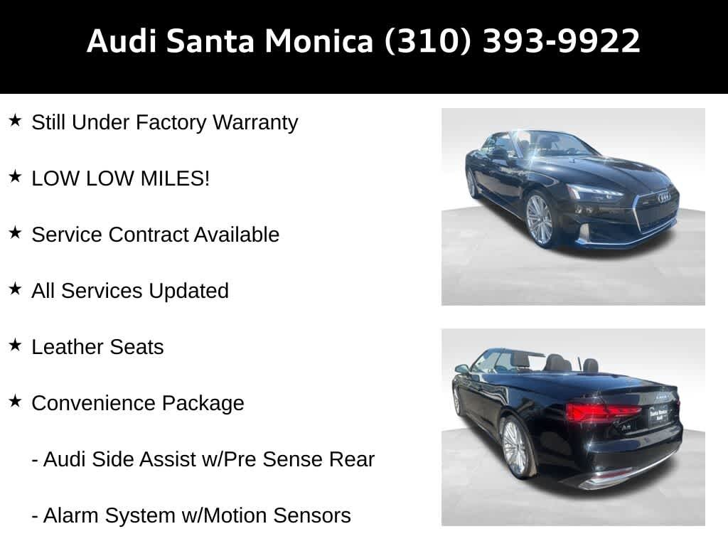2022 Audi A5 45 Premium Plus quattro Brilliant Black/Black Roof quattro Still Under Factory Warranty, LOW LOW MILES!, Service Contract Available, All Services Updated, Leather Seats, A5 45 Premium Plus quattro, 2D Convertible, 2.0L 4-Cylinder TFSI, 7-Speed Automatic S tronic, quattro, Brilliant Black/Black Roof, Black w/Leather Seating Surfaces, 10 Speakers, Adaptive Cruise Control w/Traffic Jam Assist, Alarm System w/Motion Sensors, Alloy wheels, AM/FM radio, Audi Active Lane Assist, Audi Advanced Key, Audi Phone Box, Audi Side Assist w/Pre Sense Rear, Audi Virtual Cockpit Plus, Auto-Dimming Exterior Mirrors w/Memory, Convenience Package, Driver Seat Memory, Hands-On Detection Steering Wheel, Heated Front Bucket Seats, Heated front seats, Heated Steering Wheel, Leather Seating Surfaces, Leatherette Covered Center Console & Door Armrests, Matrix-Design LED Headlights, Parking System Plus (Front/Rear Acoustic Sensors), Power Folding Exterior Mirrors, Power passenger seat, Premium Plus, Radio data system, Radio: Audi Sound System, SiriusXM All Access Service, Top View Camera System, Wheels: 18 5-V-Spoke-Y Design. Clean CARFAX. CARFAX One-Owner.