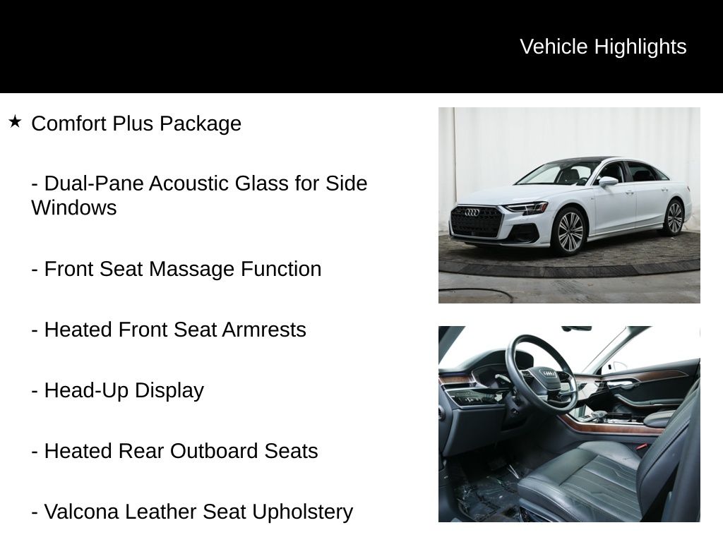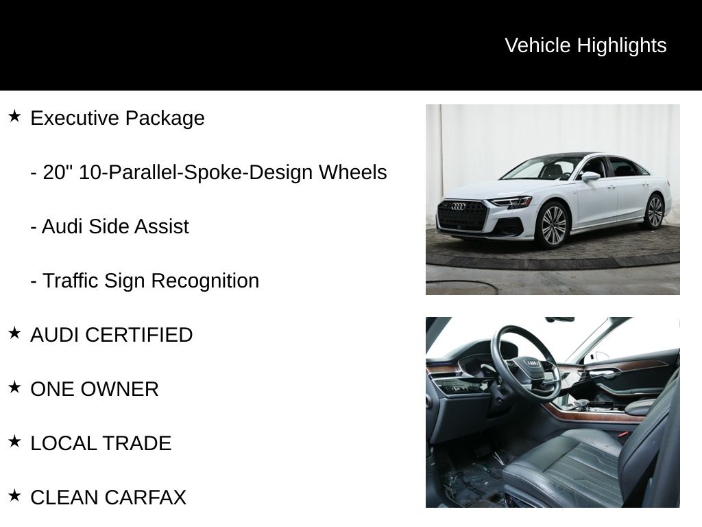Certified. CARFAX One-Owner. AUDI CERTIFIED, ONE OWNER, LOCAL TRADE, CLEAN CARFAX, STILL UNDER FACTORY WARRANTY, QUATTRO, ALL WHEEL DRIVE, REAR VIEW CAMERA, TOP VIEW CAMERA SYSTEM, BANG & OLUFSEN SOUND, NAVIGATION SYSTEM, BLUETOOTH, SUN ROOF, LEATHER SEATS, HEATED FRONT SEATS, HEATED REAR SEATS, VENTILATED SEATS, HEATED STEERING WHEEL, HEAD UP DISPLAY, ADAPTIVE CRUISE CONTROL, ACTIVE LANE ASSIST, LANE DEPARTURE WARNING, AUDI SIDE ASSIST, BLIND SPOT MONITOR, Black w/Valetta Leather Seat Upholstery or Valcona Leather Seat Upholstery, 20" 10-Parallel-Spoke-Design Wheels, Alu-Optic Buttons, Audi Adaptive Cruise Assist w/Lane Guidance, Audi Side Assist, Comfort Plus Package, Contour/Ambient LED Interior Lighting Package, Dual-Pane Acoustic Glass for Side Windows, Dynamic All-Wheel-Steering, Executive Package, Extended Leather Package, Front Seat Massage Function, Head-Up Display, Heated Front Seat Armrests, Heated Rear Outboard Seats, Heated Rear Seat Armrests, Heated Steering Wheel, Intersection Assist, Luxury Package, Power Rear Outboard Seats w/Lumbar & Memory, Rear Matrix LED Reading Lights, Rear Outboard Seat Ventilation w/Massage, Rear Seat Remote Control, Traffic Sign Recognition, Valcona Leather Seat Upholstery.