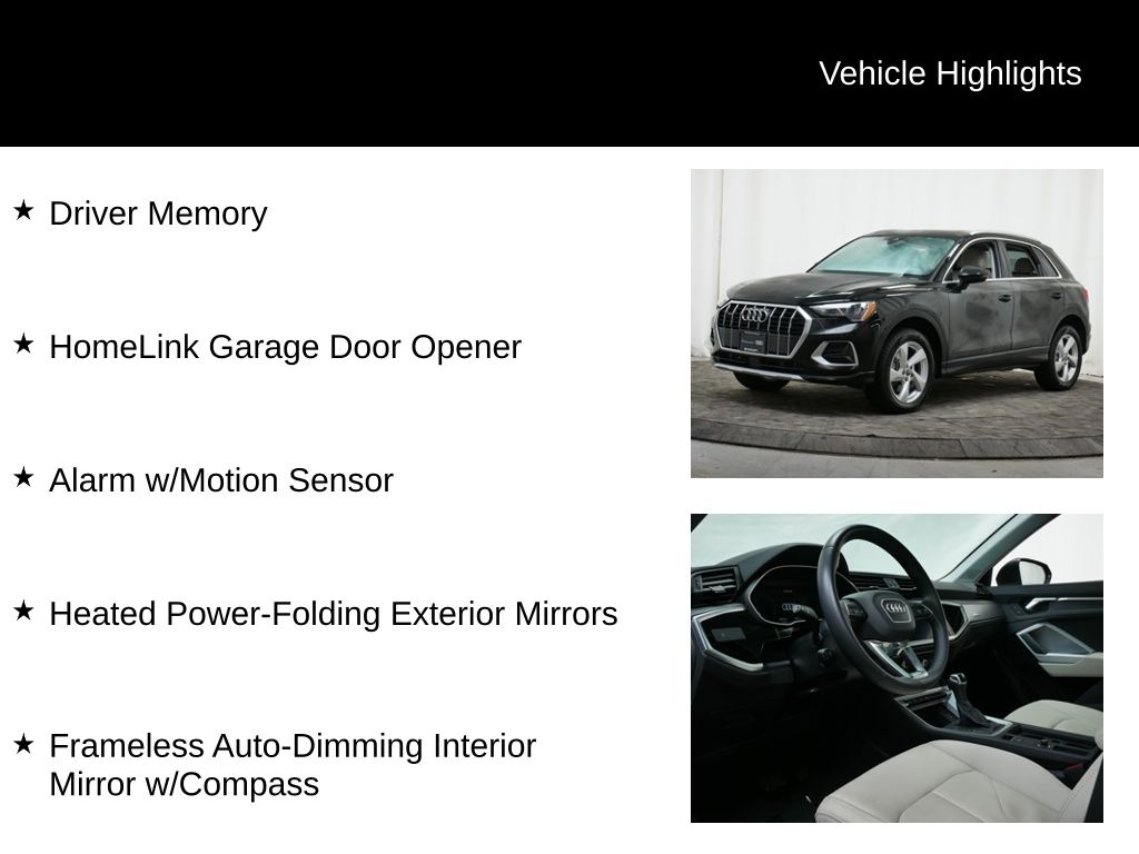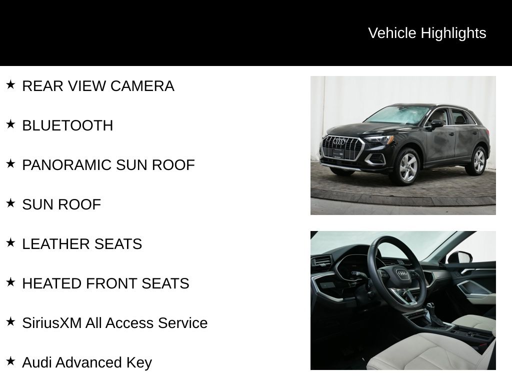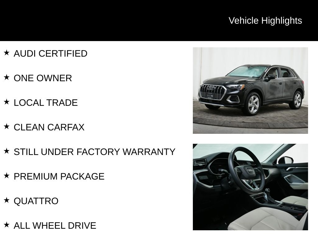 As an Audi Certified pre-owned vehicle, this Q3 has undergone a rigorous 125+ point inspection and comes with a comprehensive warranty, roadside assistance, and a $0 deductible. With a clean CARFAX and still under the original factory warranty, this is an exceptional opportunity to own a premium SUV with confidence.