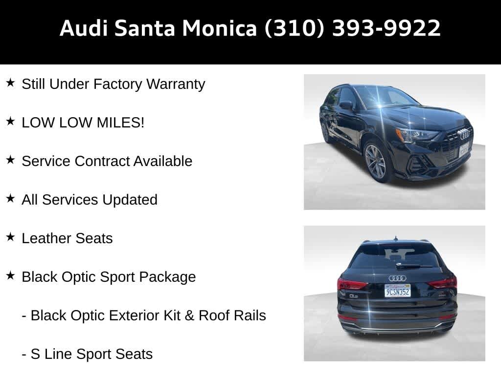 2022 Audi Q3 Premium S Line quattro Mythos Black Metallic S Line quattro Still Under Factory Warranty, LOW LOW MILES!, Service Contract Available, All Services Updated, Leather Seats, Q3 Premium S Line quattro, 4D Sport Utility, 2.0L 4-Cylinder TFSI, 8-Speed Automatic with Tiptronic, quattro, Mythos Black Metallic, Black w/Leather Seating Surfaces, Alloy wheels, Black Optic Exterior Kit & Roof Rails, Black Optic Sport Package, Brake assist, Delay-off headlights, Electronic Stability Control, Front Center Armrest, Front fog lights, Front reading lights, Heated Front Bucket Seats, Heated front seats, Illuminated entry, Power door mirrors, Power passenger seat, S Line Sport Seats, Spoiler, Wheels: 19 5-Double-Arm Design Bi-Color Finish. Clean CARFAX. CARFAX One-Owner.